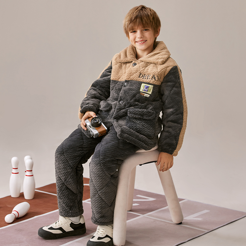 芬腾男童睡衣冬季珊瑚绒夹棉三层加厚套装儿童男孩加绒保暖家居服