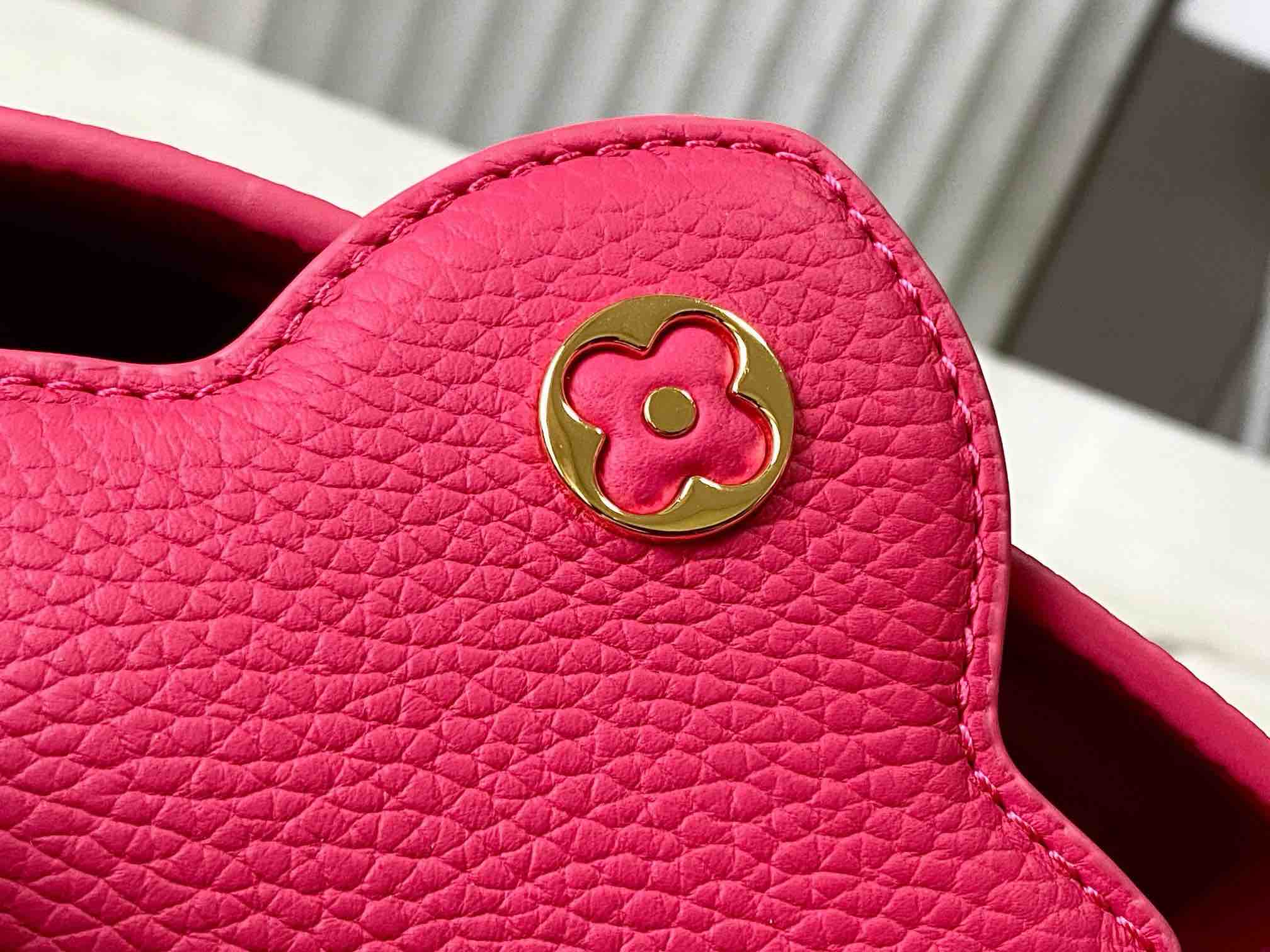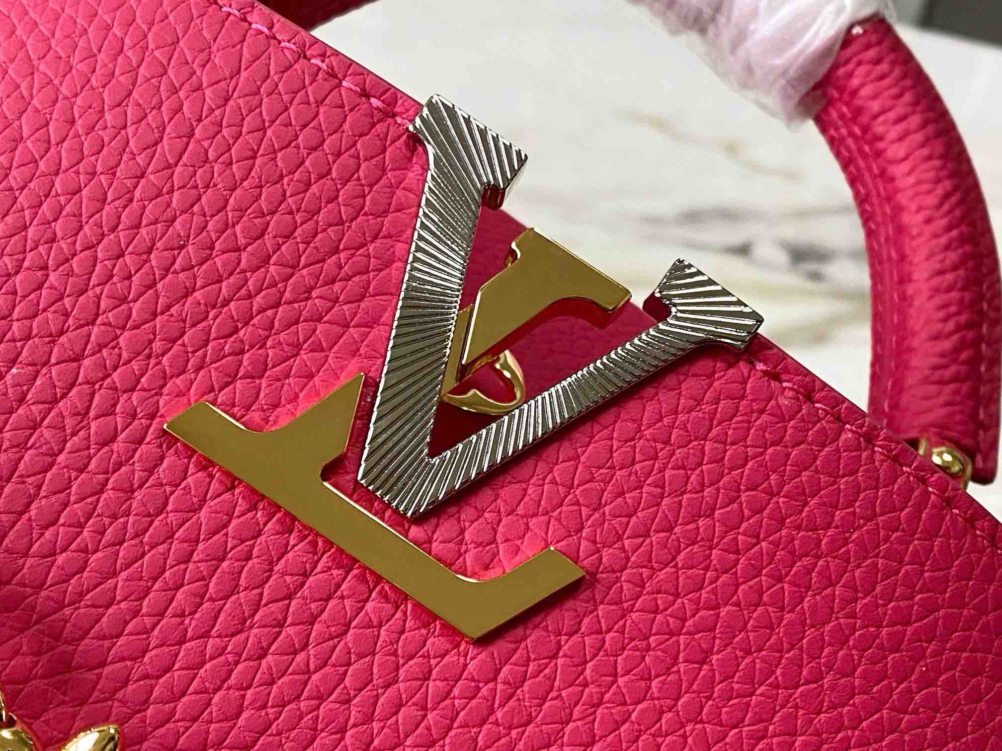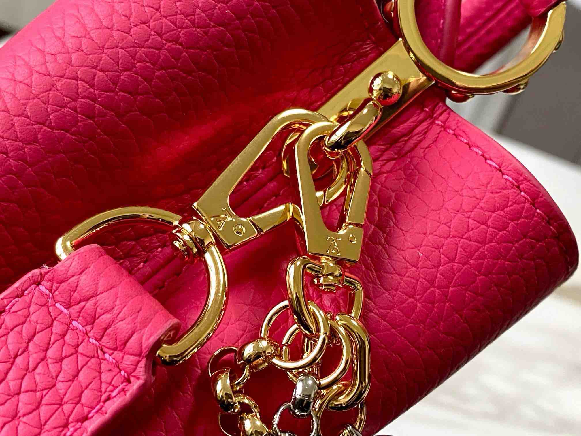 秋冬特惠💰1630 渠道级LV 新品 te级LV 动态芯片 M26507/M48865紫玫红光线链条款 这款Capucines采用引人注目的、精致的宝石色调版本装饰有品牌的双镀锌Infinity链条 采用Taurillon皮革制成 饰有标志性的Monogram花卉图案 以及LV首字母标识 这些标识经过独特的放射状效果处理 这种双重携带风格包括一个内部的扁平口袋 且有多种佩戴方式 Size : 21 * 14 * 8 CM