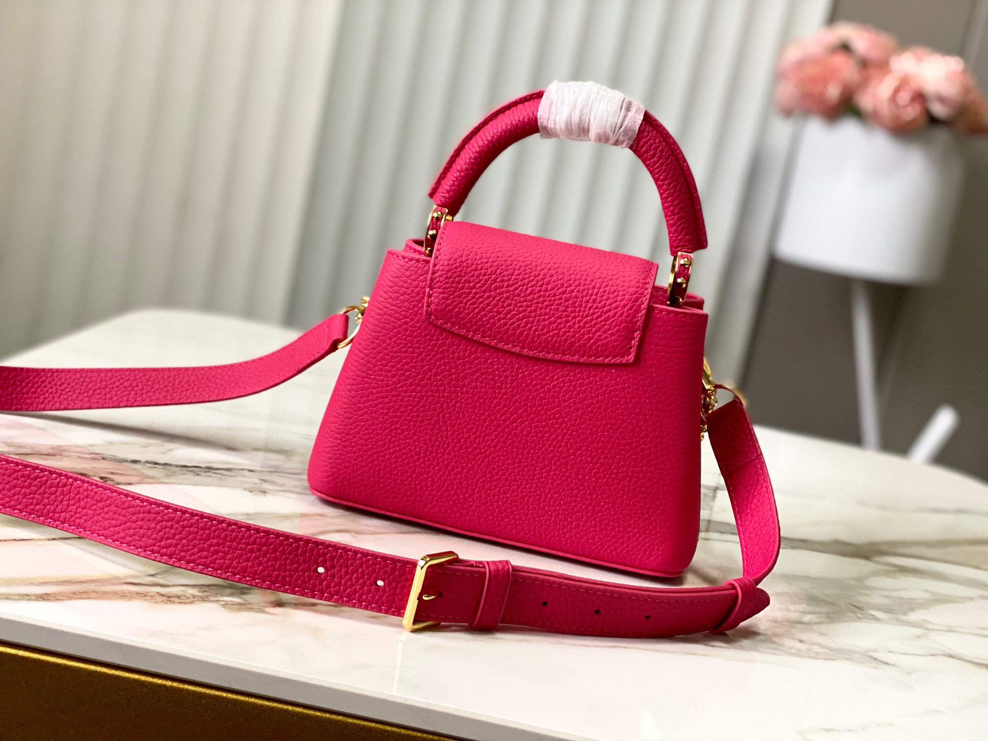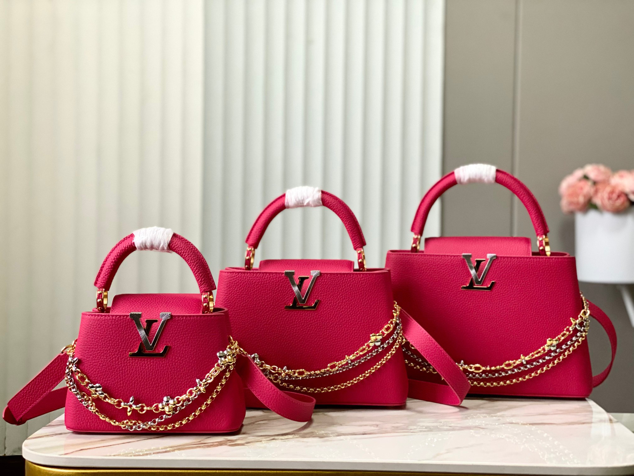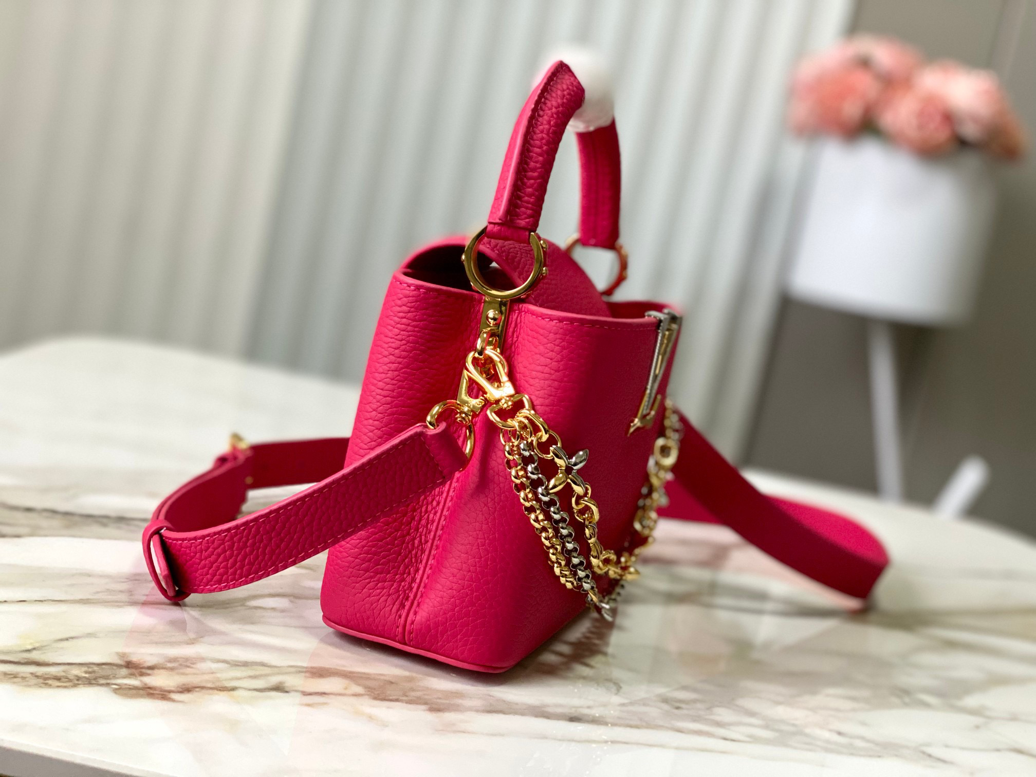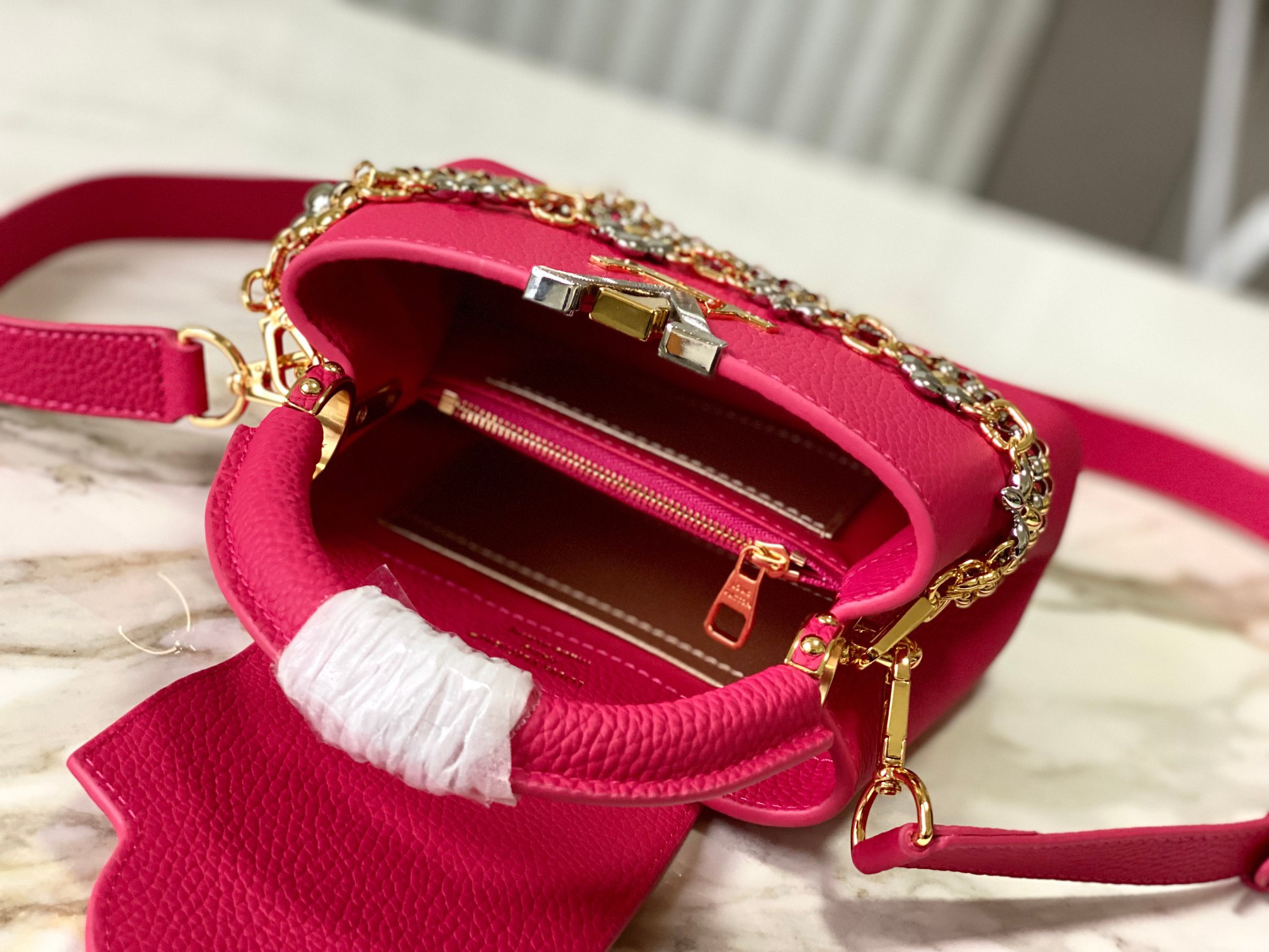 秋冬特惠💰1630 渠道级LV 新品 te级LV 动态芯片 M26507/M48865紫玫红光线链条款 这款Capucines采用引人注目的、精致的宝石色调版本装饰有品牌的双镀锌Infinity链条 采用Taurillon皮革制成 饰有标志性的Monogram花卉图案 以及LV首字母标识 这些标识经过独特的放射状效果处理 这种双重携带风格包括一个内部的扁平口袋 且有多种佩戴方式 Size : 21 * 14 * 8 CM