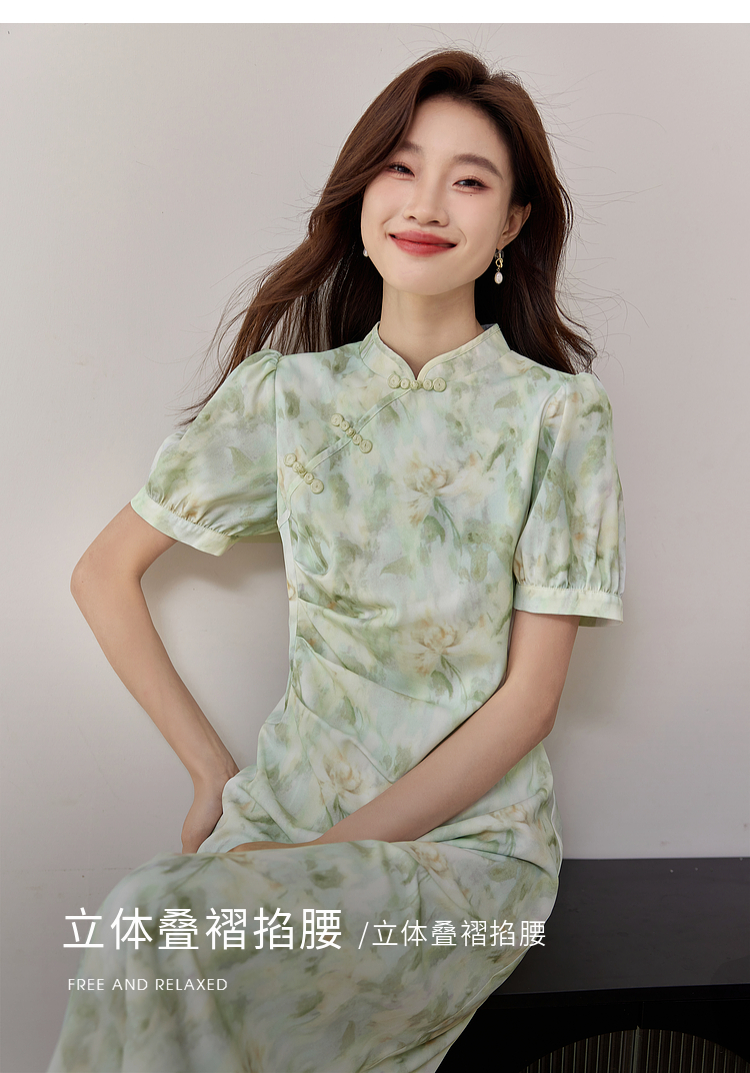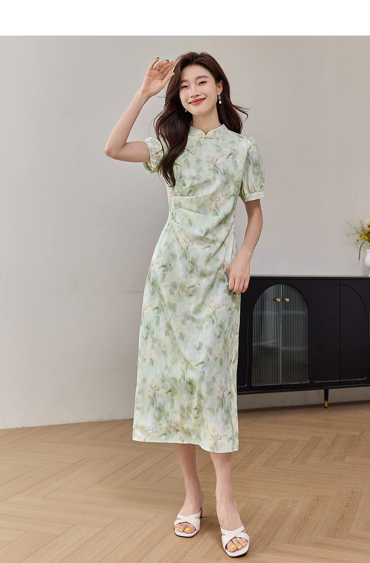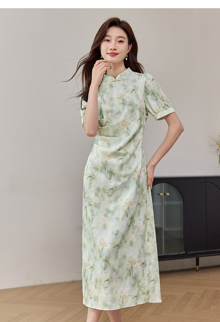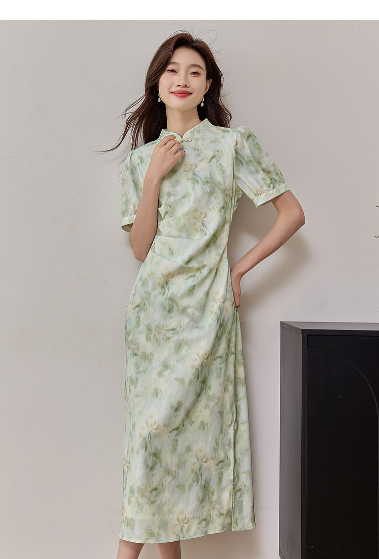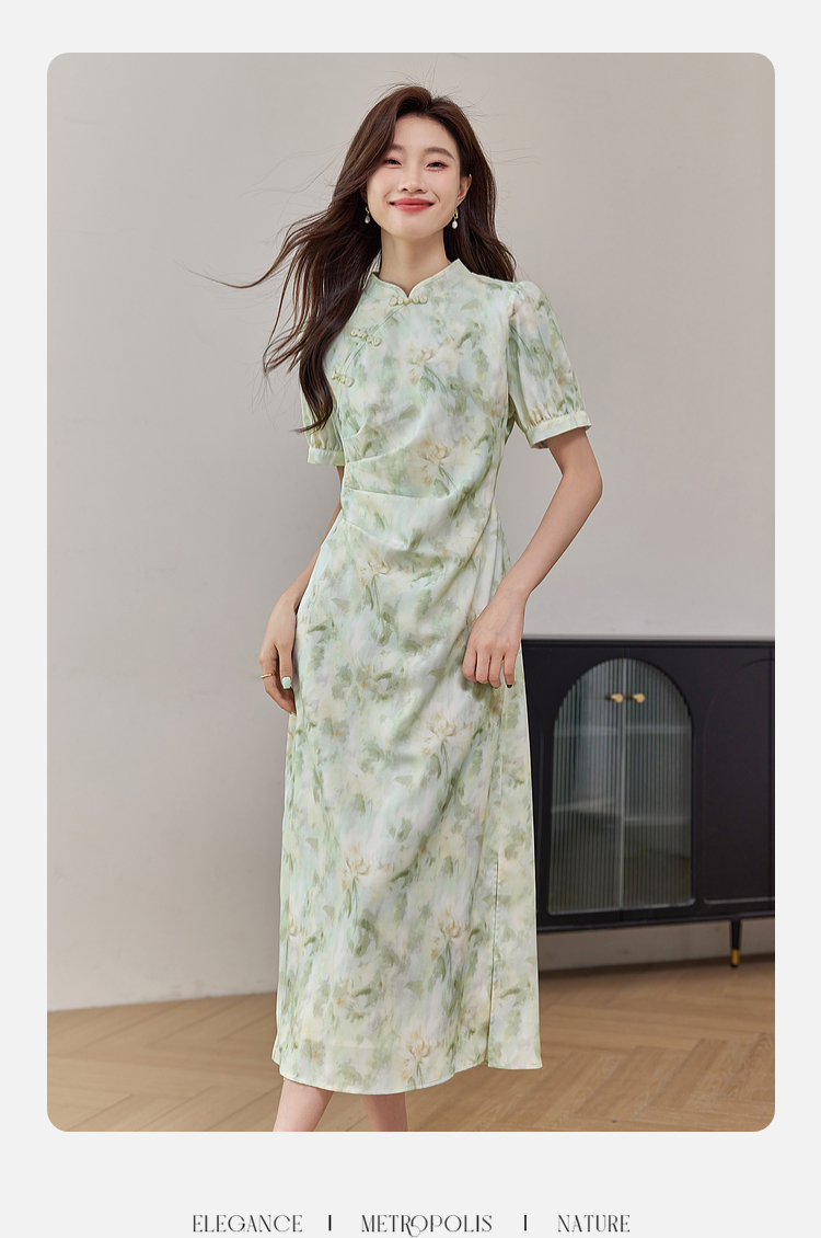 【专属特价】熙世界新中式改良旗袍裙夏季国风盘扣立领印花连衣裙开叉长裙子