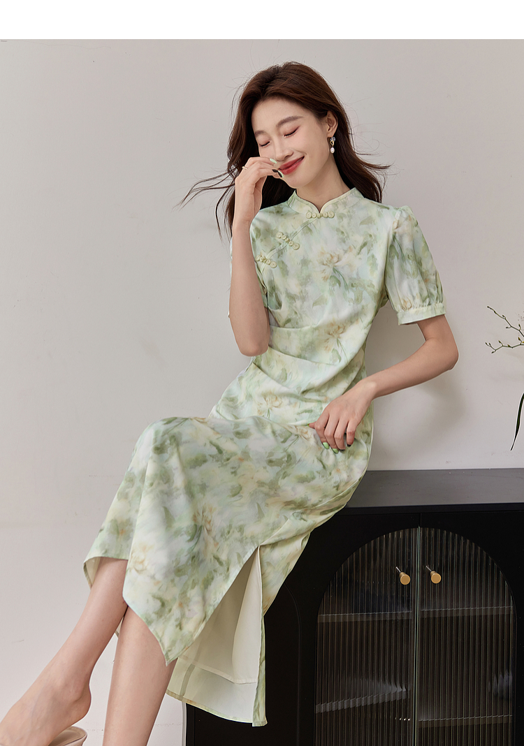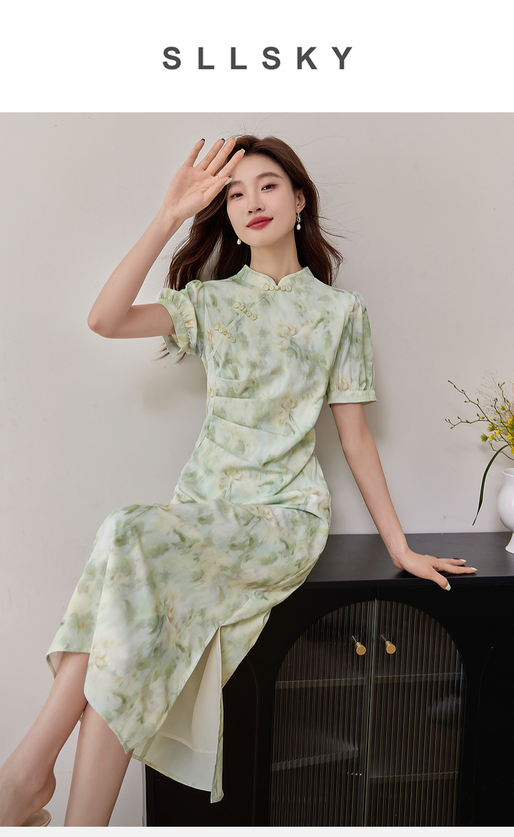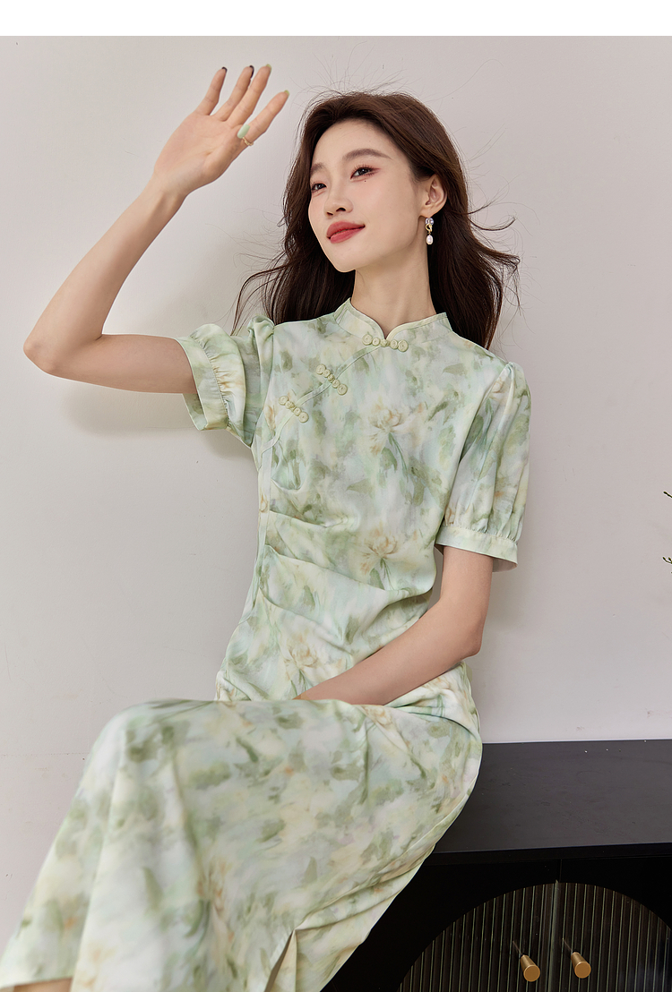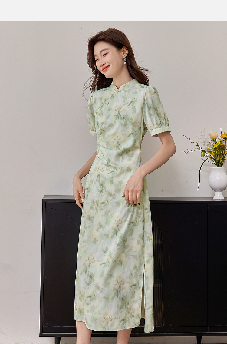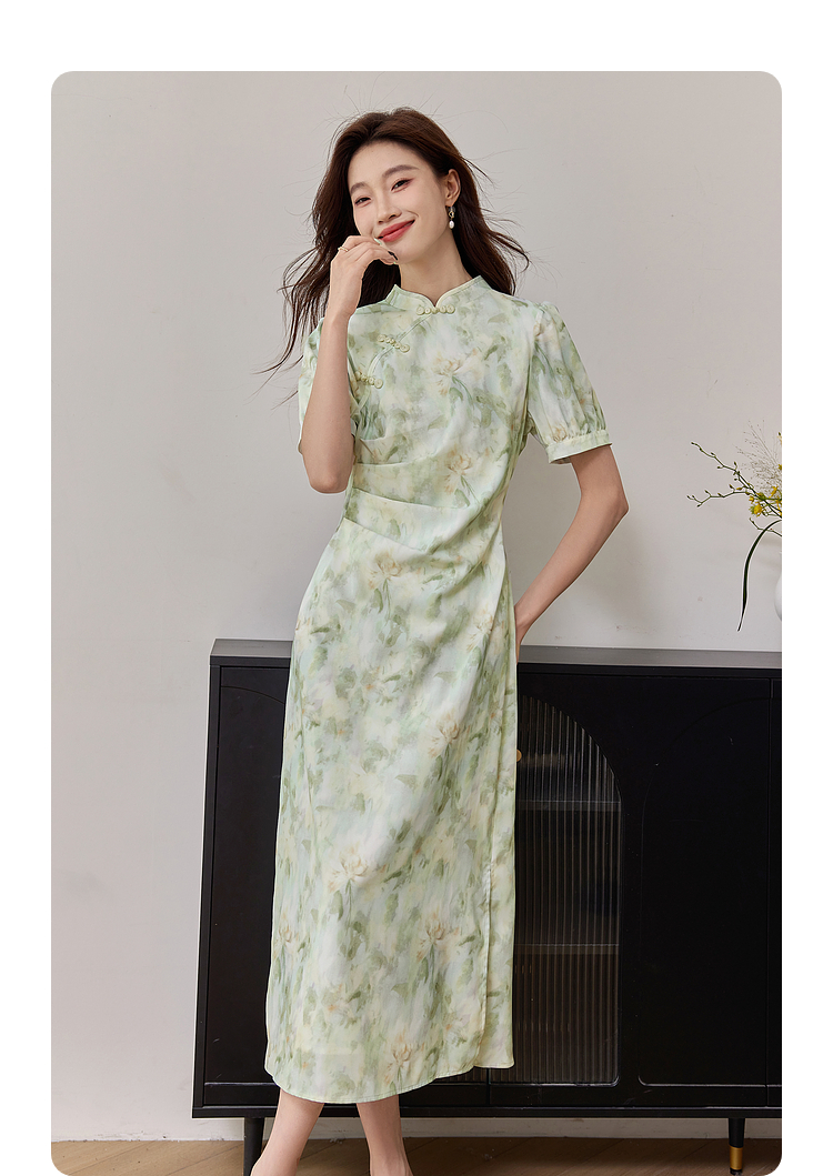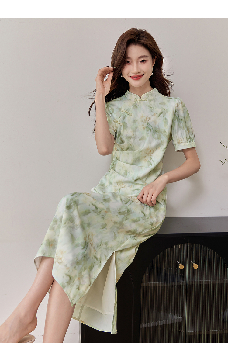 【专属特价】熙世界新中式改良旗袍裙夏季国风盘扣立领印花连衣裙开叉长裙子