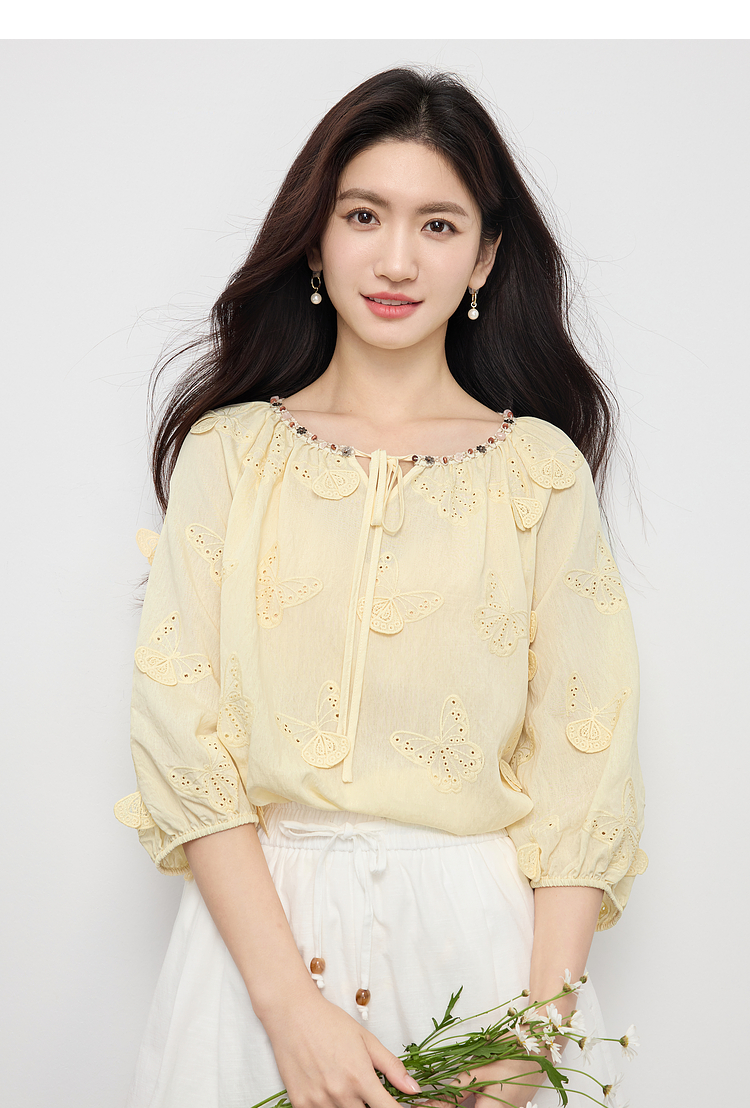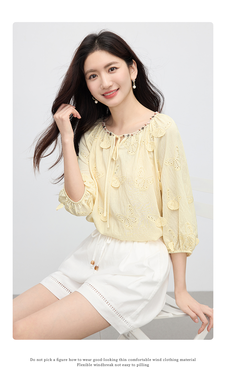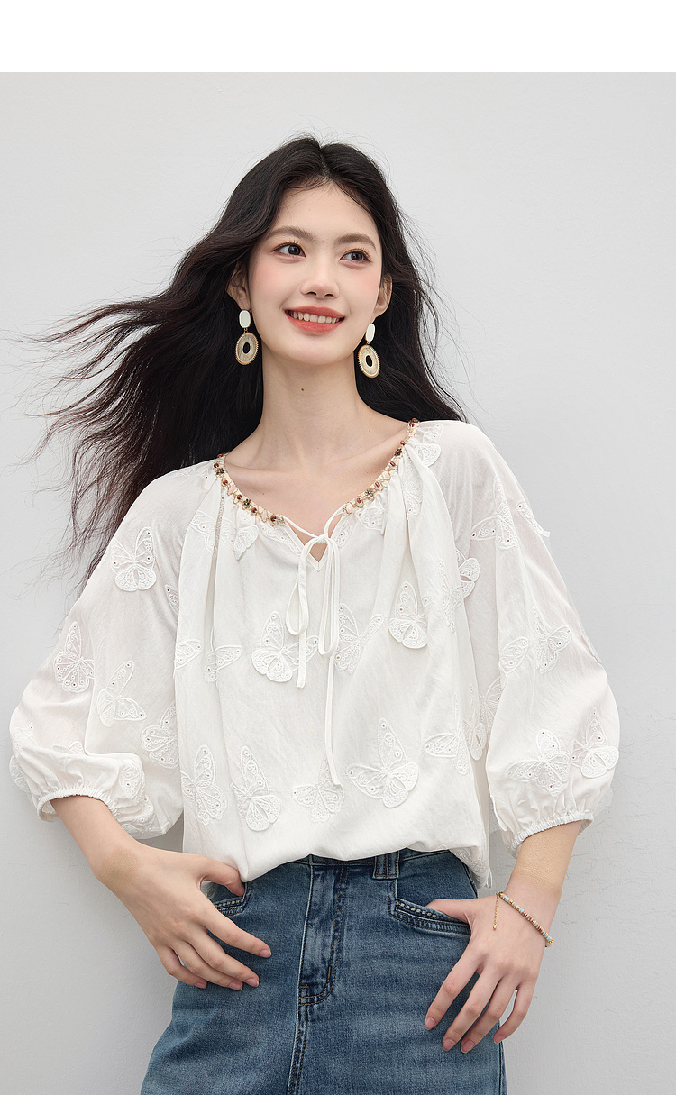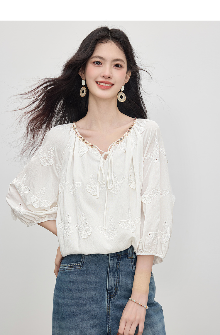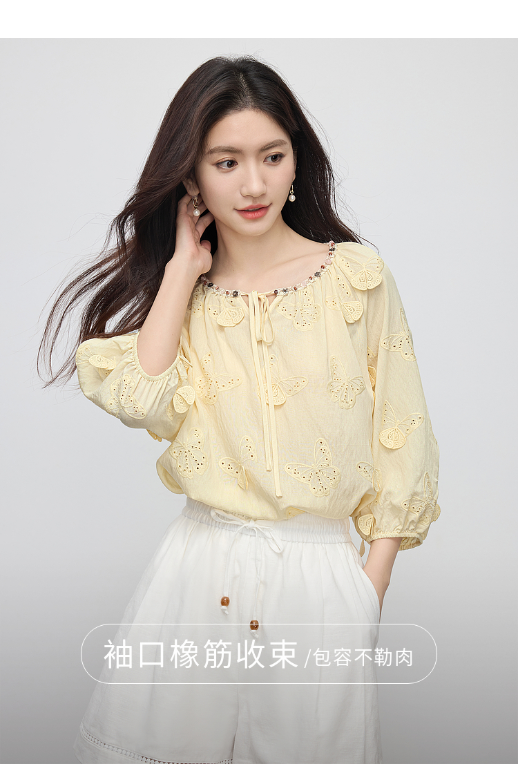 【周四狂欢价】熙世界轻民族风立体蝴蝶刺绣衬衫女2025初秋新款设计感七分袖上衣