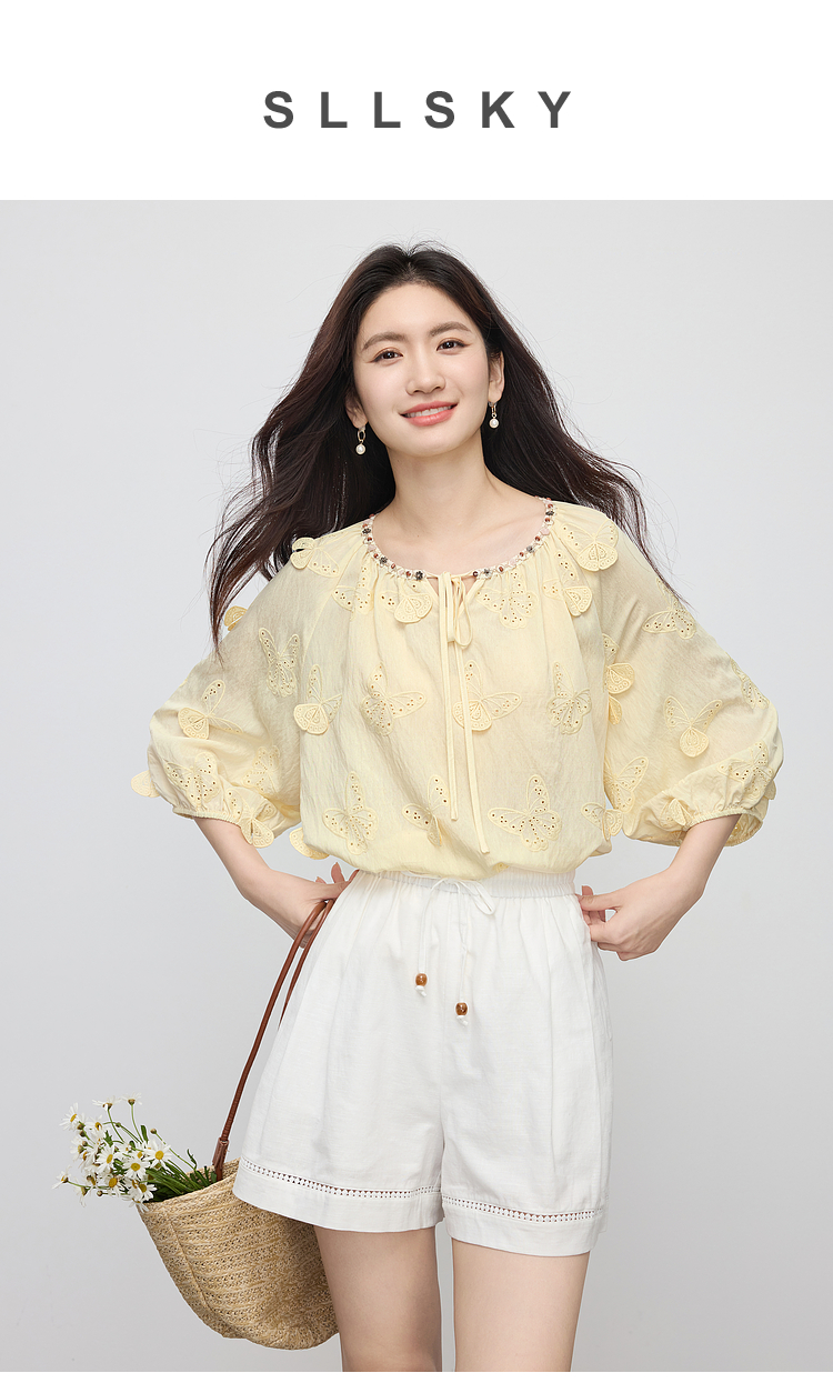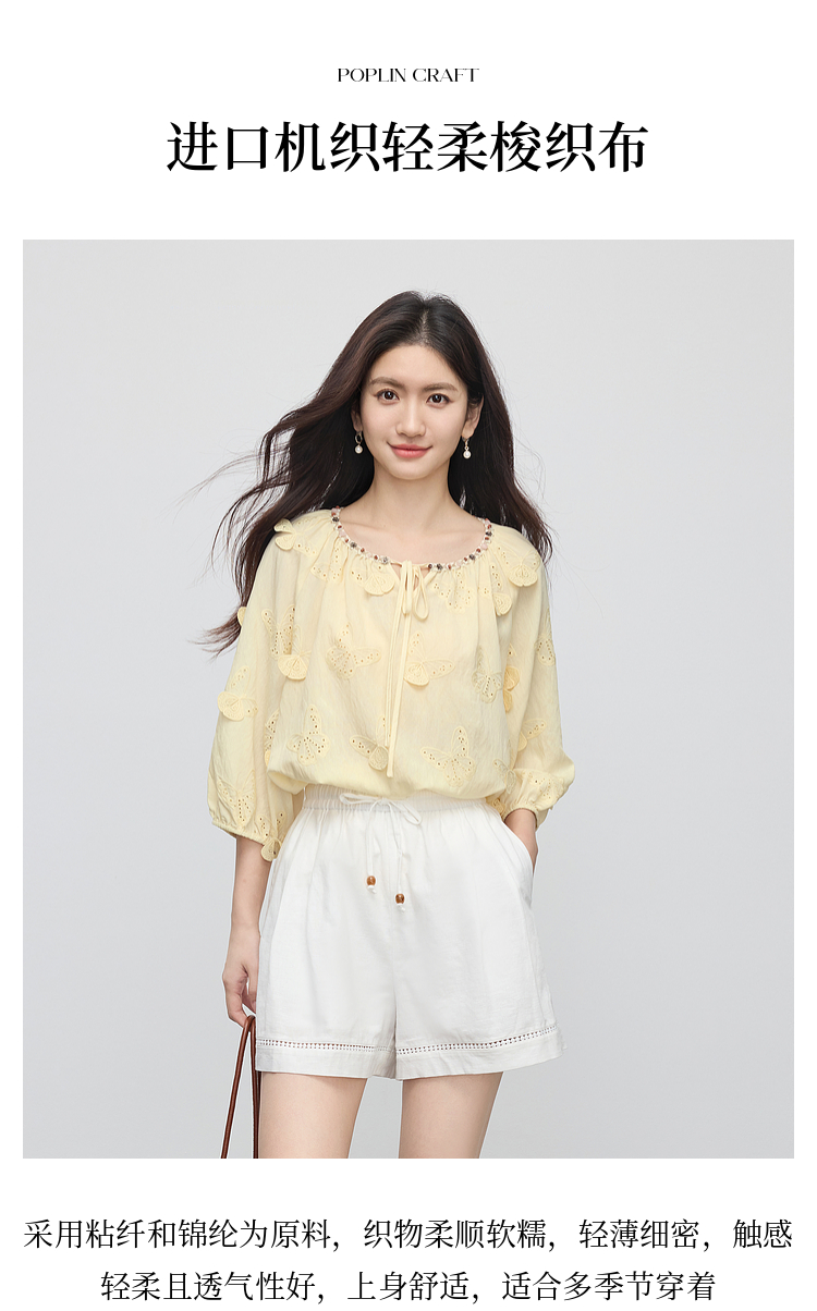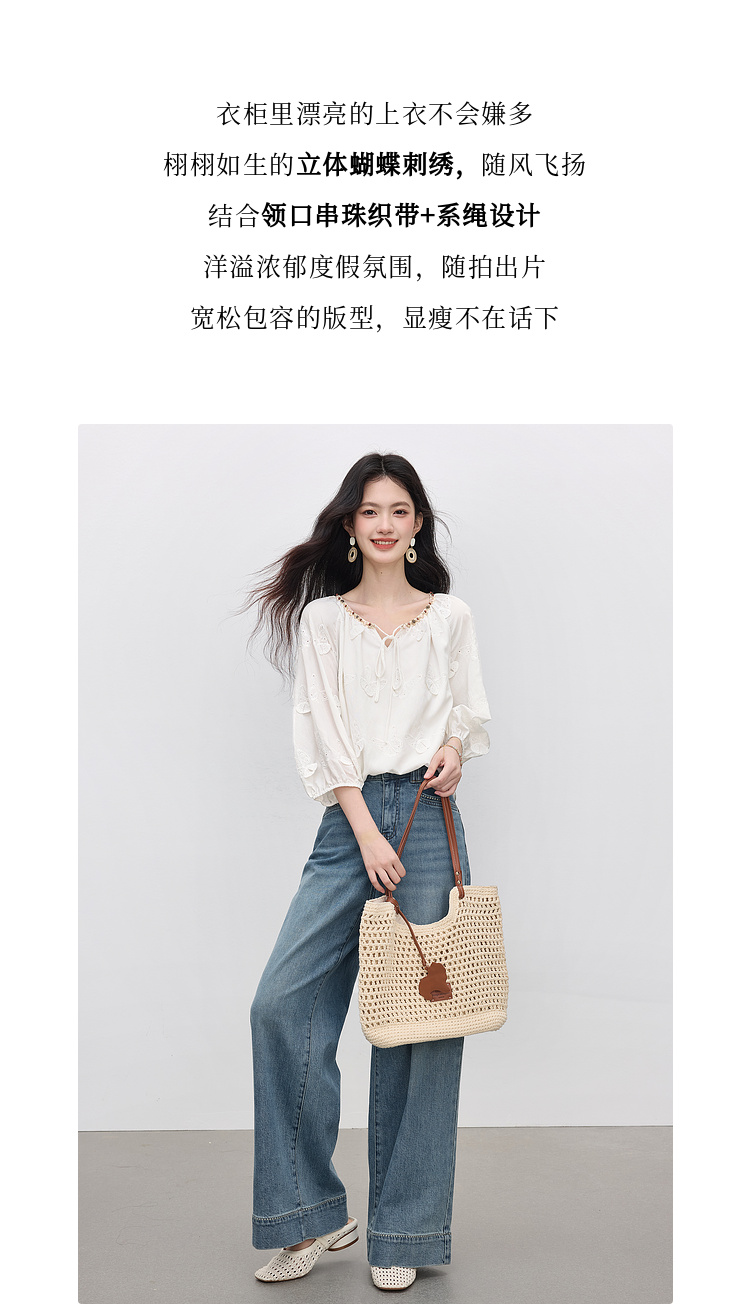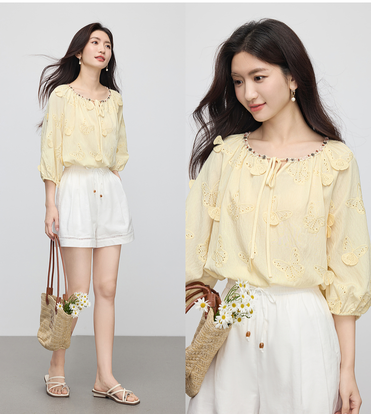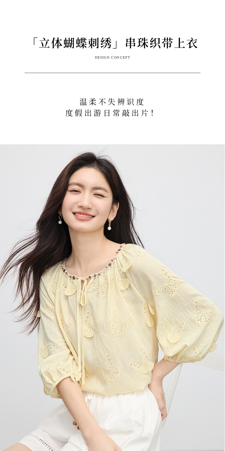 【周四狂欢价】熙世界轻民族风立体蝴蝶刺绣衬衫女2025初秋新款设计感七分袖上衣