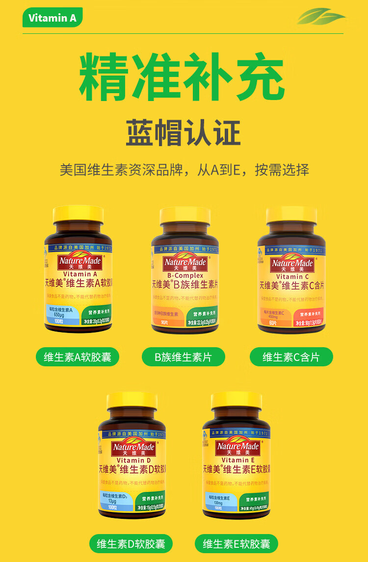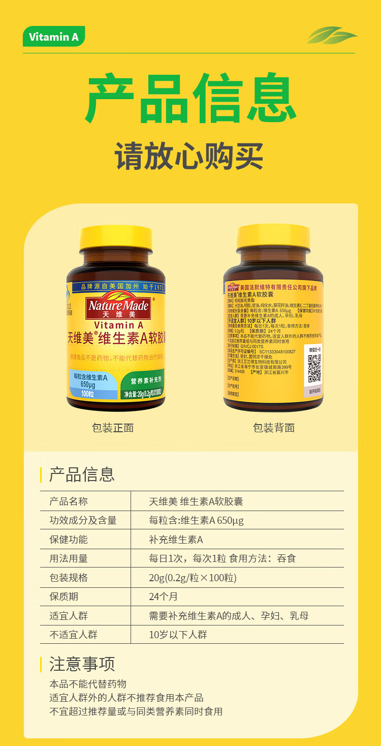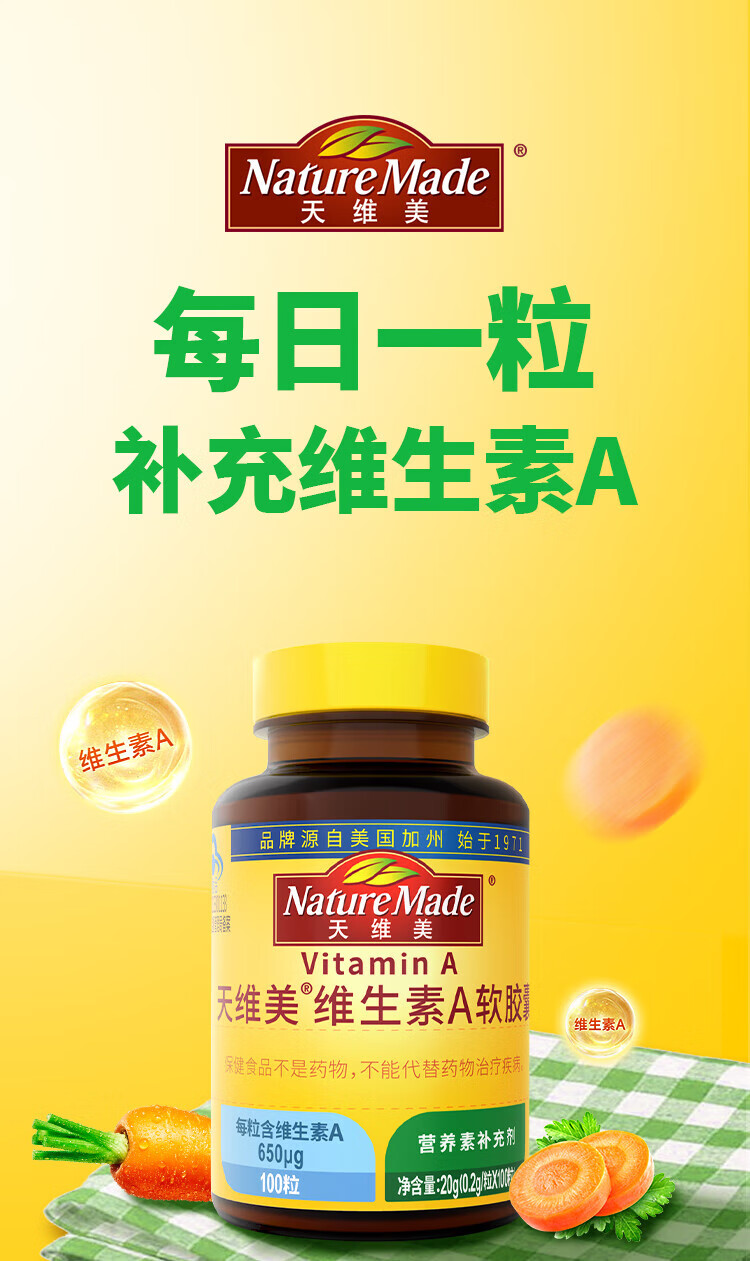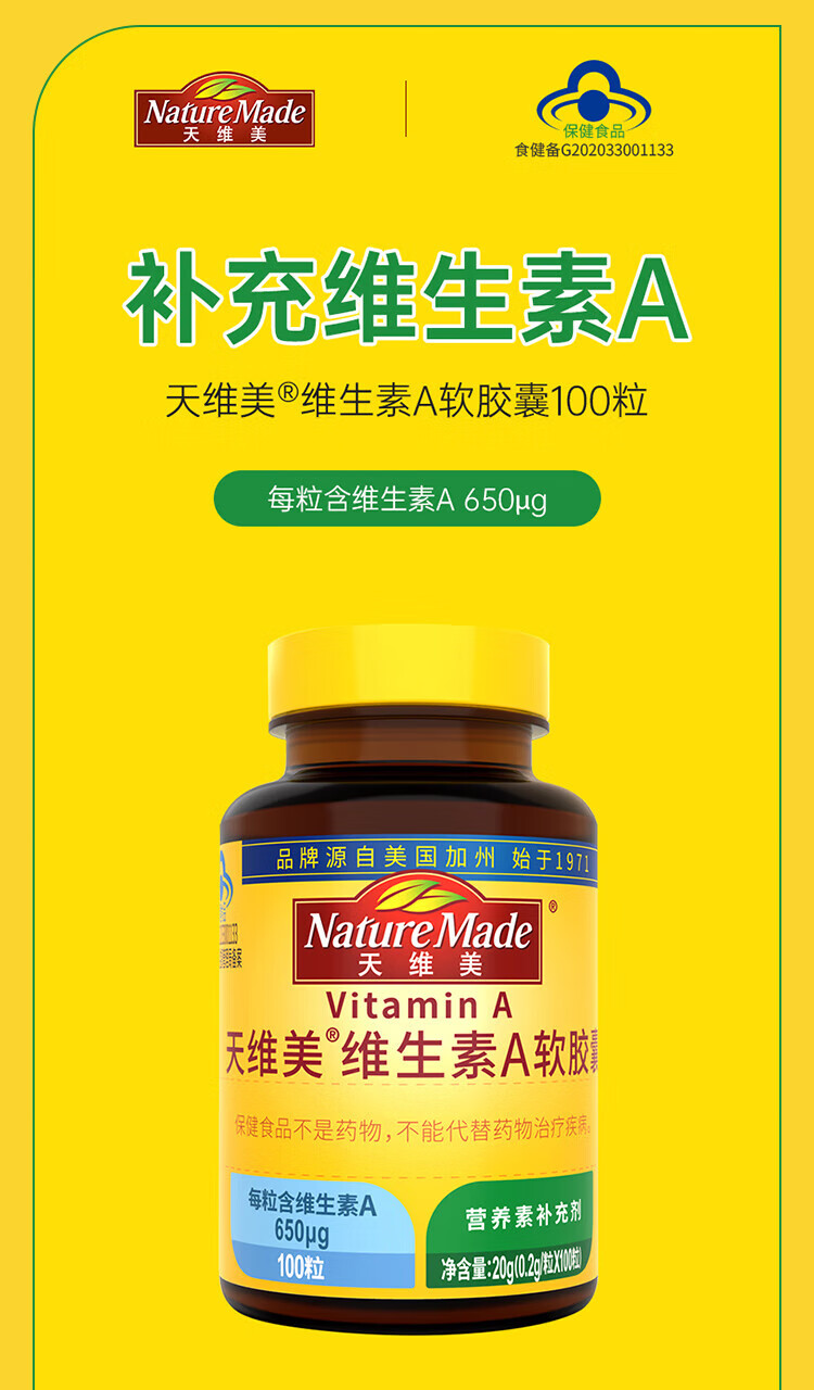 【国内版】NatureMade天维美®维生素A软胶囊Vitamin A100粒 眼干眼涩 滋养肌肤