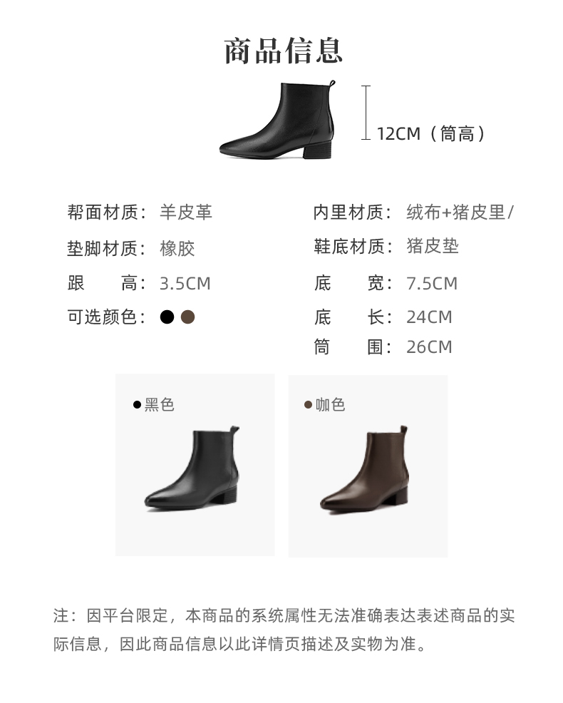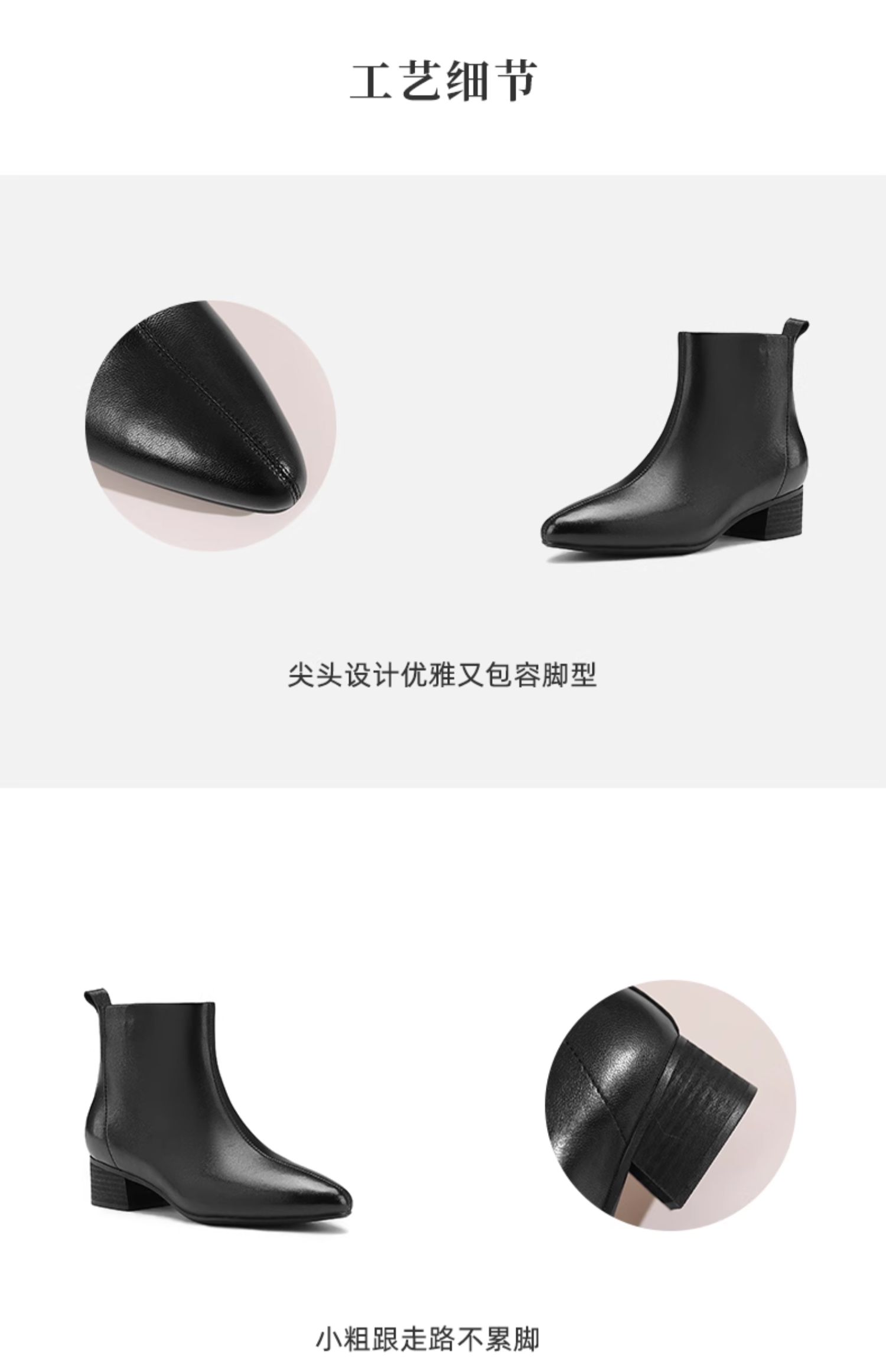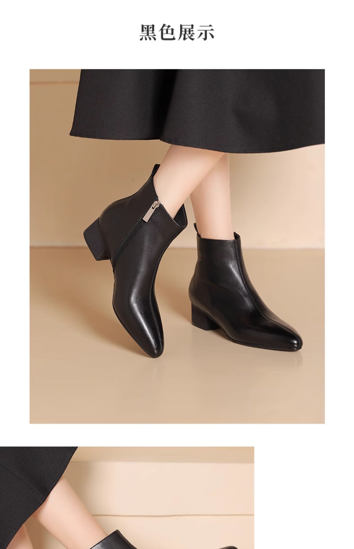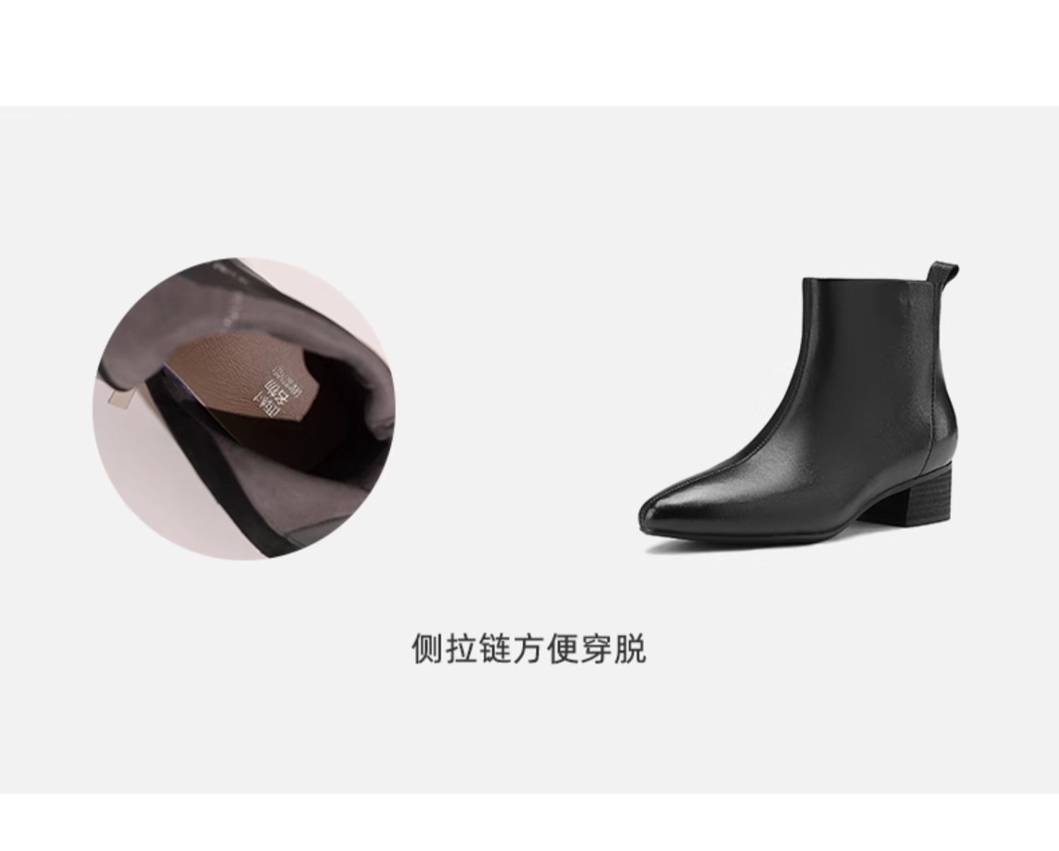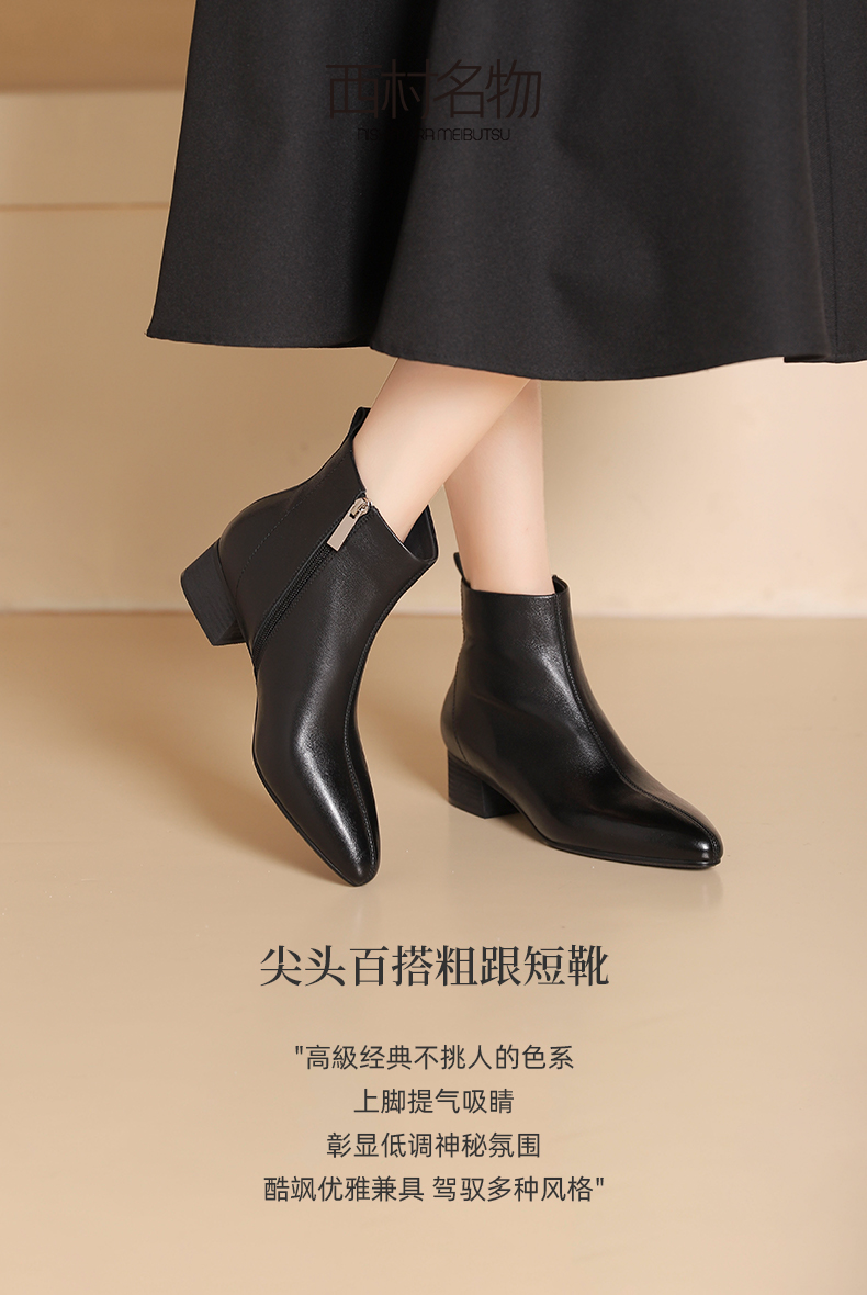 西村名物2024冬季新款英伦风真皮尖头百搭通勤粗跟短靴女X24DS47631