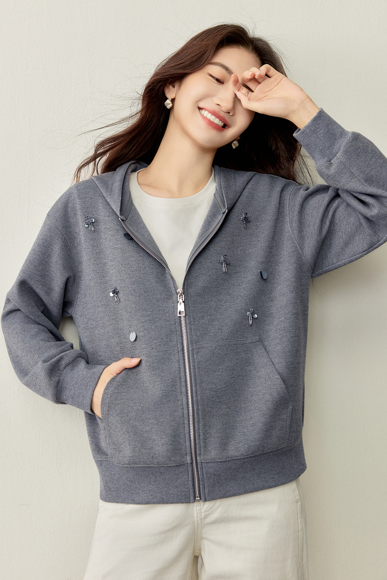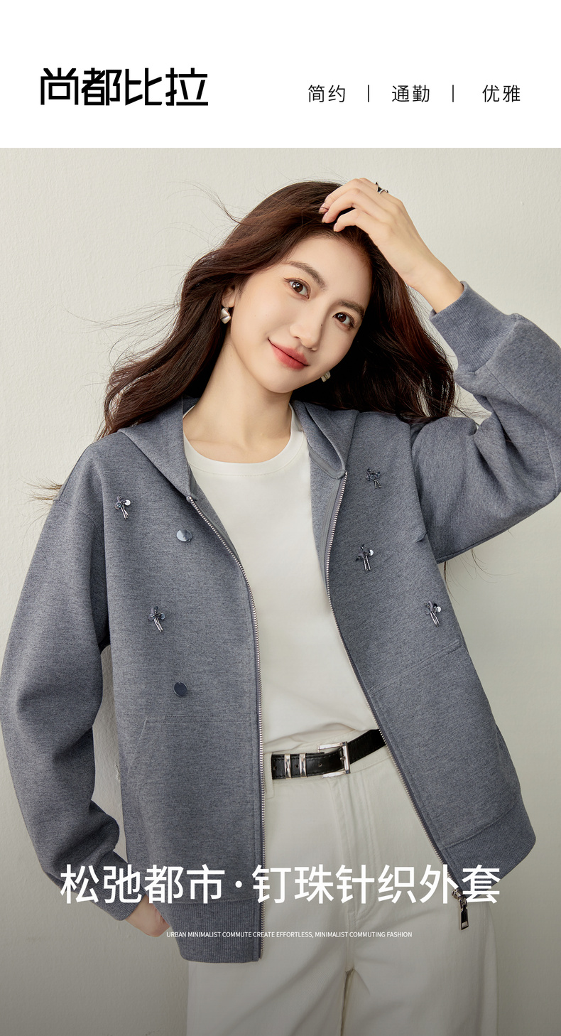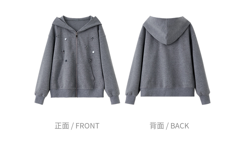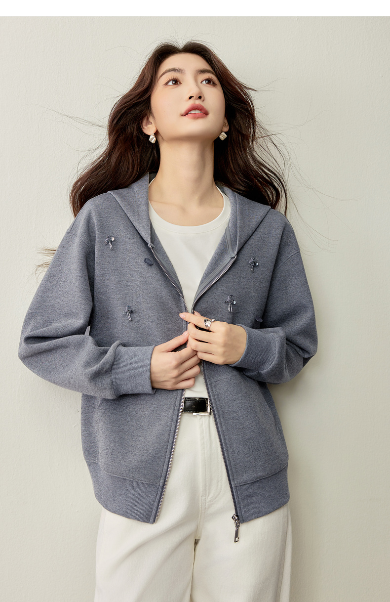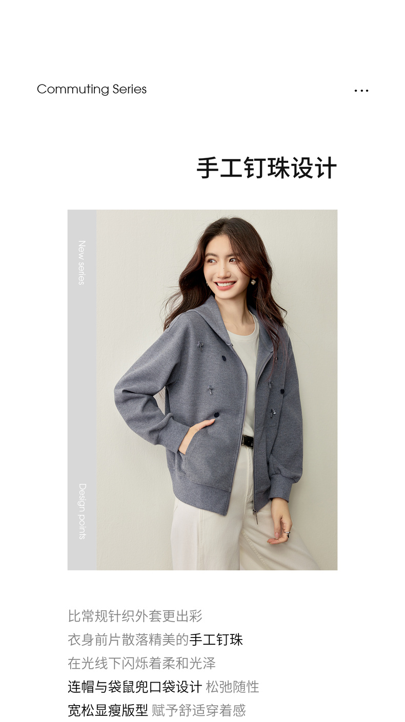 【内购】【宽松显瘦】简约休闲手工钉珠连帽落肩长袖空气层针织卫衣外套-153WC2052