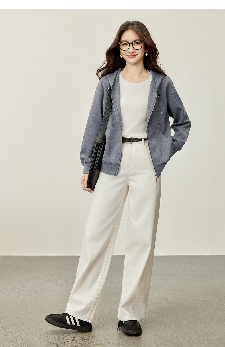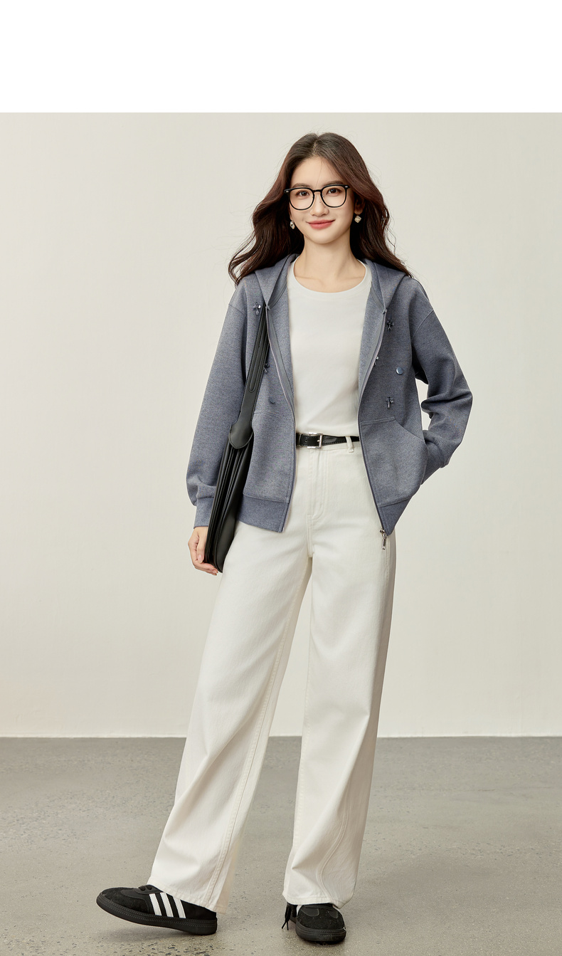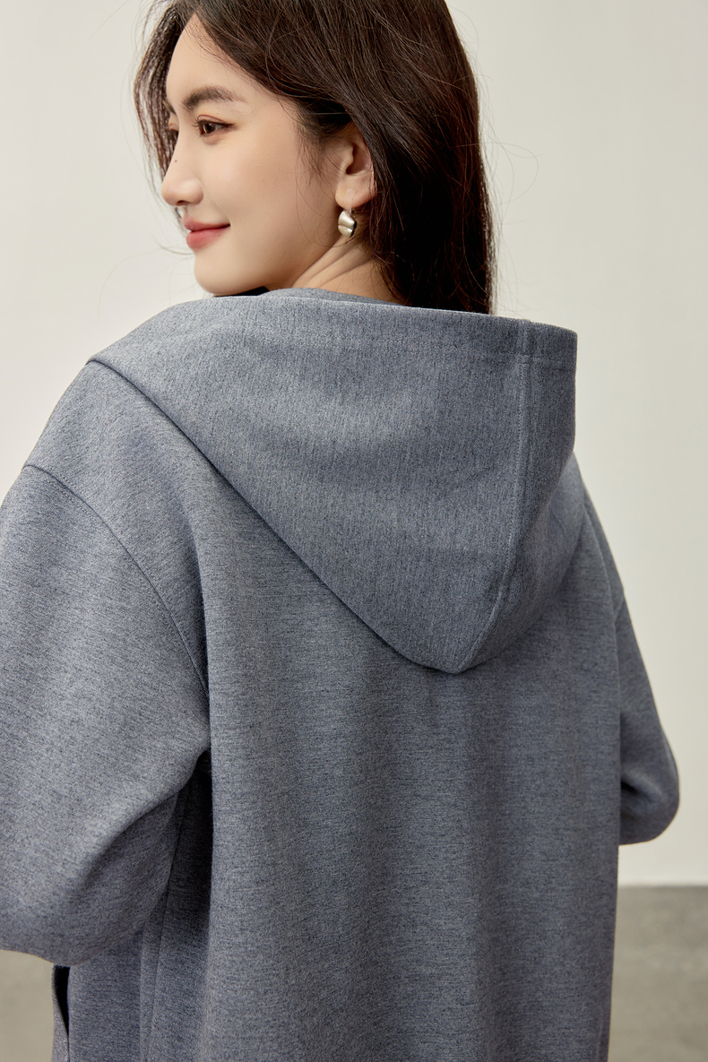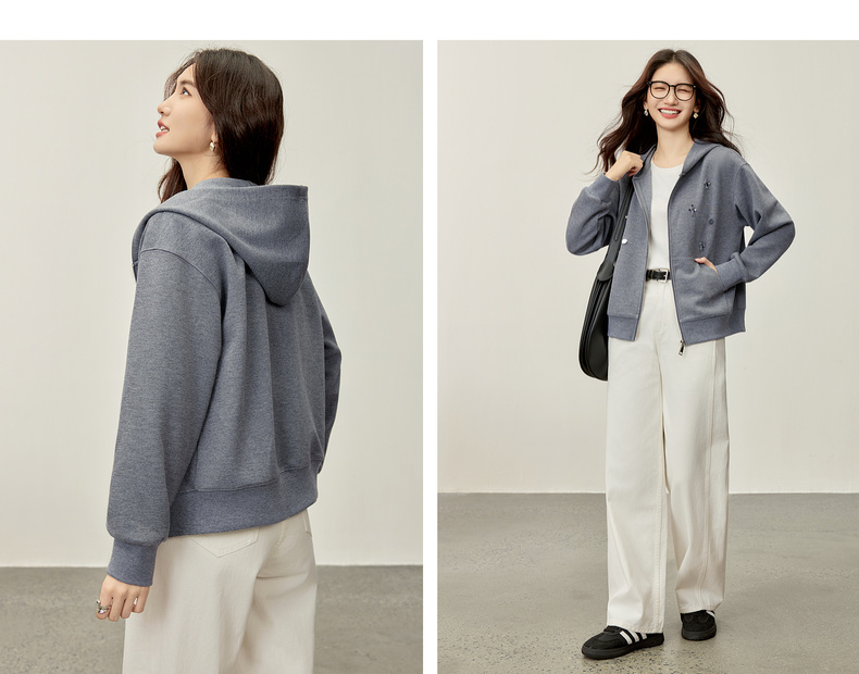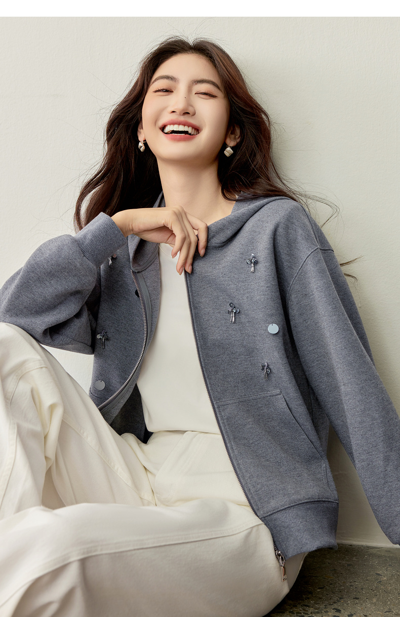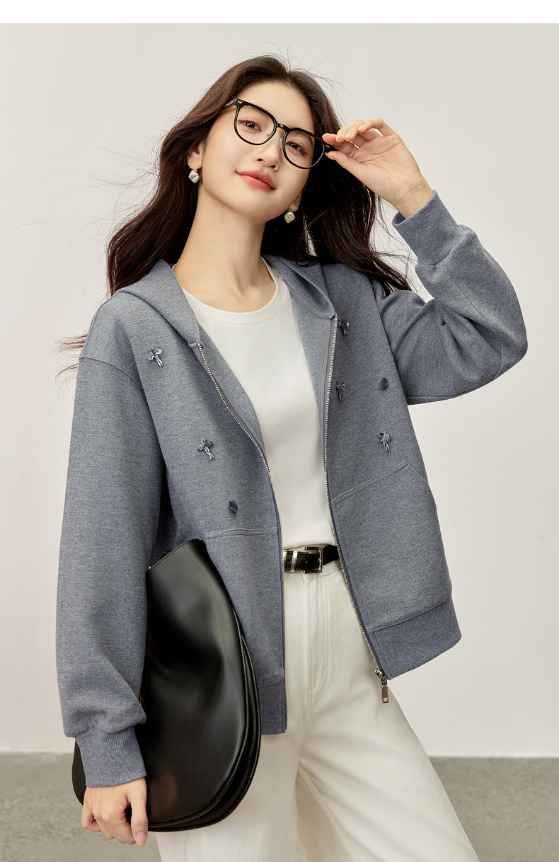 【内购】【宽松显瘦】简约休闲手工钉珠连帽落肩长袖空气层针织卫衣外套-153WC2052