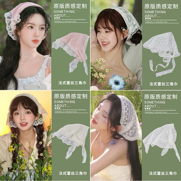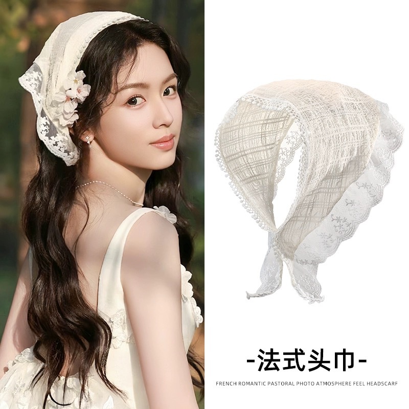 【法式三角巾】女士蕾丝 夏季防晒薄款透气百搭时尚头巾 飘带头发带丝巾