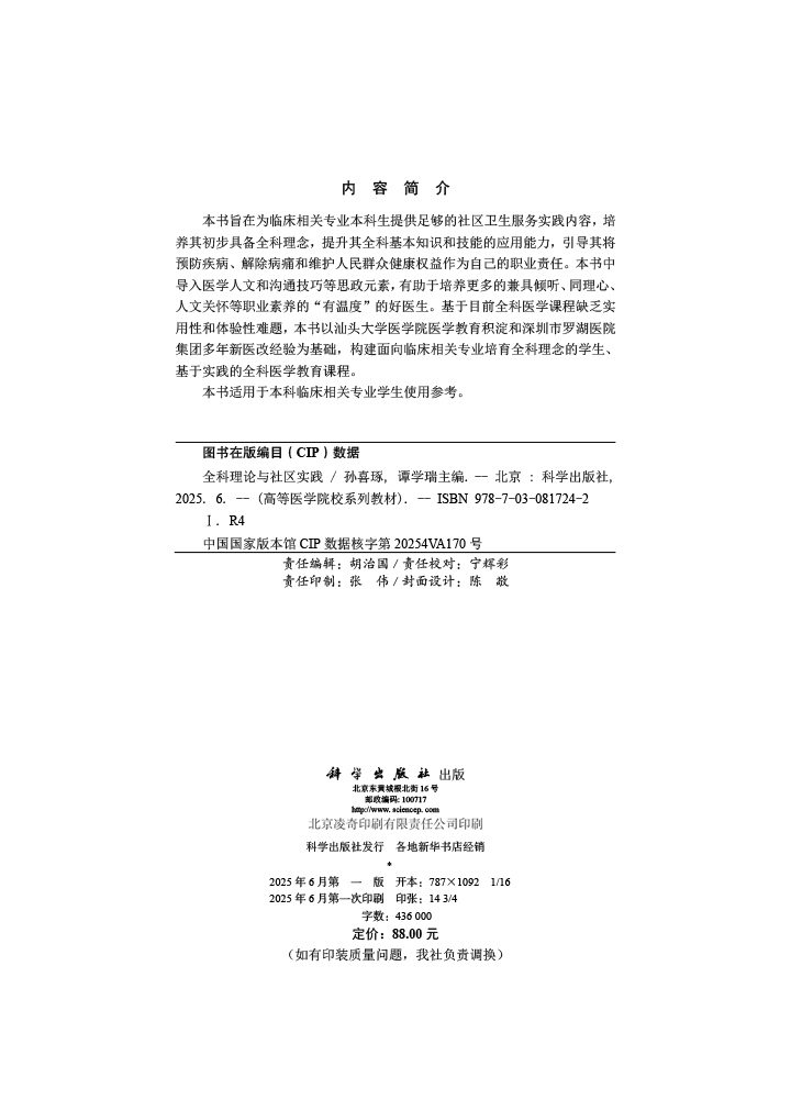 全科理论与社区实践 高等医学院校系列教材 孙喜琢 谭学瑞 主编 本书适用于本科临床相关专业字生使用参考9787030817242科学出版社