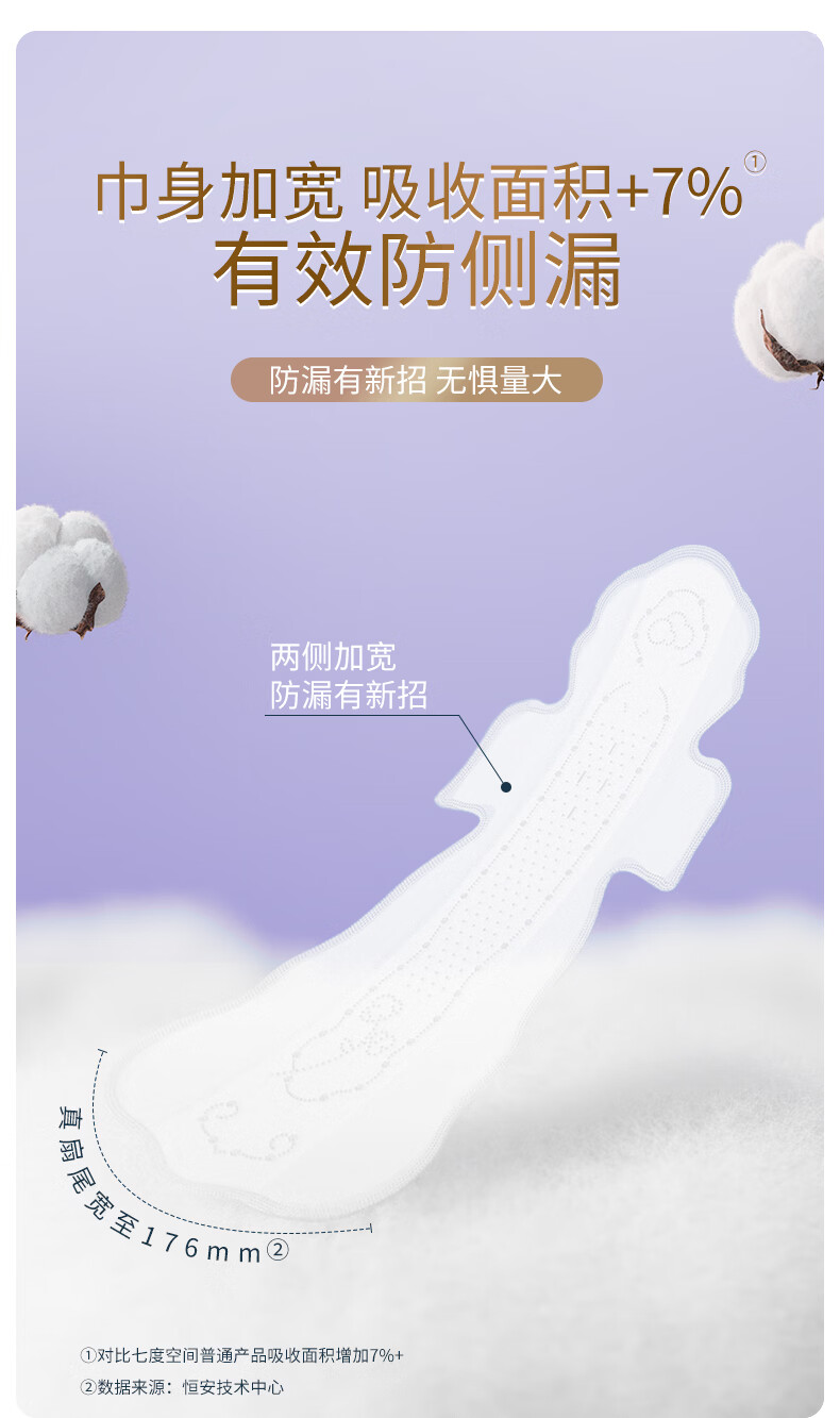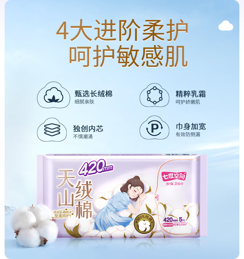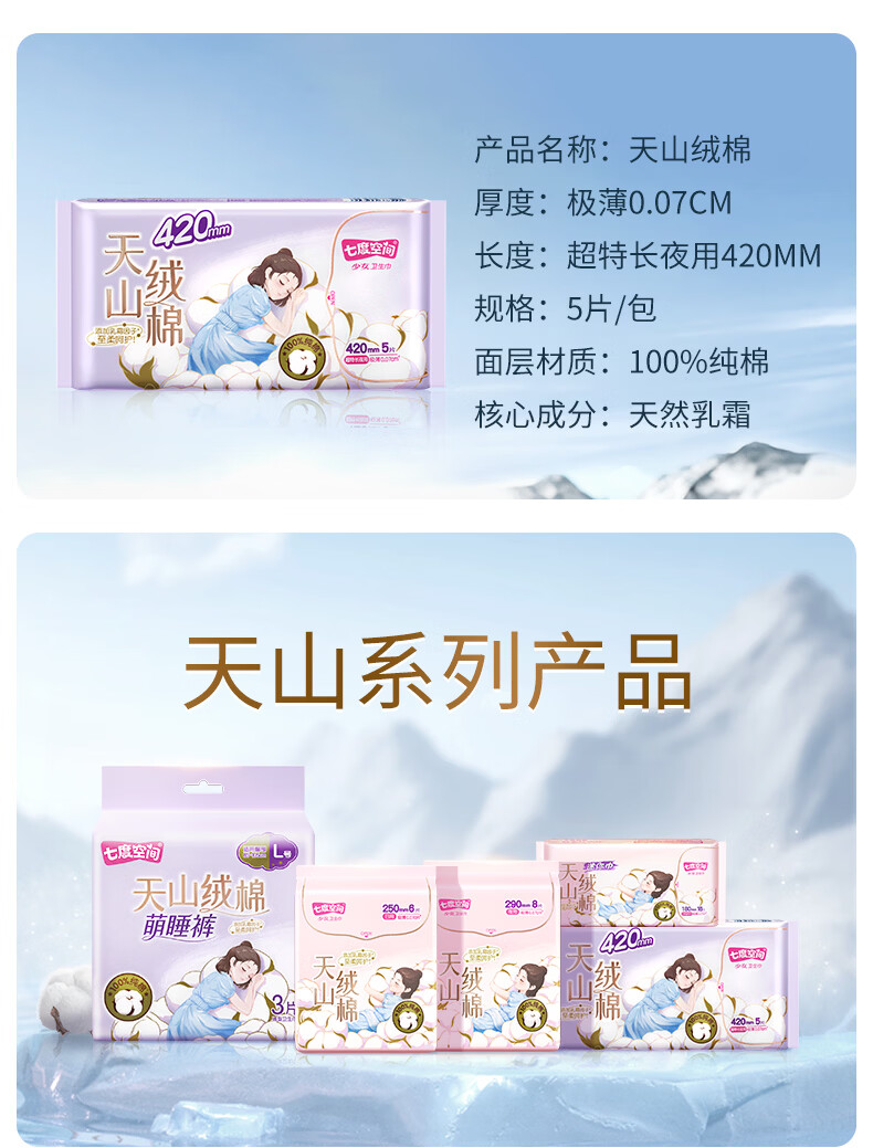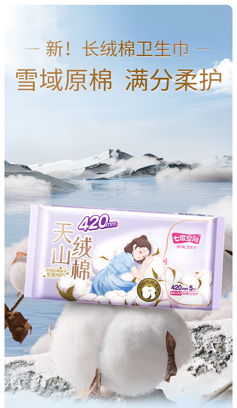 七度空间 天山绒棉系列极薄纯棉超特长夜用卫生巾420mm 5片/包