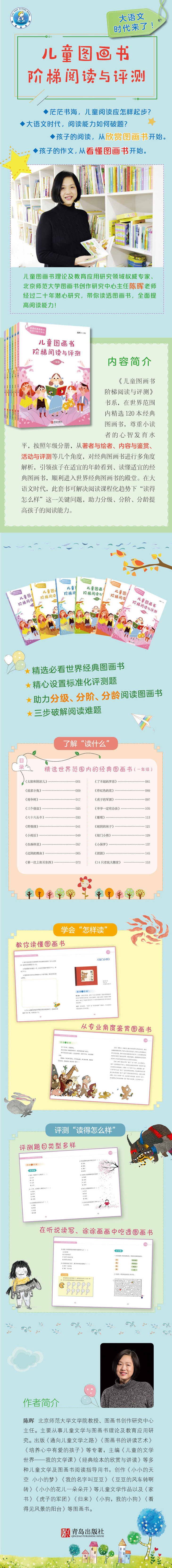 《儿童图画书阶梯阅读与评测》书系,在世界范围内精选120本经典图画书,尊重小读者的心智发育水平,按照年级分册,从著者与绘者、内容与鉴赏、活动与评测等几个角度,对经典图画书进行多角度解析,引领孩子在不同的年龄看到、读懂适宜的经典图画书,顺利进入世界经典图画书的殿堂。在大语文时代,此套书可解决阅读课程化趋势下“读得怎么样”这一关键问题,助力分级、分阶、分龄提高孩子的阅读能力。