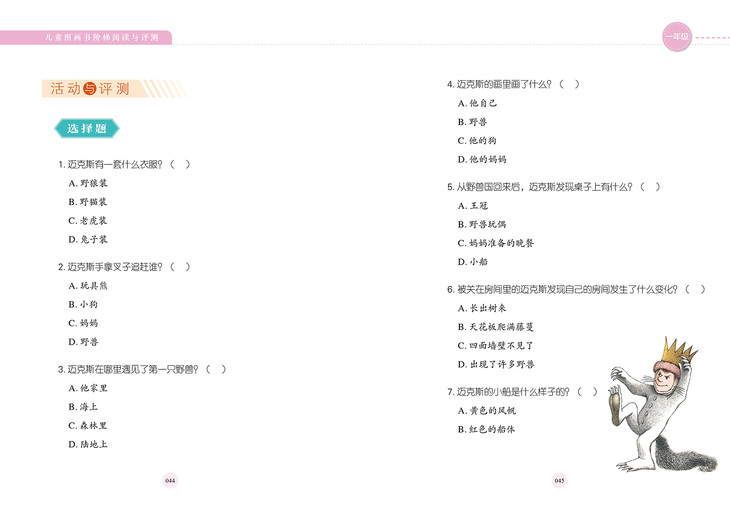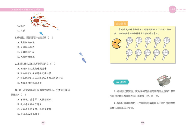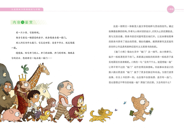 (2)功能性(阅读指导性):本书系在世界范围内精选120本经典图画书,按照年级分册,并且每本书配以精彩的内容简介和艺术鉴赏,首先为不同年龄段的孩子解决了“读什么”“怎么读”的问题。同时,独创性地以“活动与评测”为核心单元,精心设置标准化阅读测评题,科学、客观地评价孩子的阅读成效,解决了阅读课程化趋势下“读得怎么样”这一关键问题。