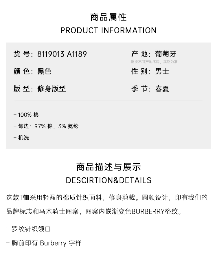 BURBERRY 巴宝莉 男士马术骑士徽标印花渐变棉质圆领短袖T恤 黑色 8119013 A1189