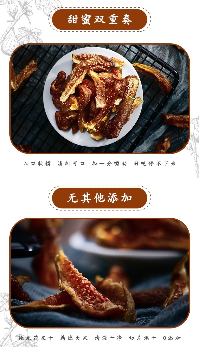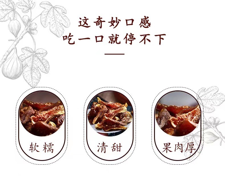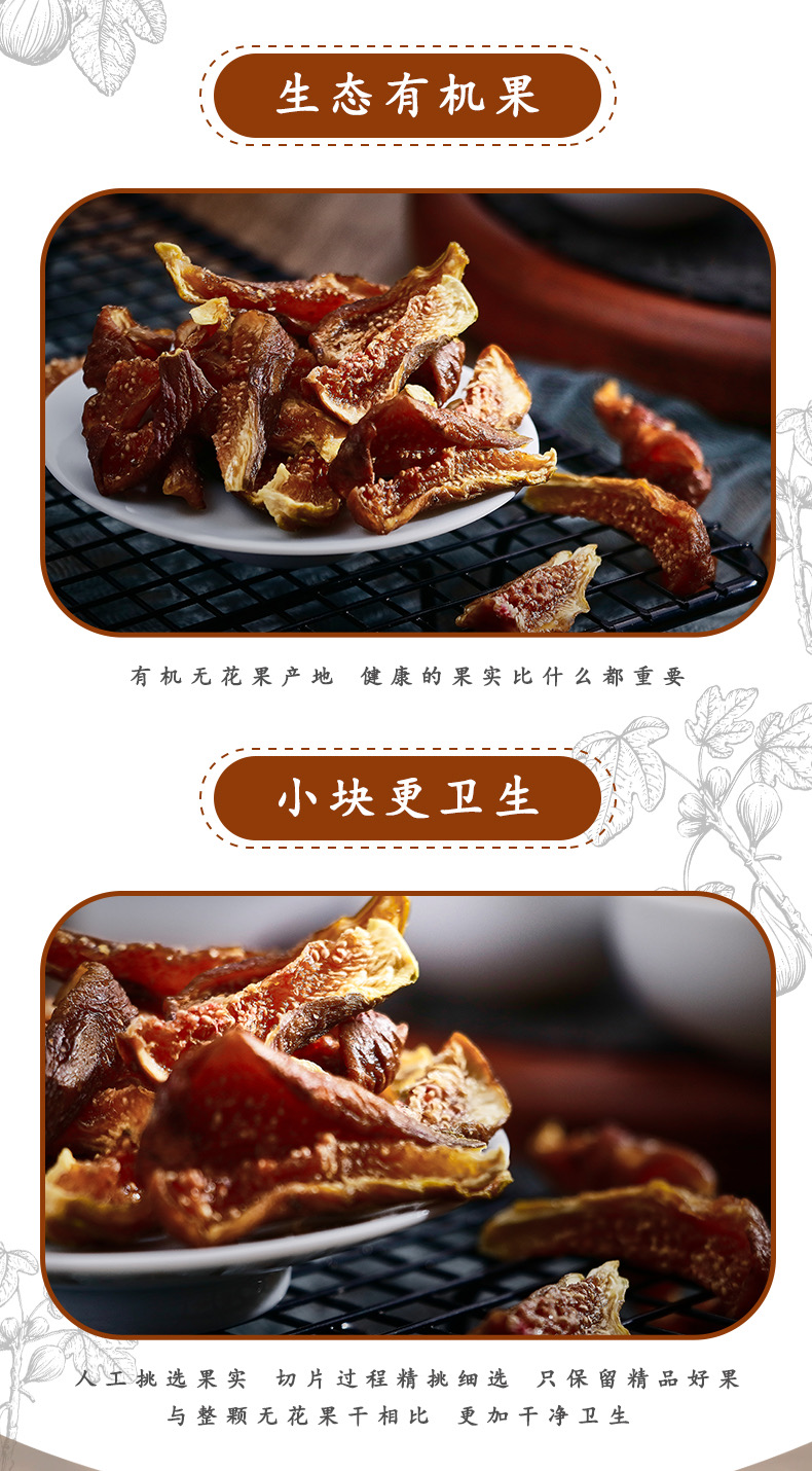 【卖点】有机方式种植的无花果鲜果加工成果干,杜绝化学农药和化肥,坚持人工除草,目前已获得有机种植和有机加工认证,浓浓的无花果香,自然纯正的果甜,O添加