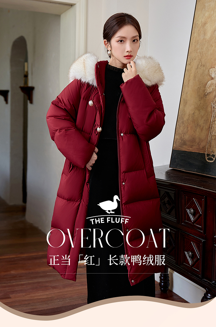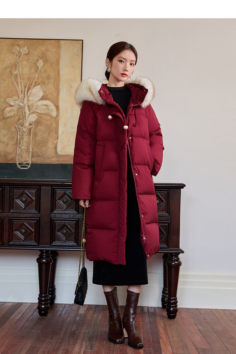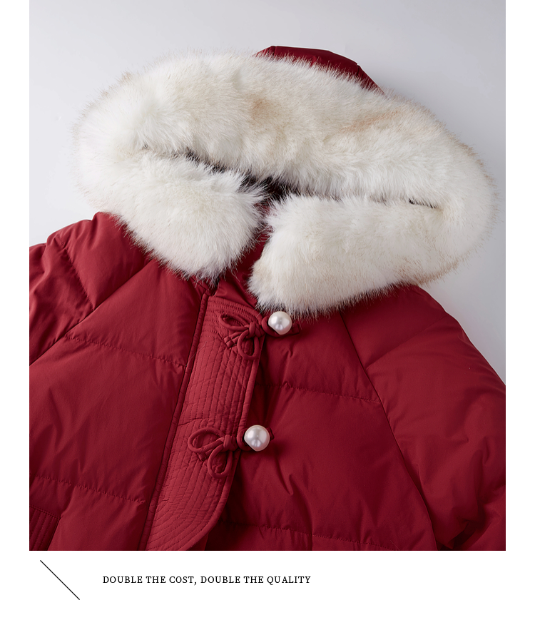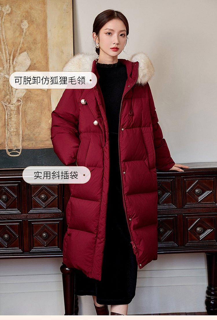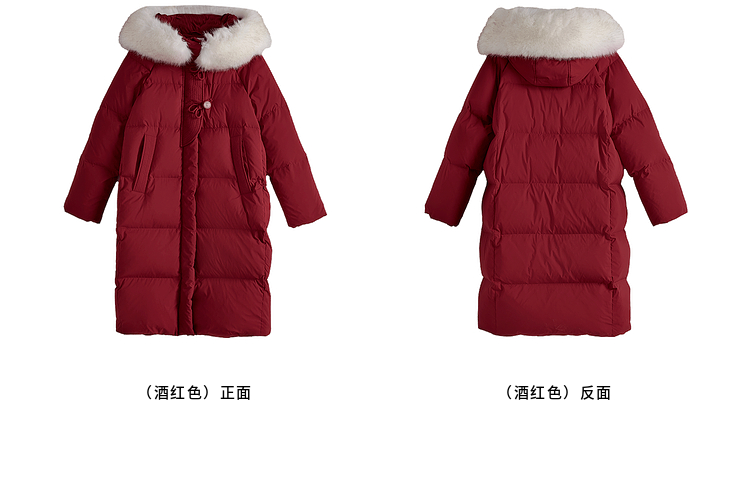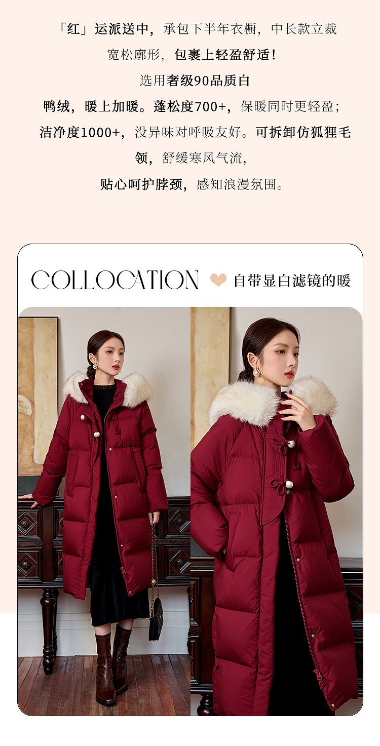 【年终特卖】熙世界可脱卸大毛领红色羽绒服长款白鸭绒保暖外套女2025冬季新款