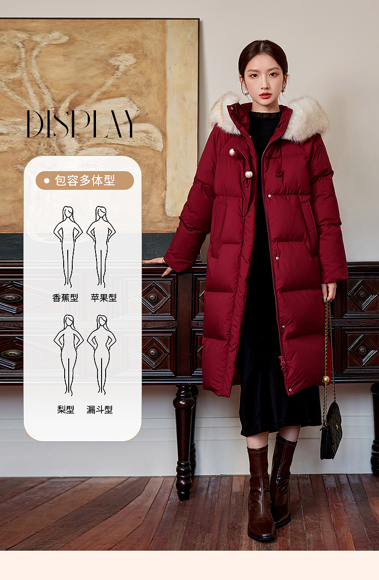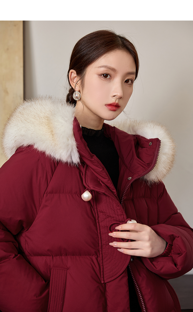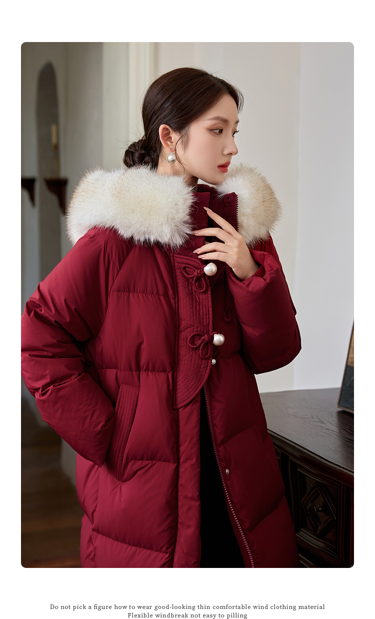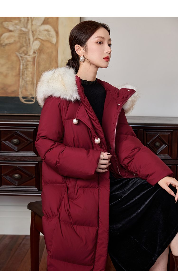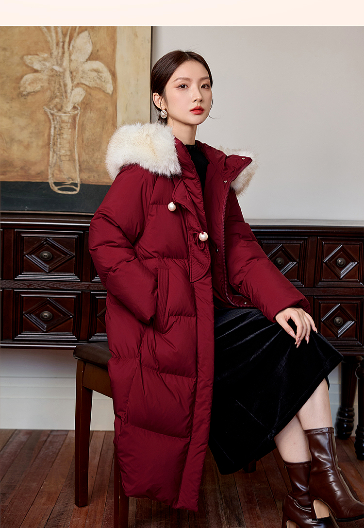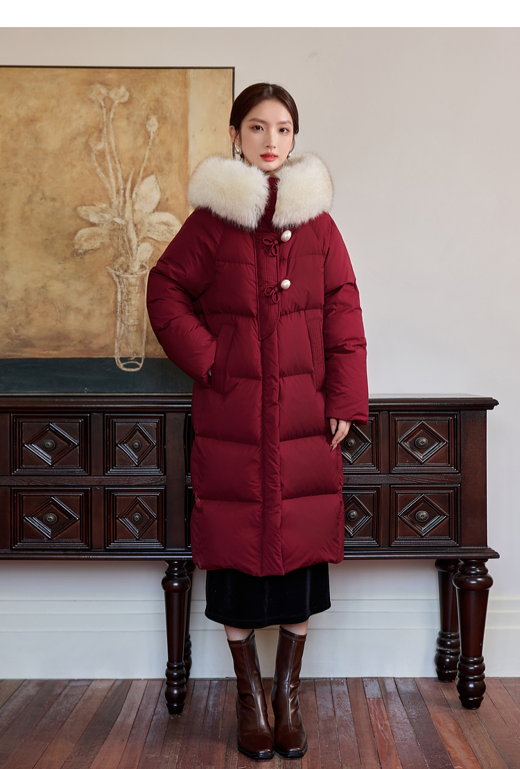 【年终特卖】熙世界可脱卸大毛领红色羽绒服长款白鸭绒保暖外套女2025冬季新款