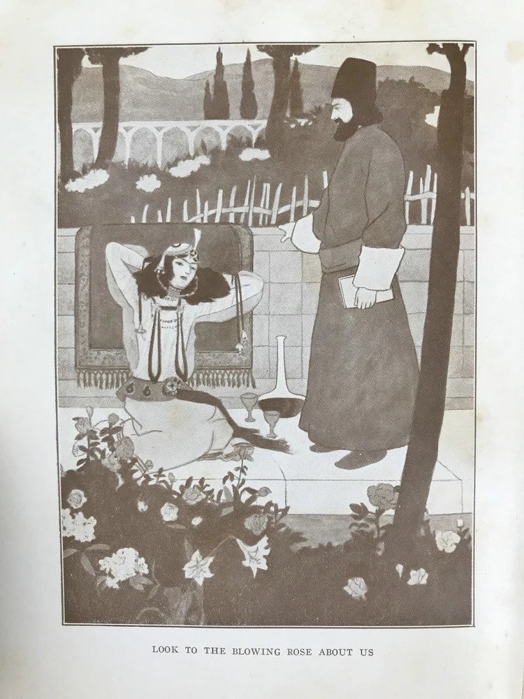 英国插画艺术家吉尔伯特·詹姆斯Gilbert James,可以说是著名的《鲁拜集》插画艺术的先驱之一,先后在1898、1907和1909年为《鲁拜集》绘制过三版插图,风格秀丽,独具一格,为后世藏书家所推崇。