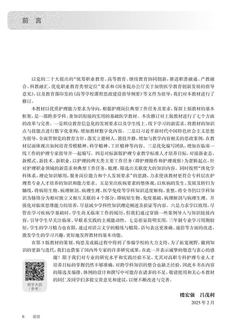 本教材为高等职业教育专科护理类专业“十四五”规划教材之一、国家卫生健康委员会“十四五”规划教材之一。1.突出“疾病”要素的整体观,倡导用完整的生物-心理-社会医学观认识疾病的外因与内因、现象与本质,在教材体例的设计上,以“疾病”的发生、发展及转归为轴线,将病原生物、病理解剖、病理生理、医学免疫等学科知识适度解构重整,并基于现有教师仍然好教的具体实际,将全书仍以学科知识为脉络分为相对独立又相互关联的四个版块即生物病原、免疫基础、病理解剖与病理生理。2.紧扣岗位需求,以护理的两大类主要工作任务即护理操作和护理观察为逻辑起点,梳理、筛选关联度大的知识内容,确保专业基础的针对性与实用性。3.强化临床思维能力的培养,将学科性知识研究取向调整为应用性导向,尽量减少学科性知识理论阐述及验证等内容。4.学生在学习《疾病学基础》时,尚无临床工作的阅历,通过穿插一些情景案例导入与知识拓展内容,引导学生早关注临床,早联系实践的主观能动性。