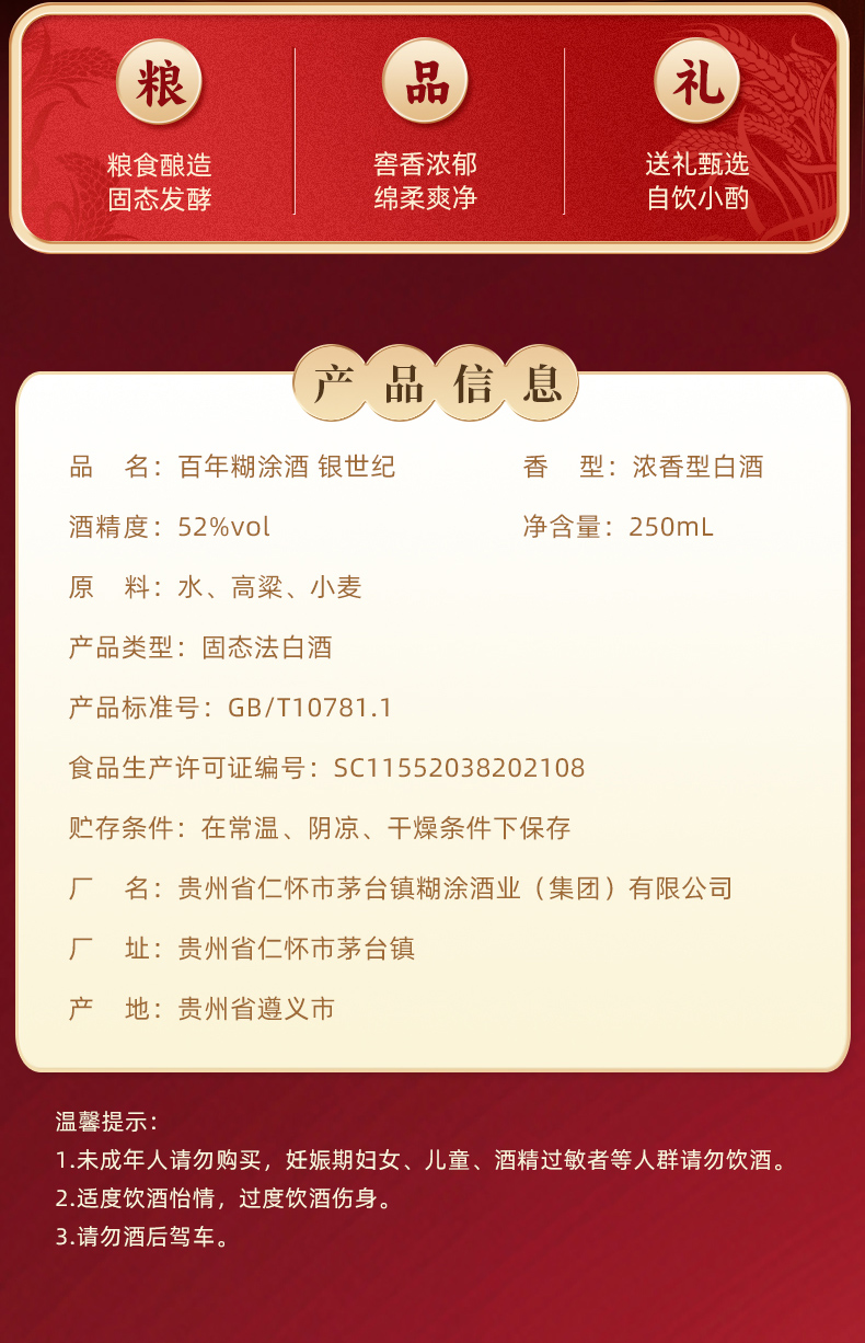 【250ml装】【老日期】百年糊涂 银世纪 250mL 浓香型(下单选择度数)