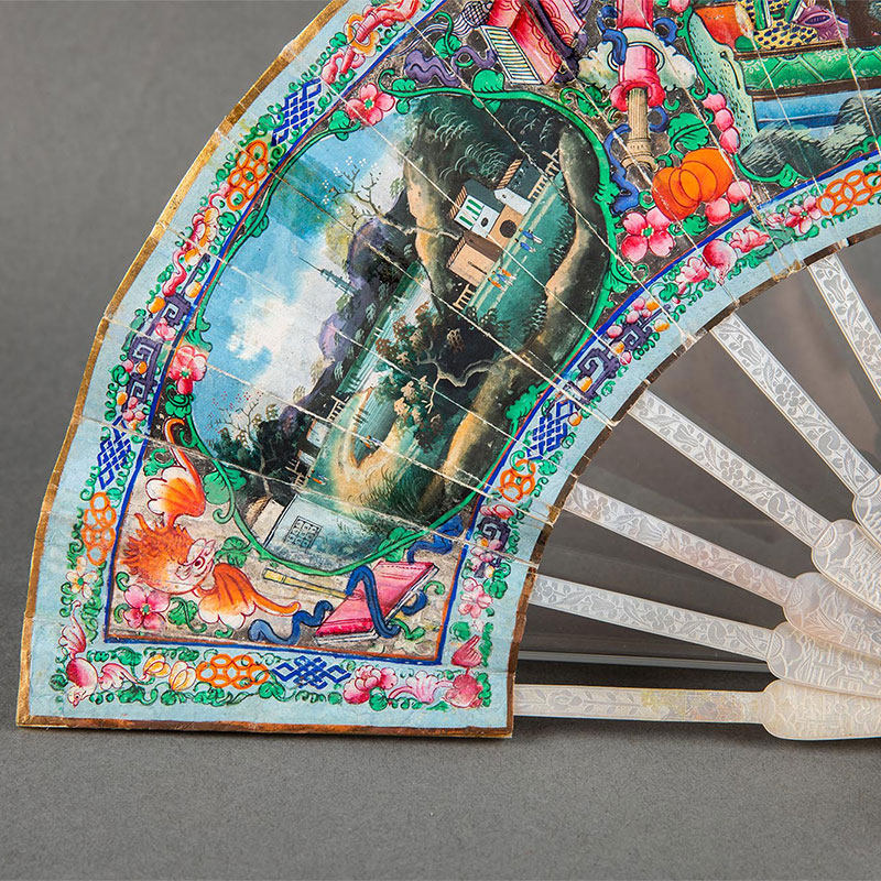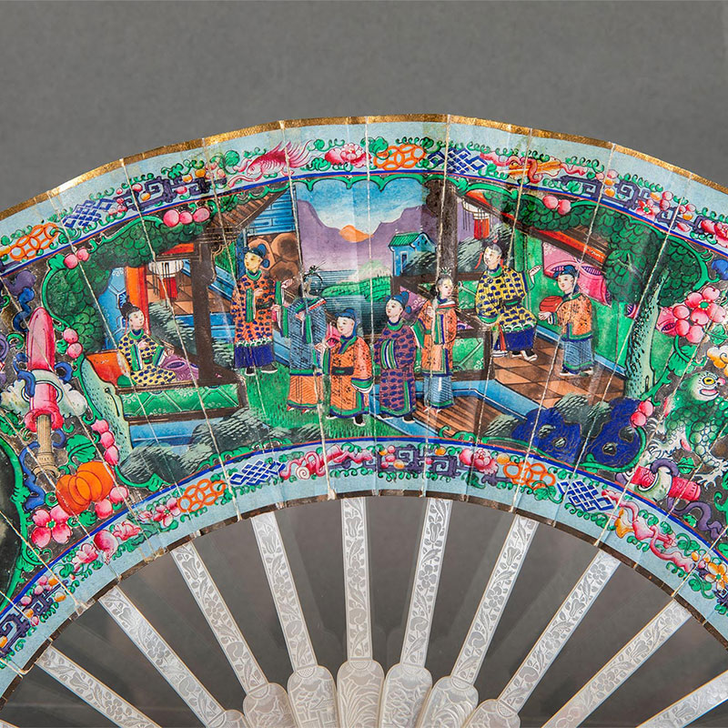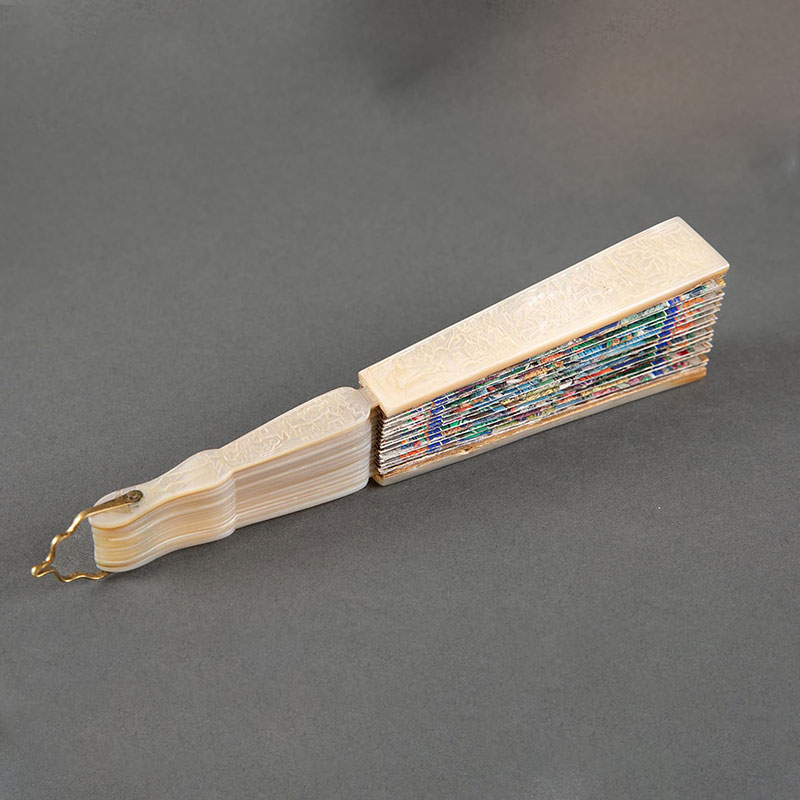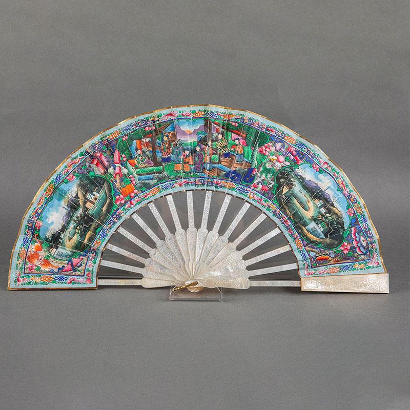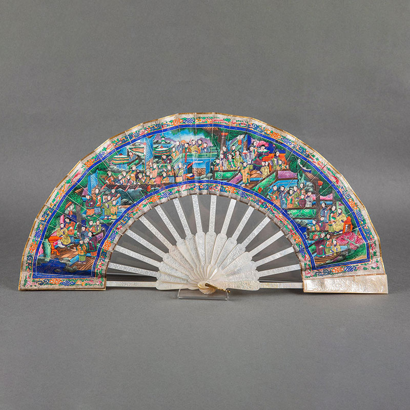 19世纪中国广东十三行出品母贝精雕扇骨「千人面」纸本彩绘古董折扇