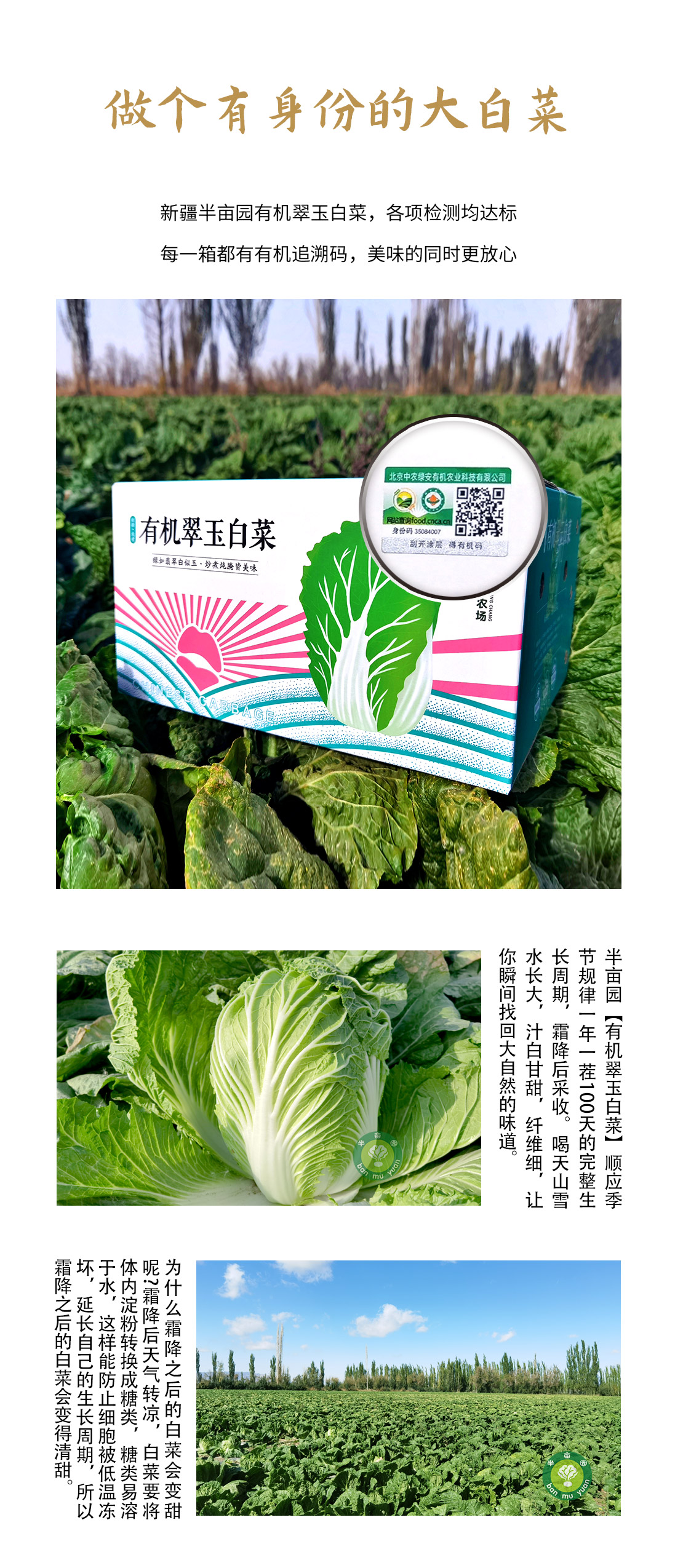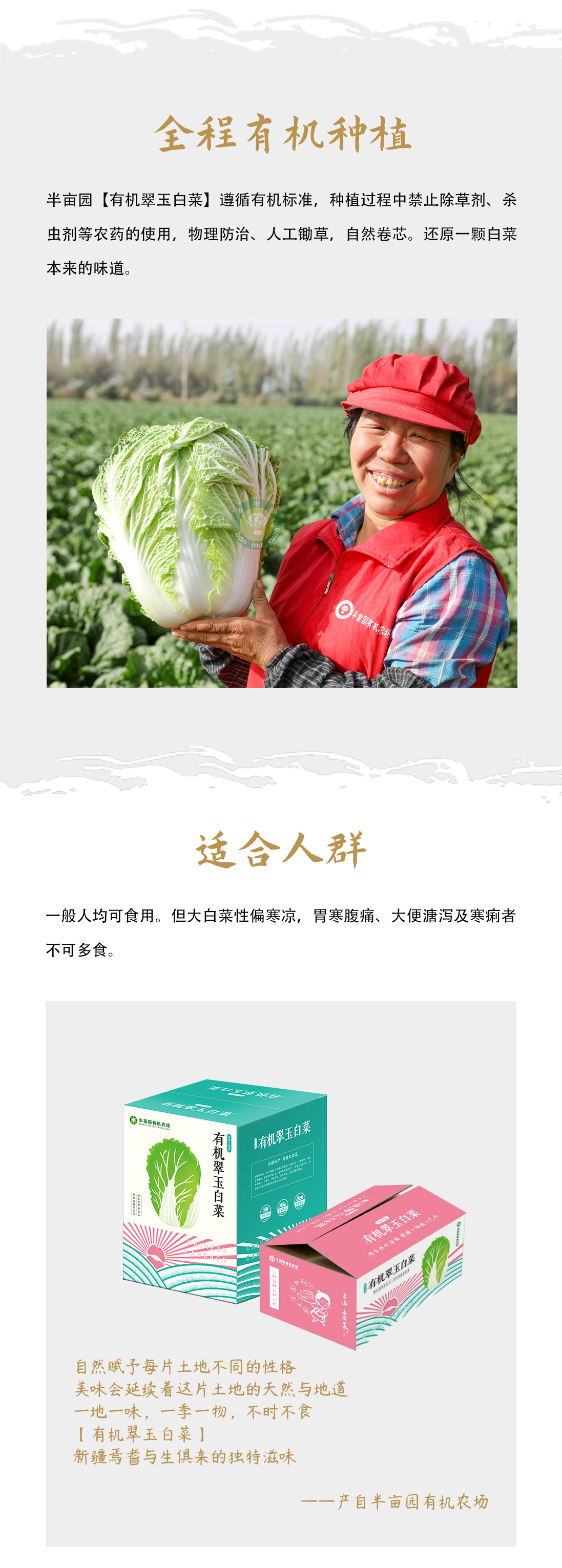 产品特点:半亩园【有机翠玉白菜】顺应季节规律一年一茬,100多天的生长周期,打霜后采收。喝天山雪水长大,汁白甘甜,纤维细,让你瞬间找回大自然的味道