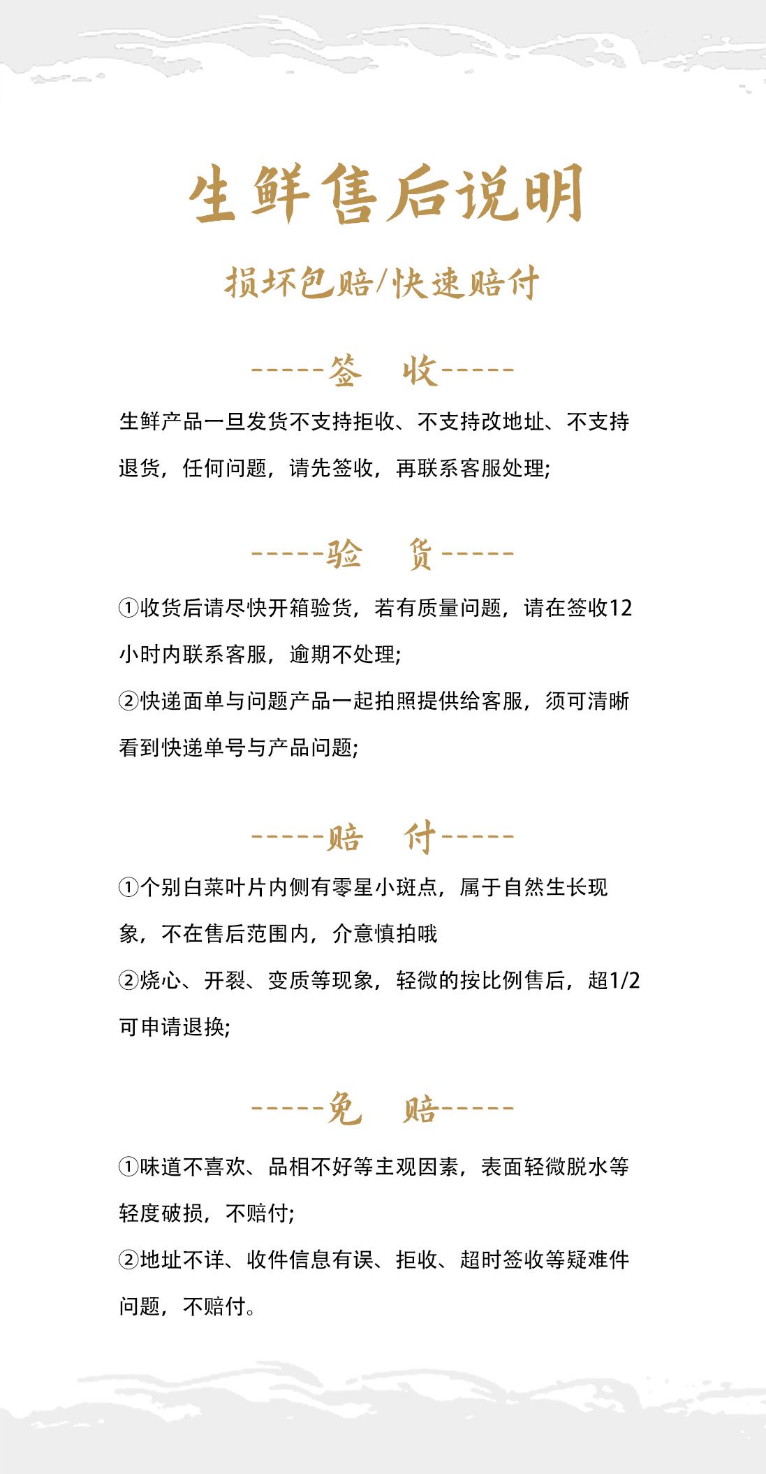 1、生鲜产品一旦发货不支持拒收、退货,任何问题请先签收,再联系客服处理;