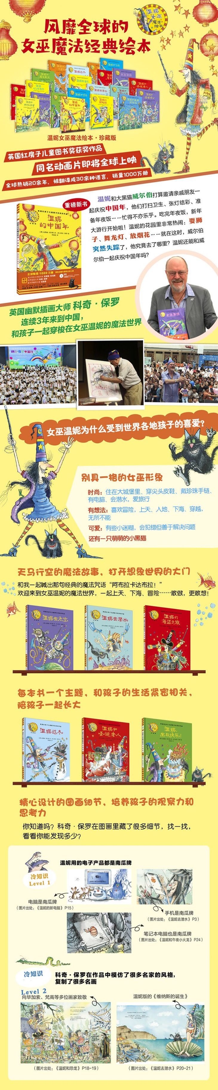 《温妮的中国年》:温妮和大黑猫威尔伯打算邀请亲戚朋友一起庆祝中国年,他们打扫卫生、张灯结彩、准备年夜饭……忙得不亦乐乎。吃完年夜饭,新年大游行开始啦!温妮的花园里非常热闹:耍狮子、舞龙灯、放烟花……就在这时,威尔伯突然失踪了,他究竟去了哪里?温妮还能和威尔伯一起庆祝中国年吗?