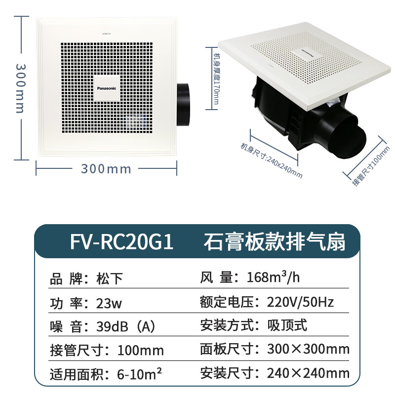 【特价机】松下排气扇卫生间石膏板排风扇厨房天花吸顶静音换气扇FV-RC20G1