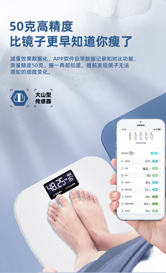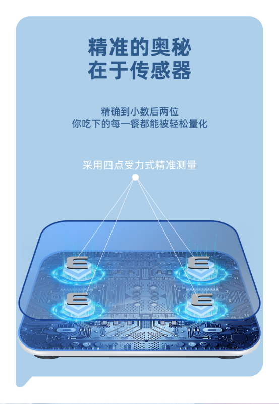 高精度传感器 高精度芯片 体脂称的原理就是电极片发出微弱电流导入人体 通过一只脚进去人体 经过体内传导后 将数据传入另一只脚下的电极片 而这个时候 高精度的传感器就是重中之重 传感器 采用第4代高精度小E传感器