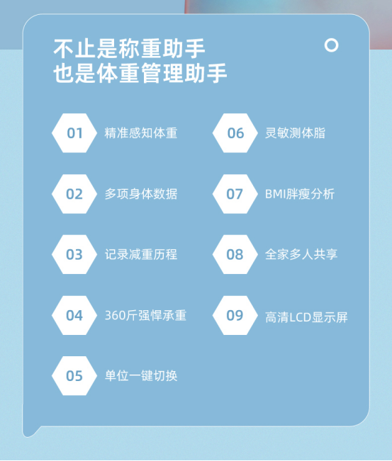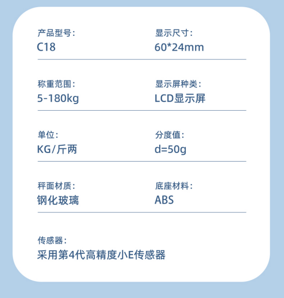 大称面28cm 两边弧度不容易磕碰 大人小孩零负担使用 高精度传感器 高精密芯片 采用第四代高精度小E传感器 高清液晶屏 显示屏自带室内温度显示 晚上不开灯也看得清 APP蓝牙连接 可以在手机上查看人体各项指标 外观时尚 简单大气