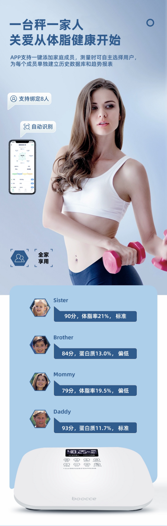 APP蓝牙连接 一台称全家人使用 可以同时添加多个家庭成员 🏡 高效管理全家人的健康 🏋 还可以根据家庭成员的年龄量身定制健康管理方案♀ 一台体脂称等于拥有一个全能管家