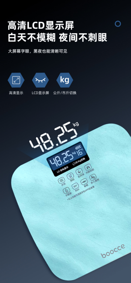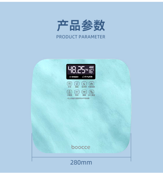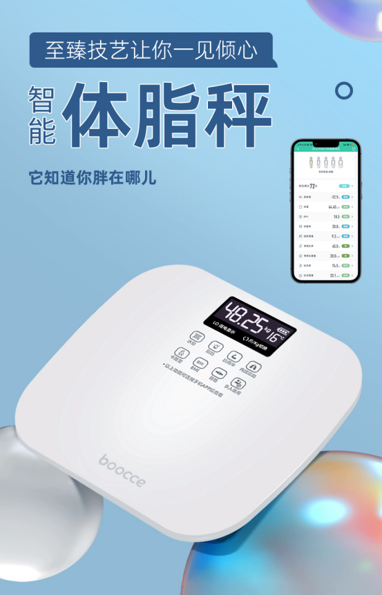 Boocce 最新款C18体脂秤 市面上大多数所谓的“体脂秤” 并不能准确的测试体脂 只是给一个大概的“数字” 市面上想选择一款好的体脂称更是难上加难 Boocce给你提供一款真正做到“真体脂”