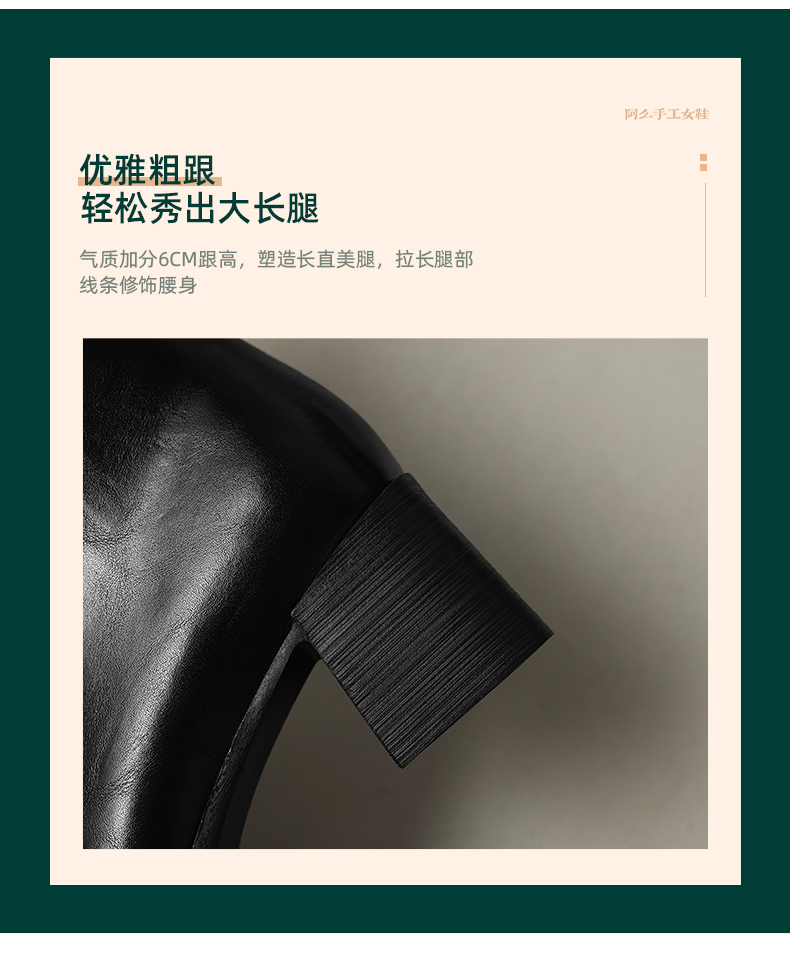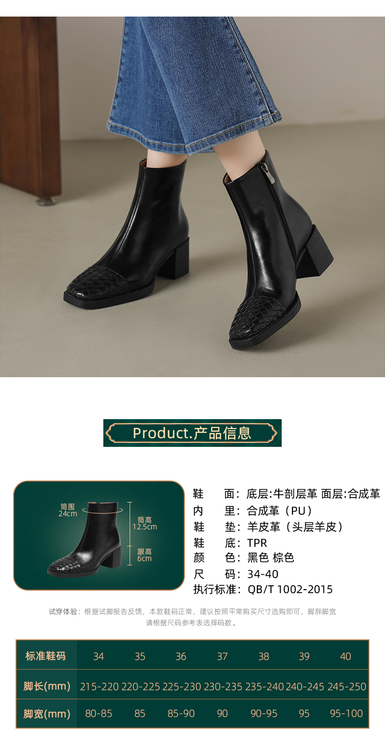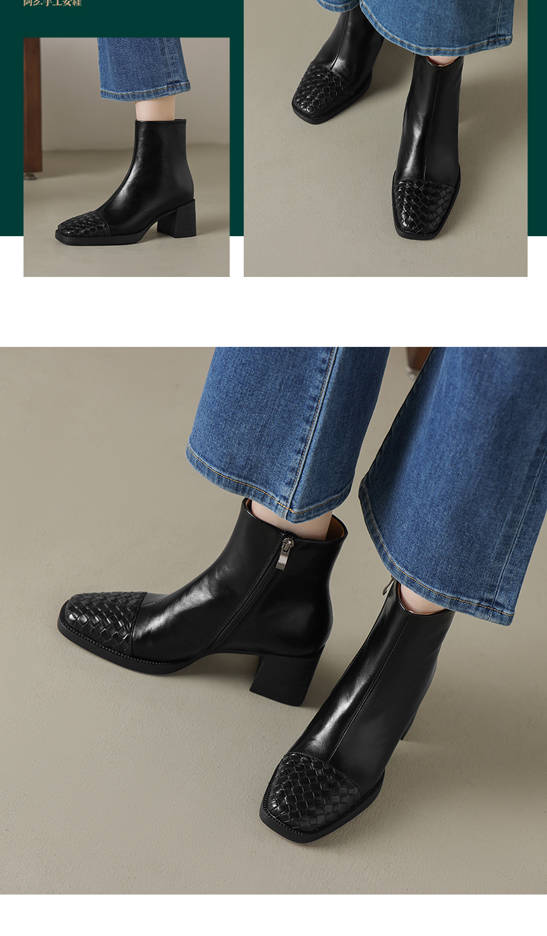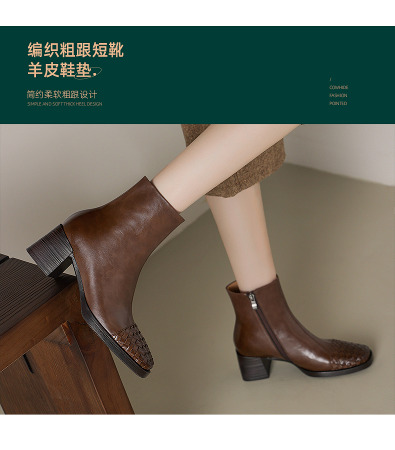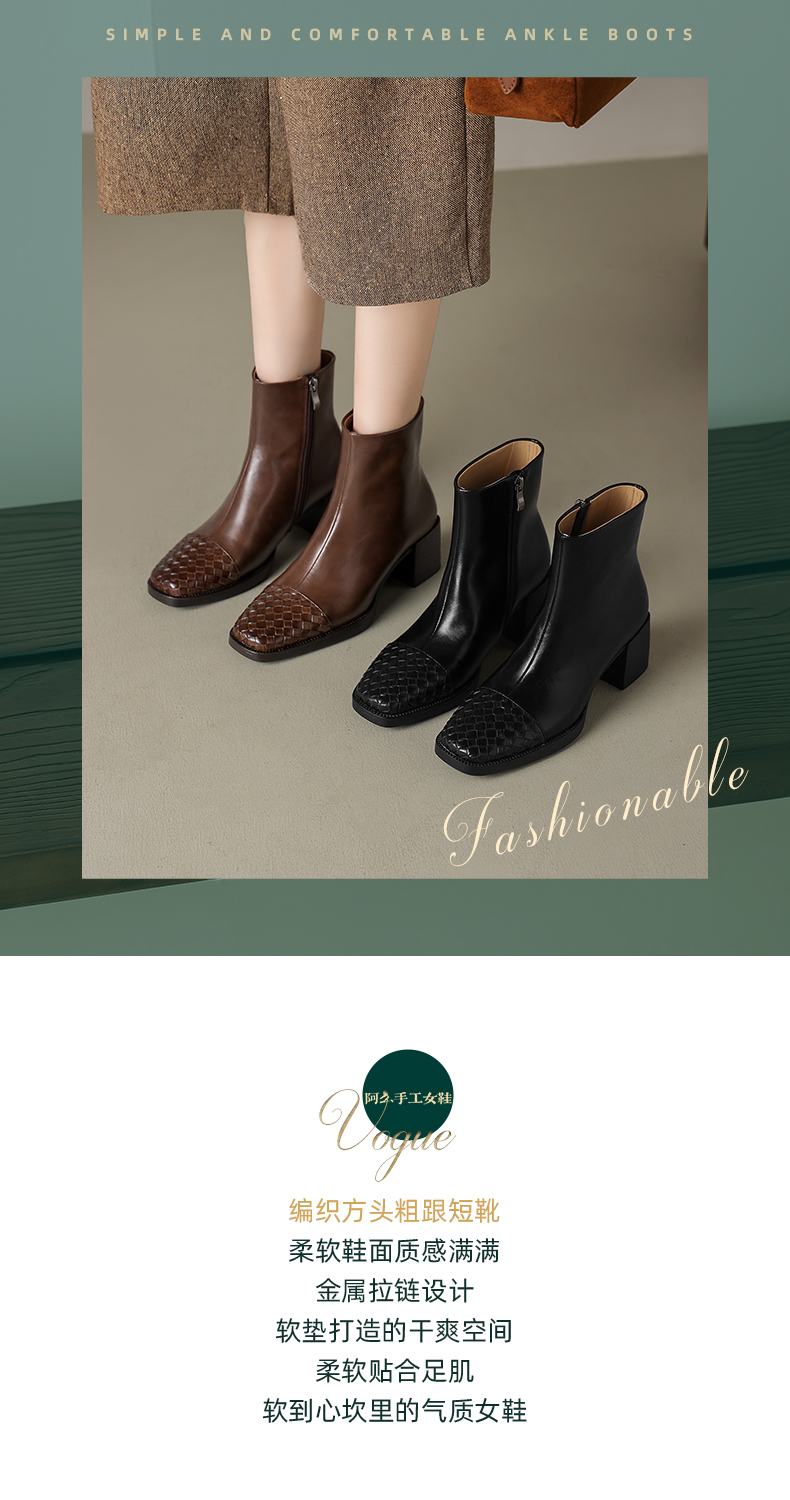 阿么手工女鞋2025新款编织方头短靴2025新款复古真皮粗跟靴子6CM