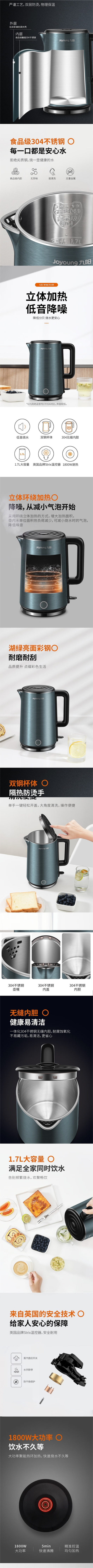九阳(13215)(Joyoung) 电水壶家用1.7L低音烧水壶自动断电食品级304双层钢杯体开水煲K17FD-W750