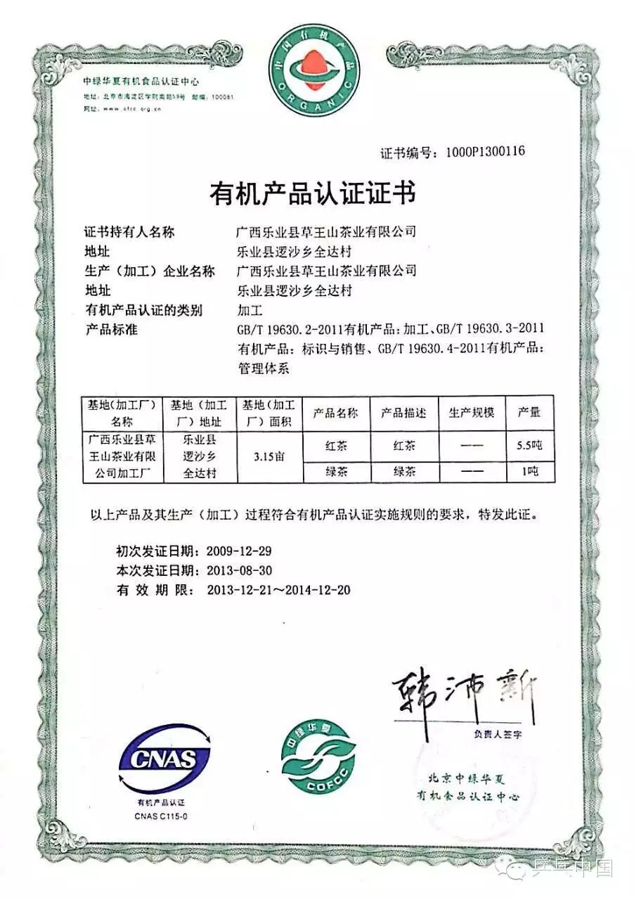 茶场种植优质有机茶3300亩,已获得国家农业部北京中绿华夏有机食品认证中心(COFCC)的有机产品认证及欧盟有机认证(EU)(2009年认证已经连续认证13年)获得难得的HACCP认证。