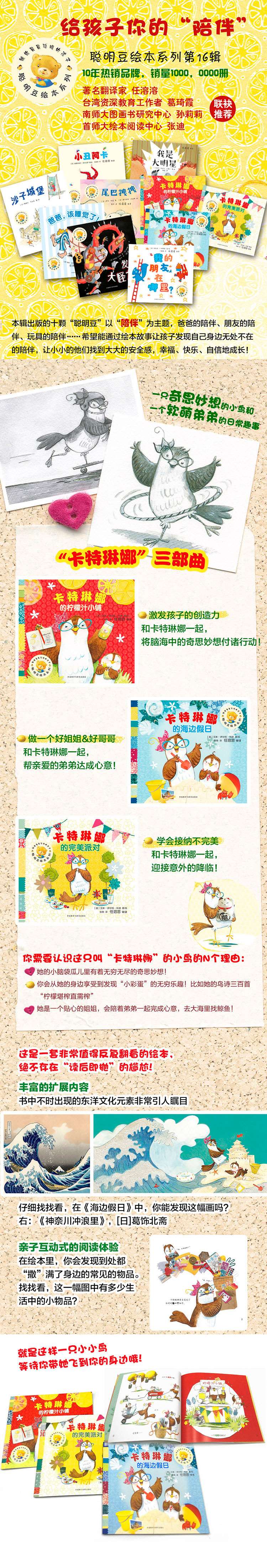 《聪明豆绘本系列16》的十颗“ 聪明豆”以“陪伴”为主题,亲人的陪伴、朋友的陪伴、玩具的陪伴……我们希望能通过绘本故事让孩子发现自己身边无处不在的陪伴,让小小的他们找到大大的安全感,幸福、快乐、自信地成长!书中的文字由翻译家任溶溶执笔润色,语言优美而风趣;书后有绘本专家极富启发与思辨的点评文章,读来回味悠长。