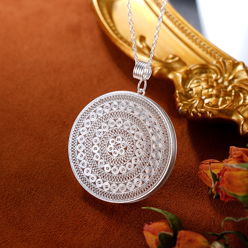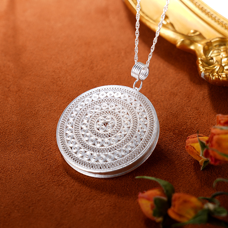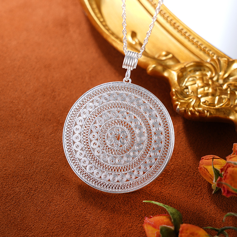 【寓意】:吊坠灵感源自太阳鼓,运用银花丝工艺编织经典圆环造型,寓意平安吉祥、五谷丰登。