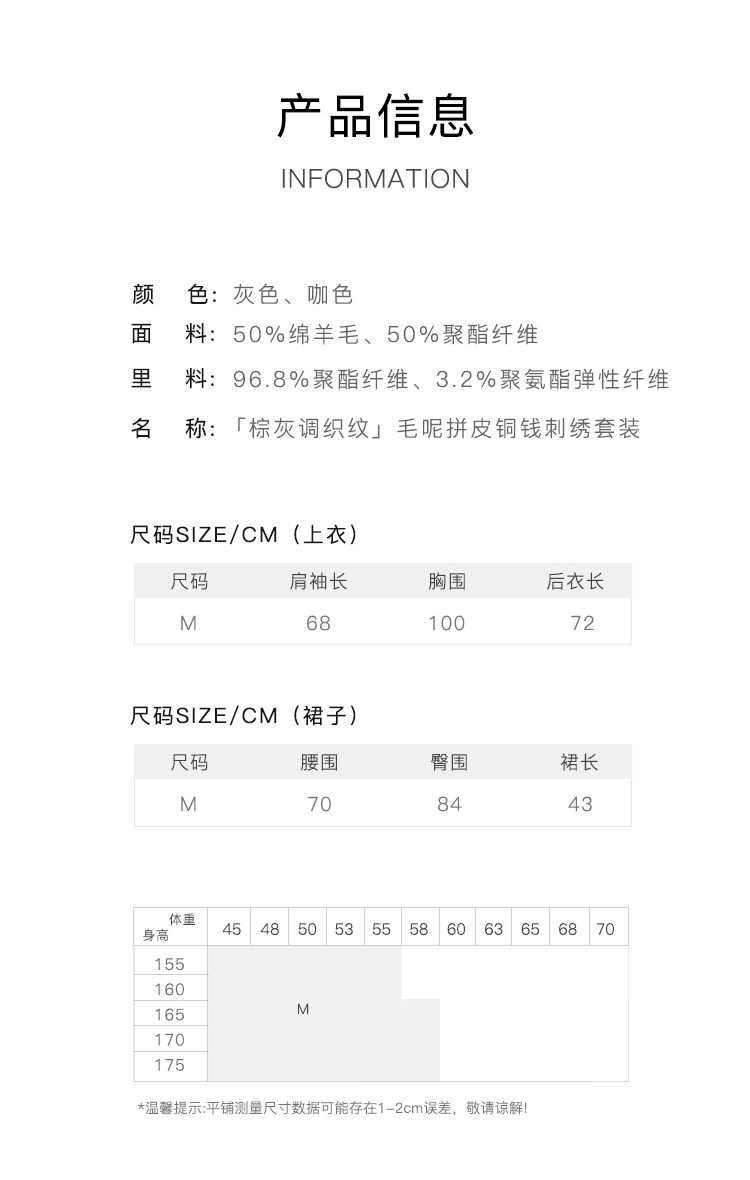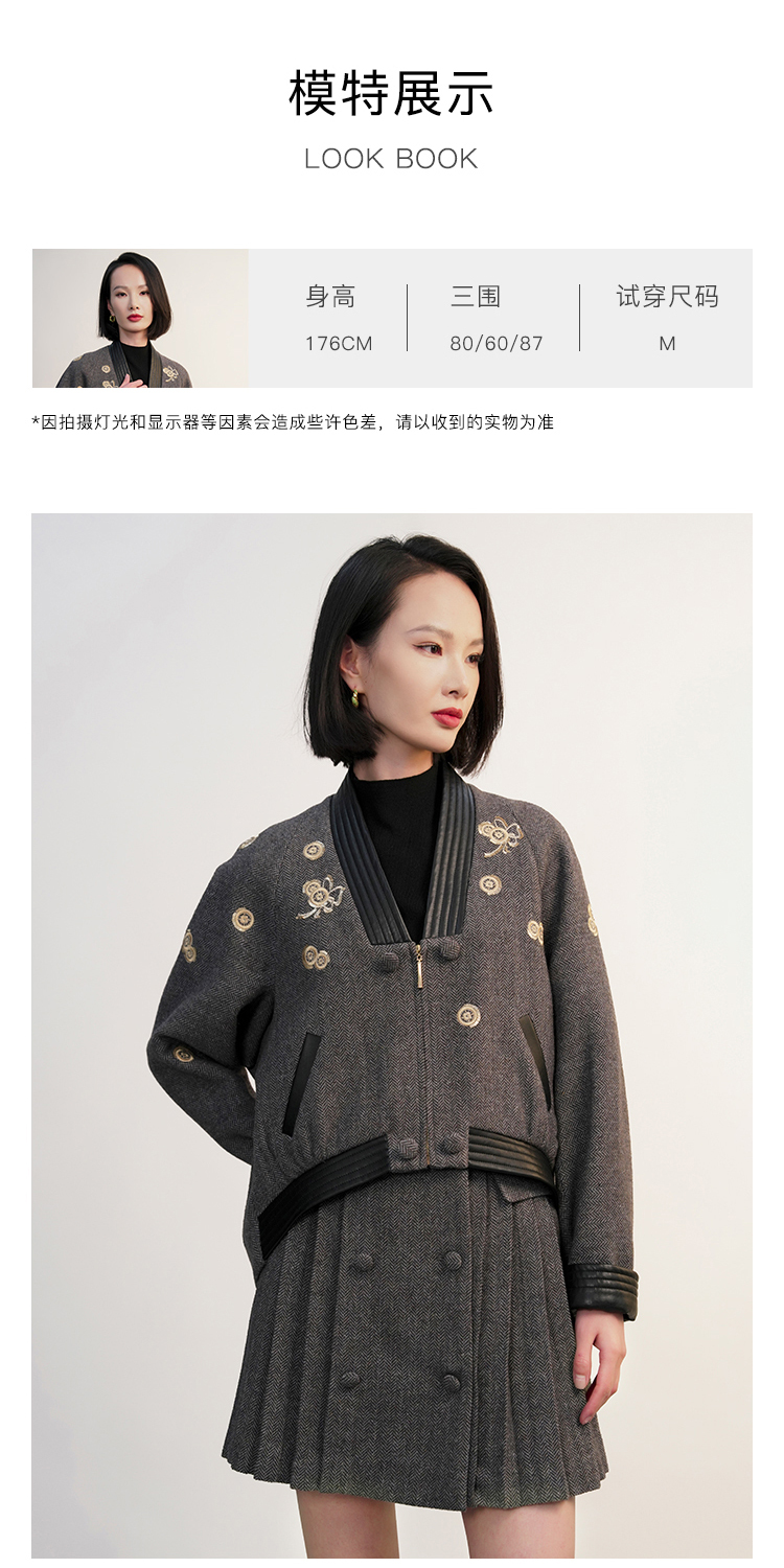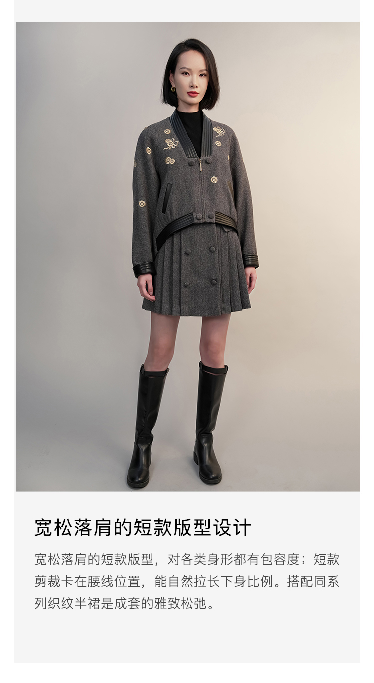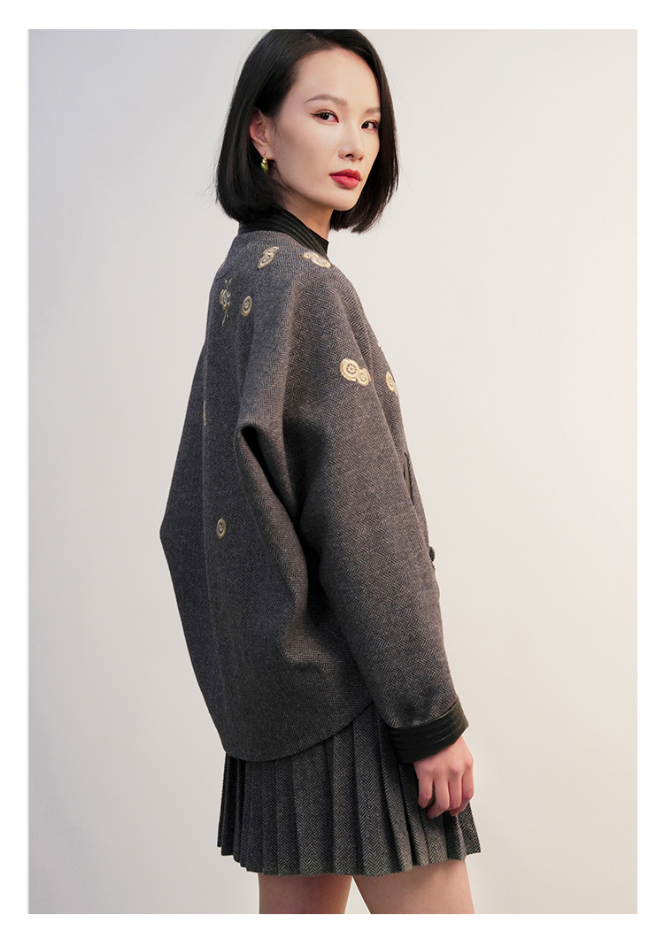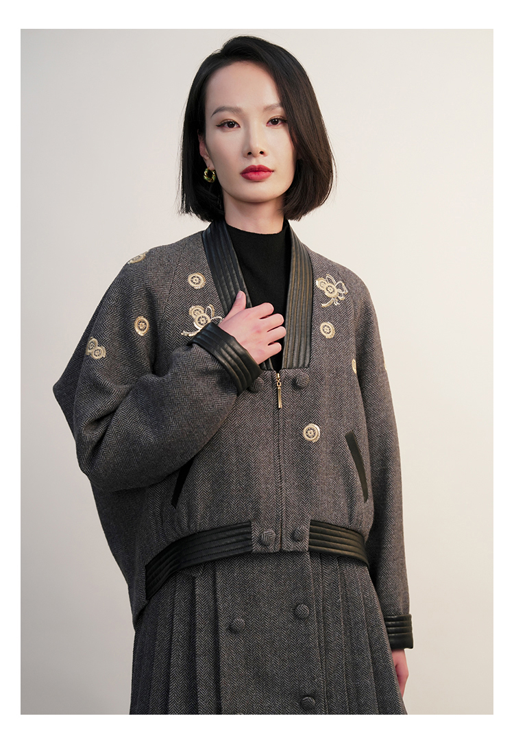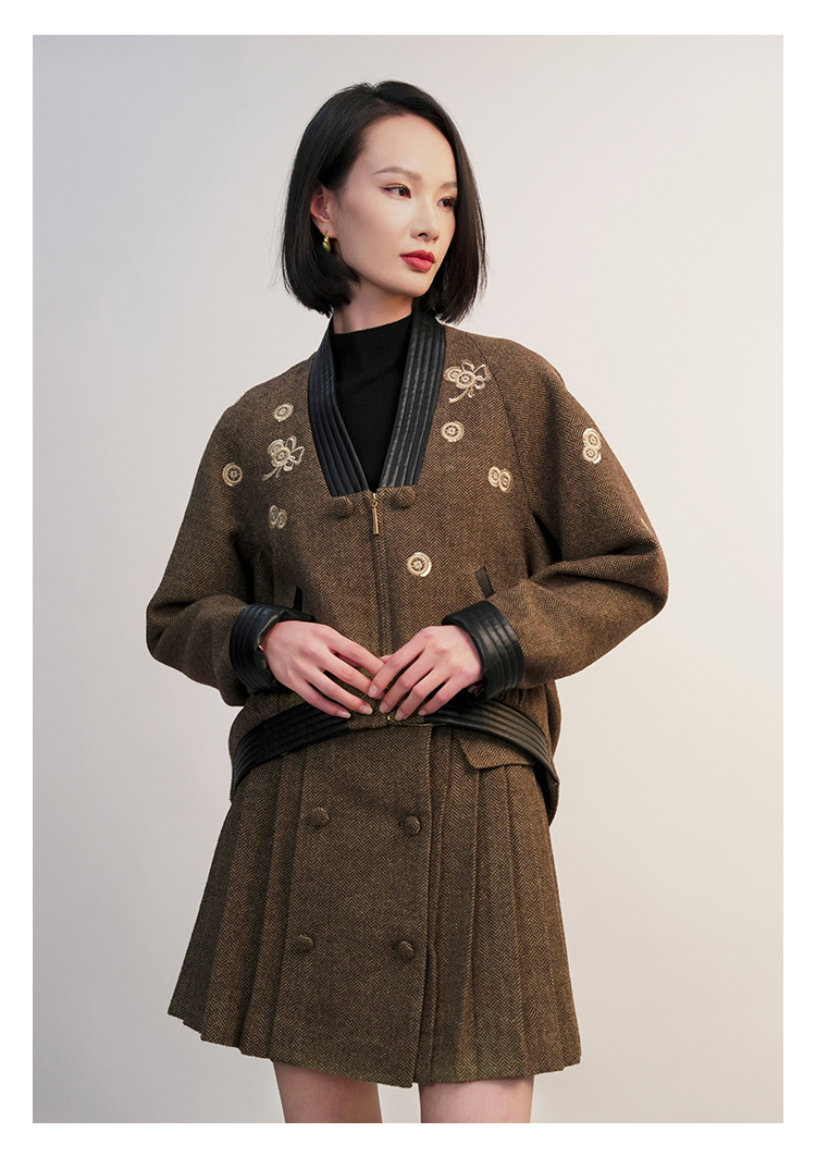 郭培成衣RSG「棕灰调织纹」毛呢拼皮铜钱刺绣套装2025秋冬新品