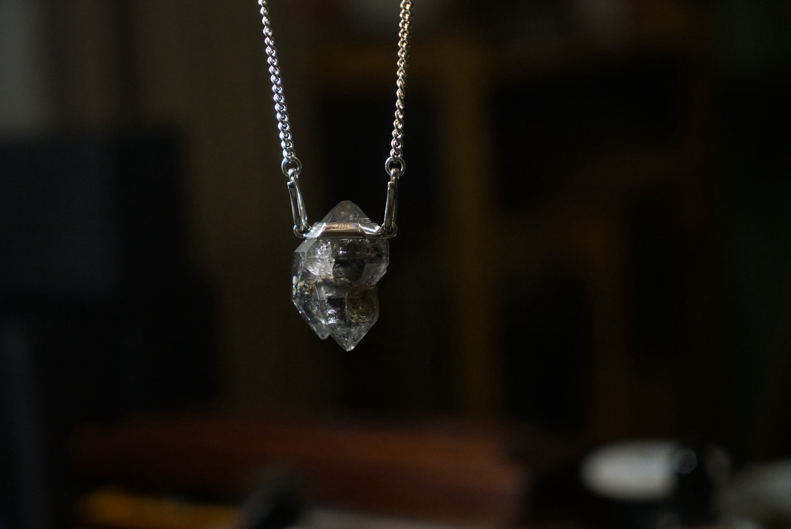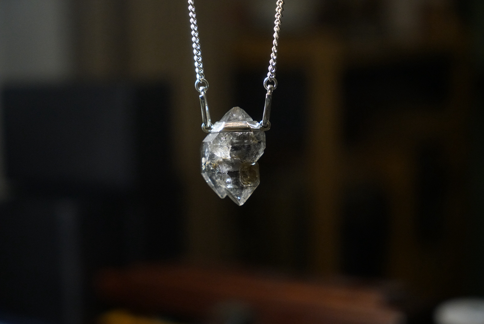 形成良好的双头水晶形态较饱满圆润,呈粒状,因多产于美国纽约州赫尔基蒙,故又名赫尔基蒙水晶。其结晶形式与钻石一样,在整粒水晶结晶体中呈现八面的天然切面,所以配有钻石的名称。