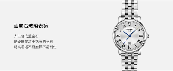 镜面 材质 | 蓝宝石水晶玻璃 | 表盘 | 精钢表壳 银色表盘 大三针 日期显示 罗马数字刻度时标 |