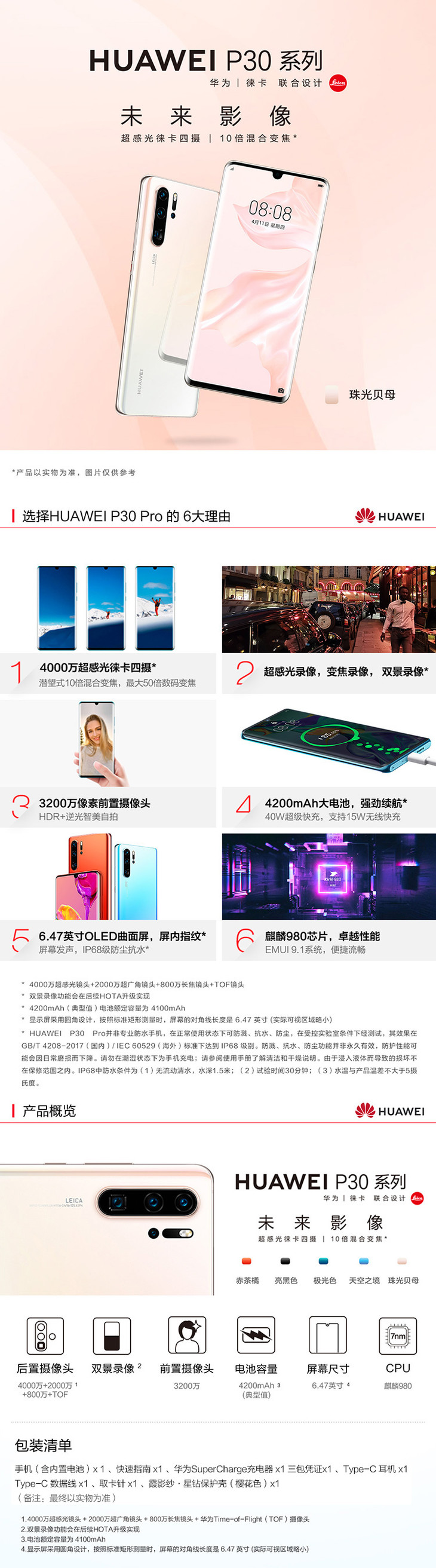 <国行正品>HUAWEI P30 Pro 超感光徕卡四摄10倍混合变焦麒麟980芯片屏内指纹 全网通版双4G手机