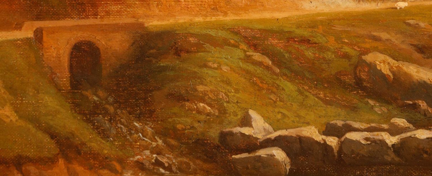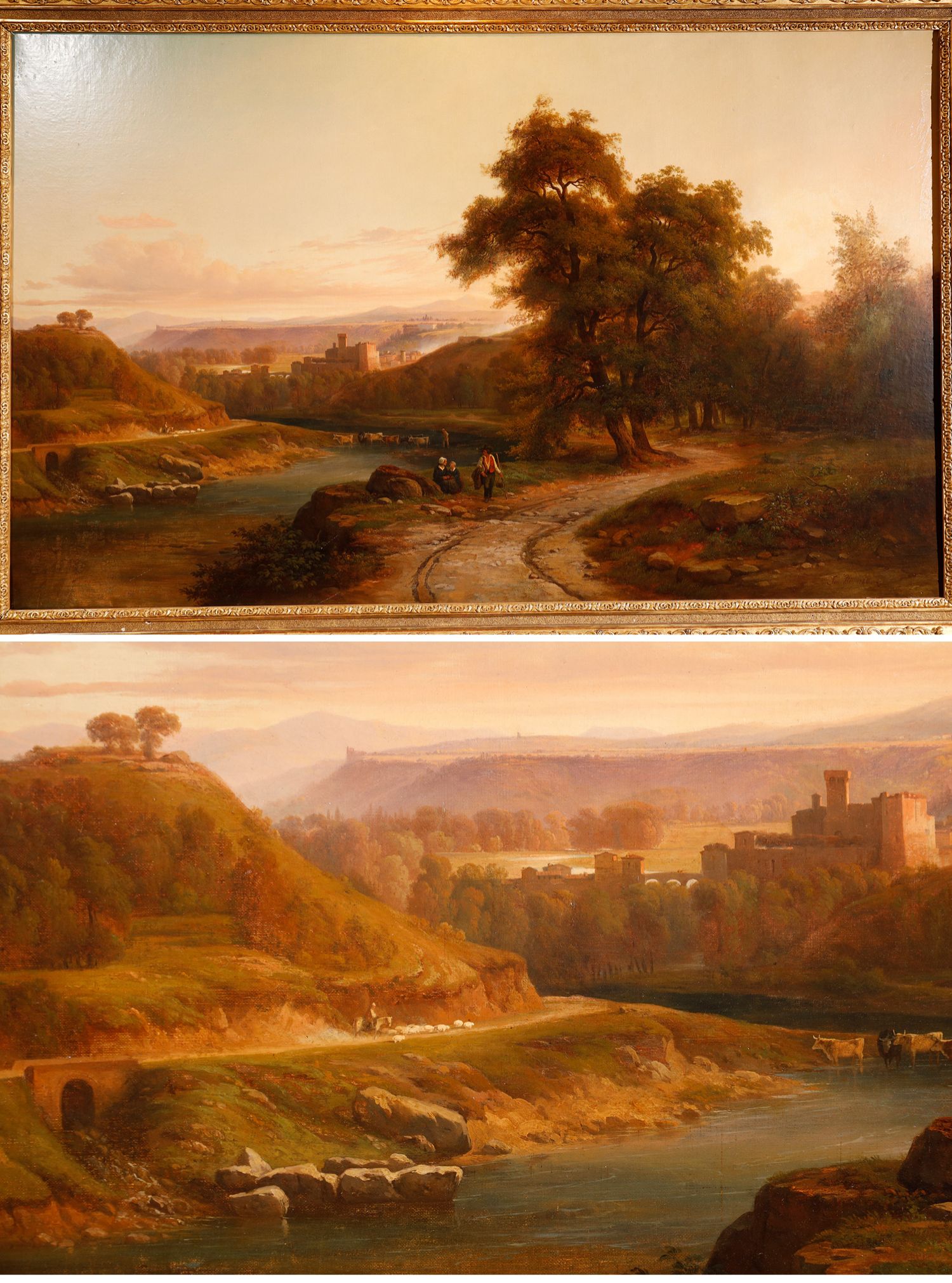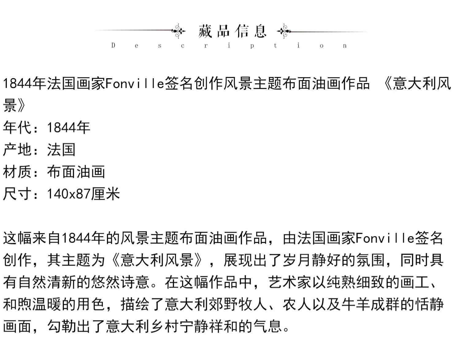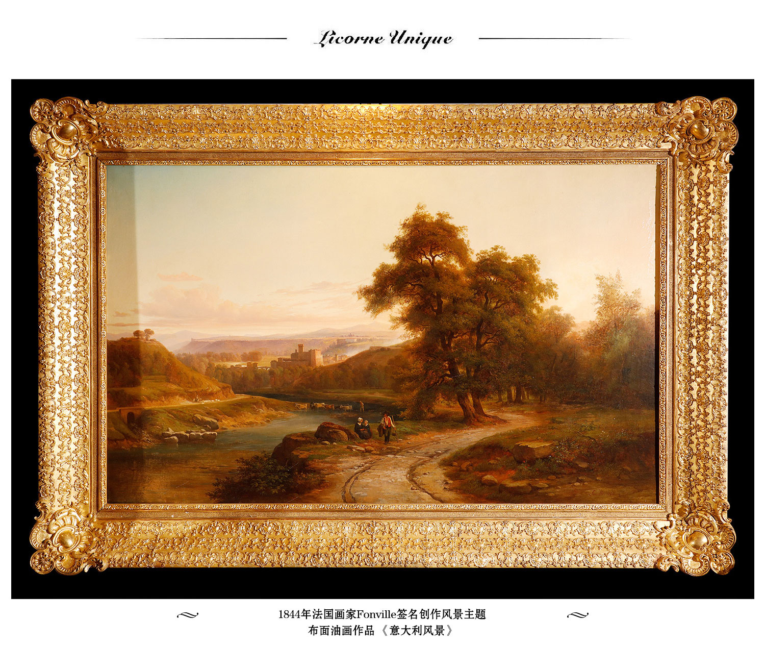 独角鹿西洋古董法国画家Fonville签名风景布面油画《意大利风景》