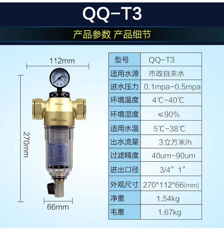 沁园(507449)净水器 家用全屋自来水前置过滤器反冲洗 QQ-T3