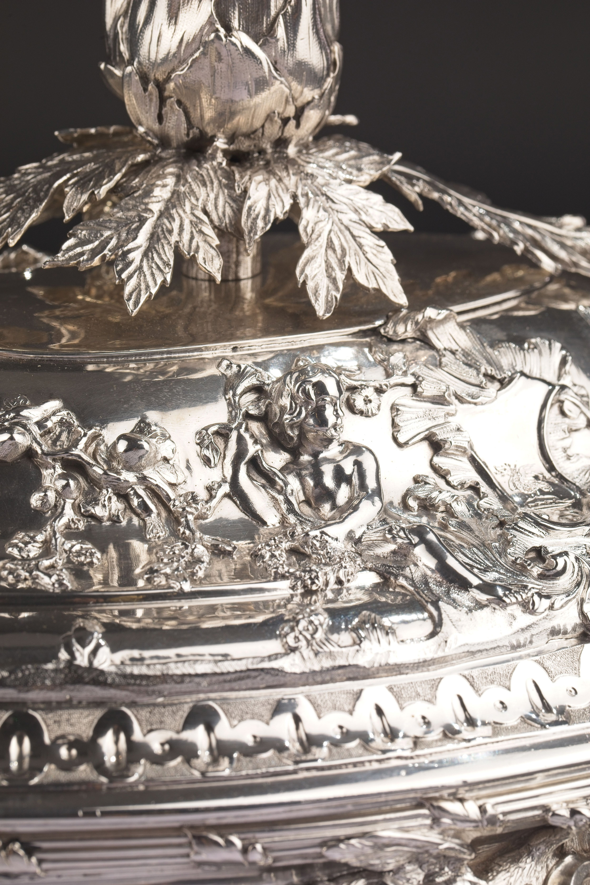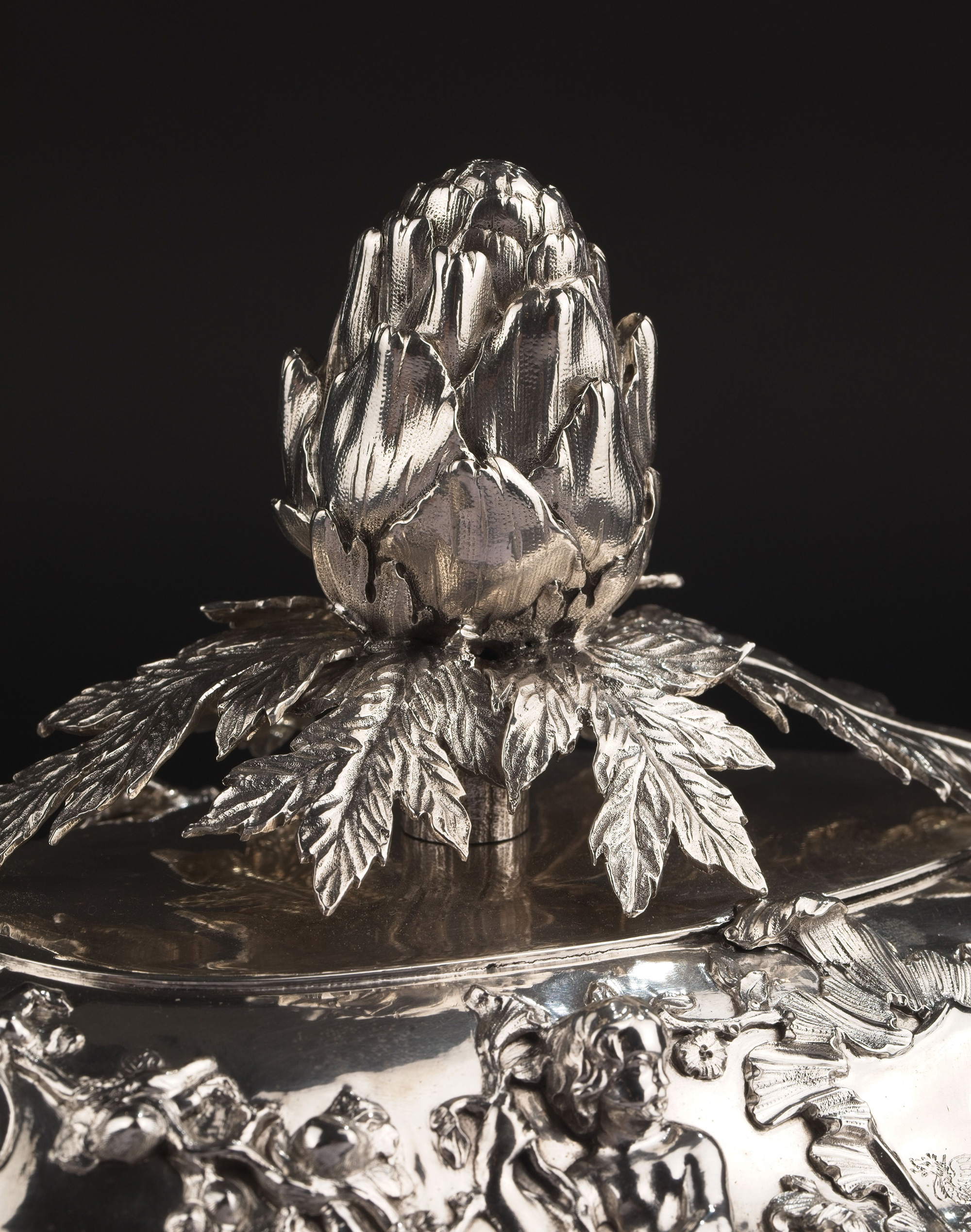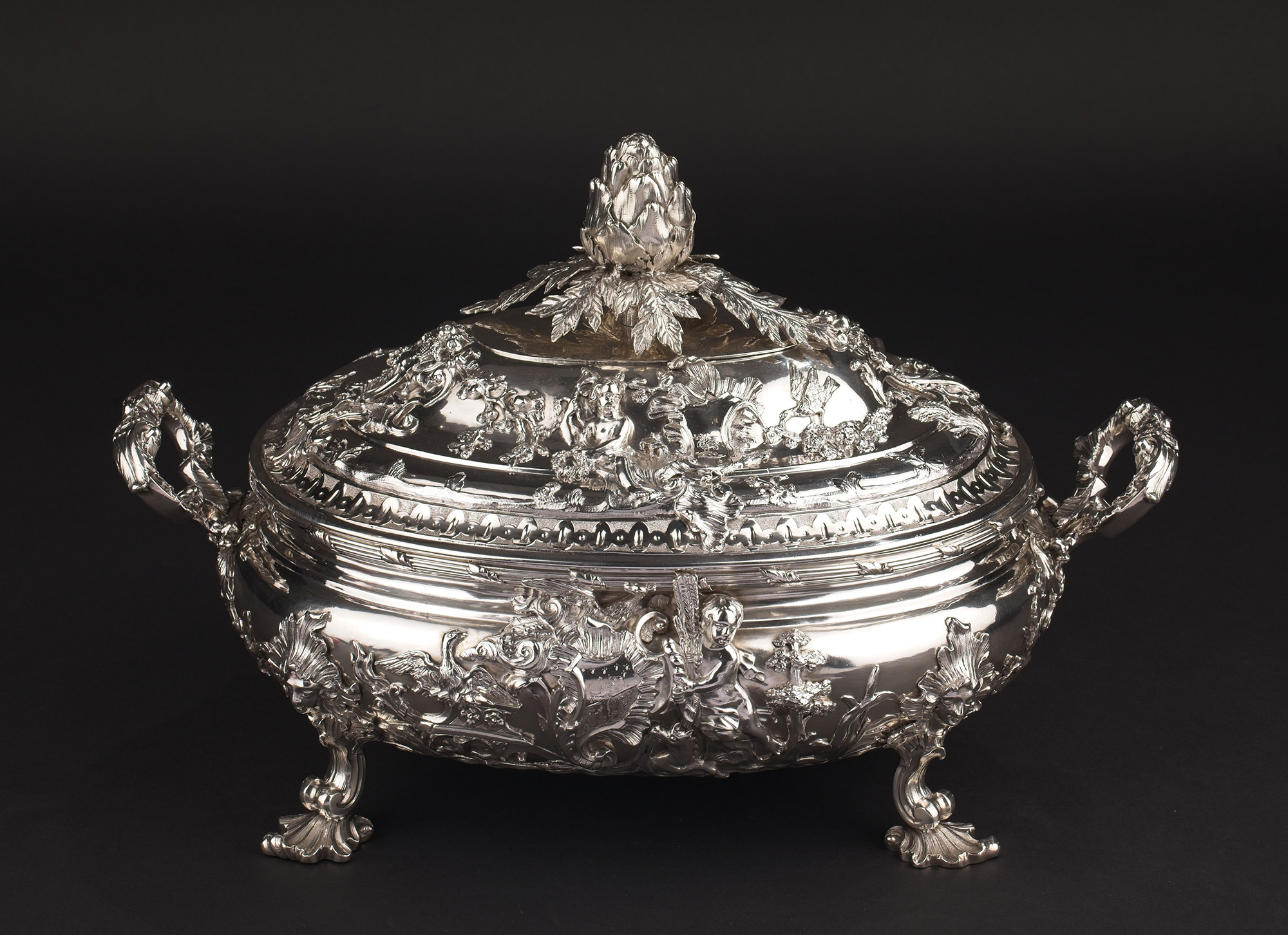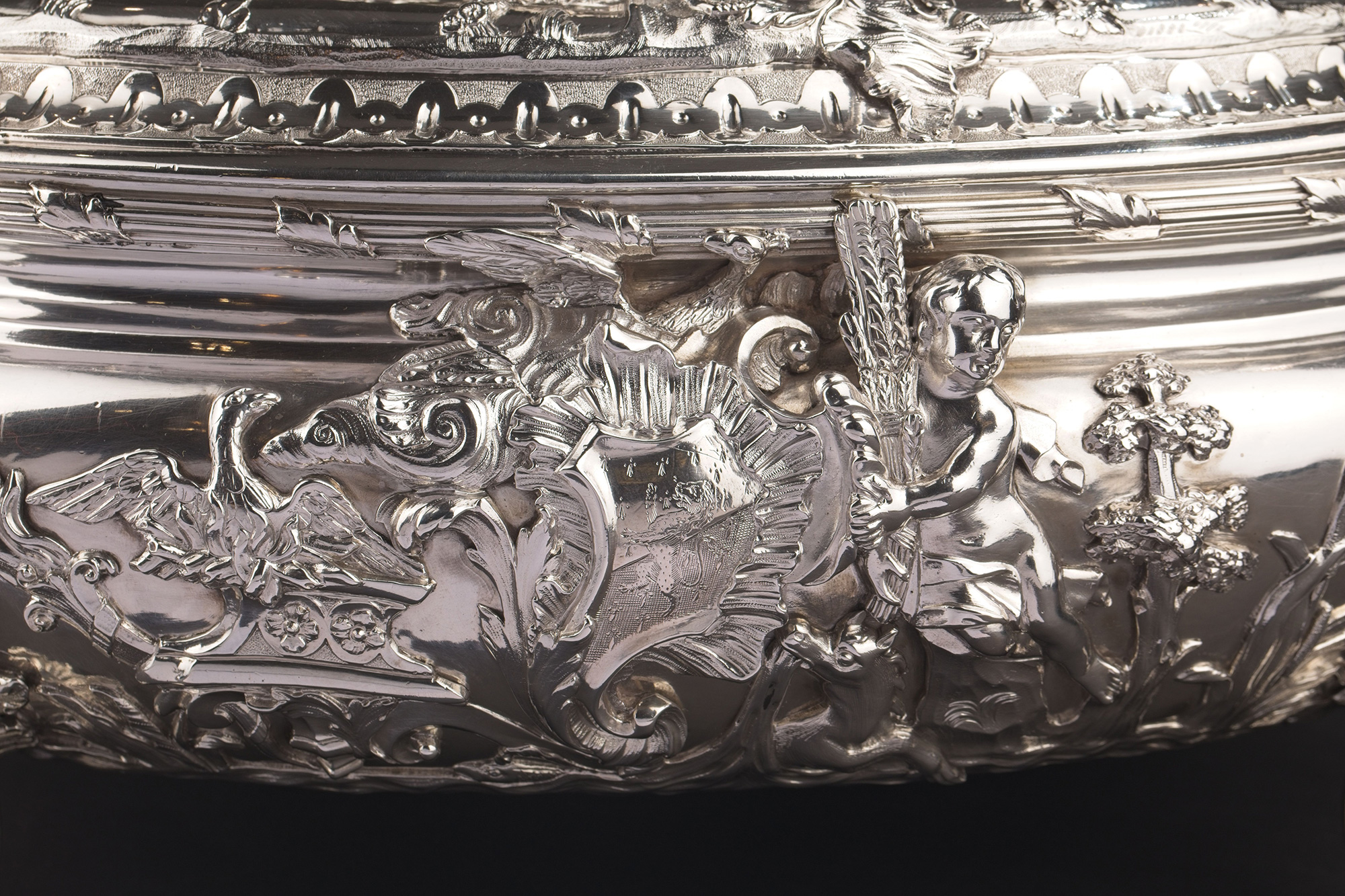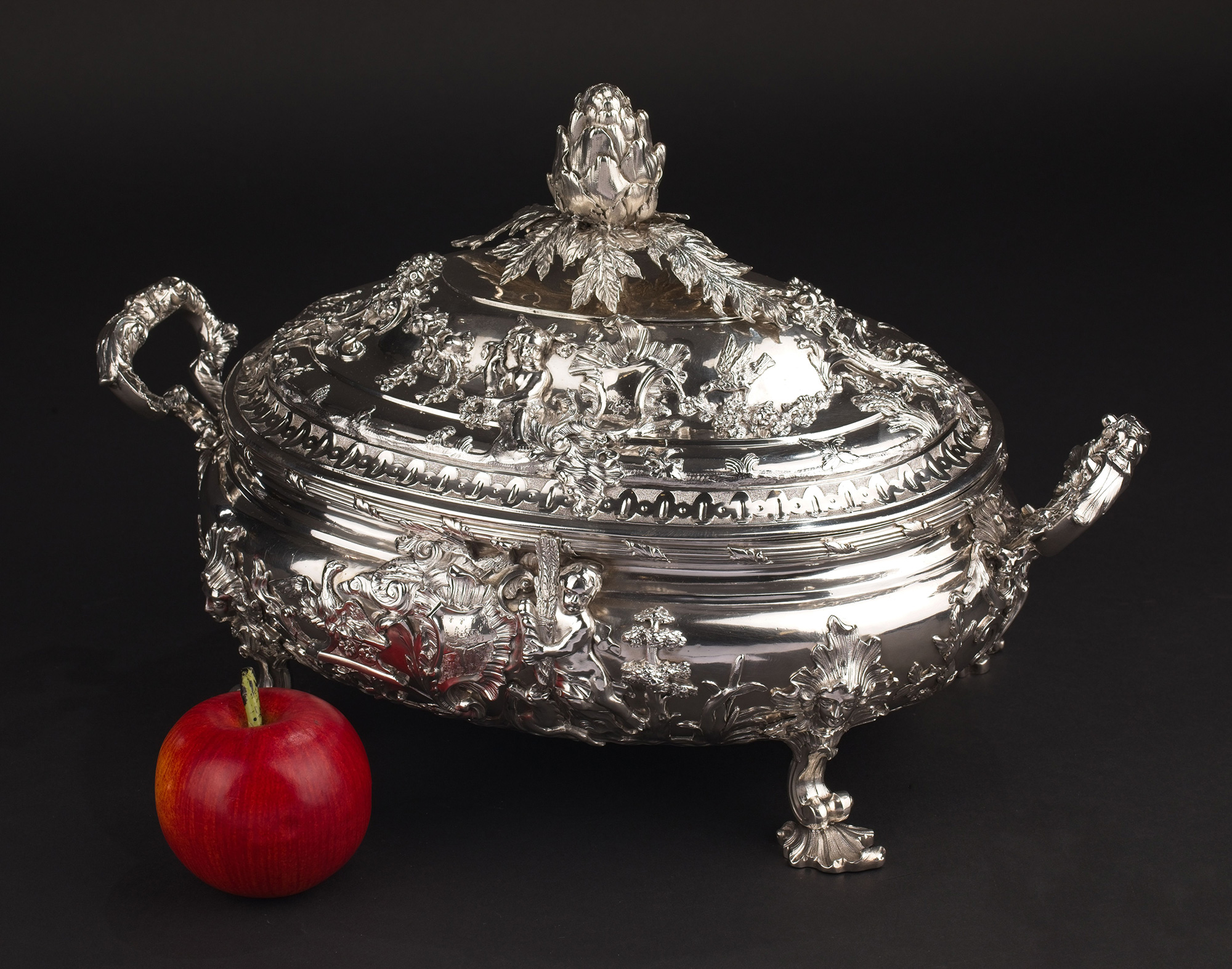 18世纪英国工匠Christian Hillan签名出品路易十五风格花叶缎带及纹章主题纯银精雕双耳带盖餐盅