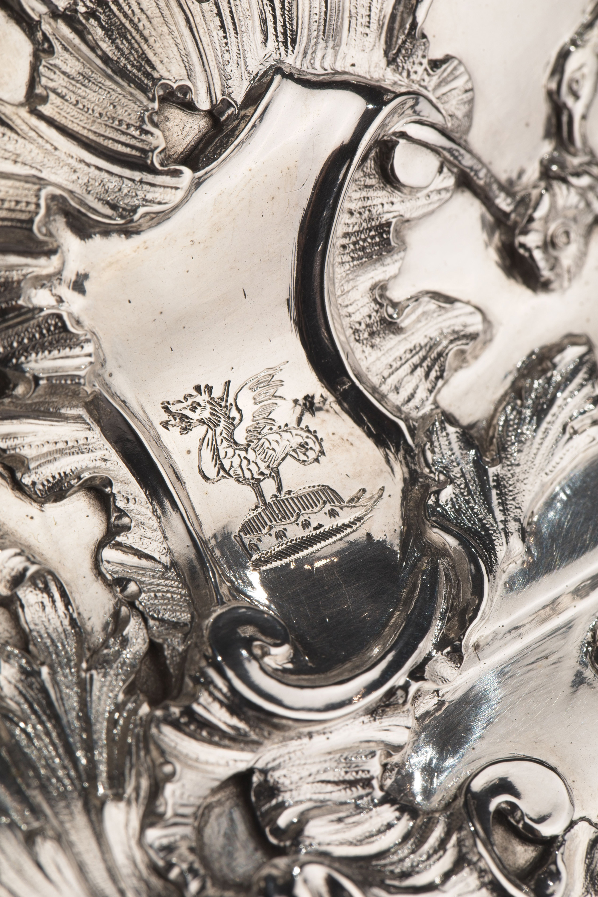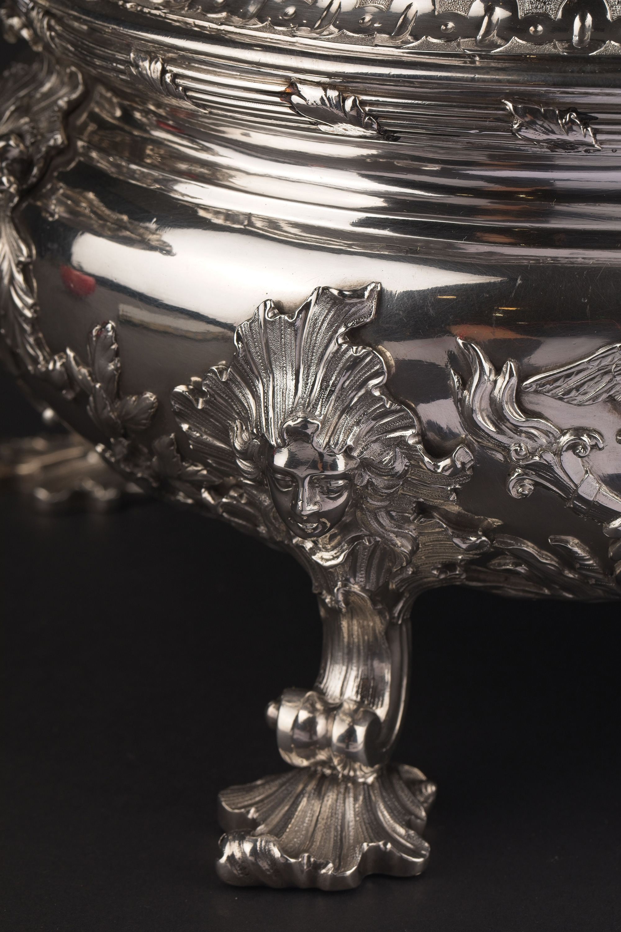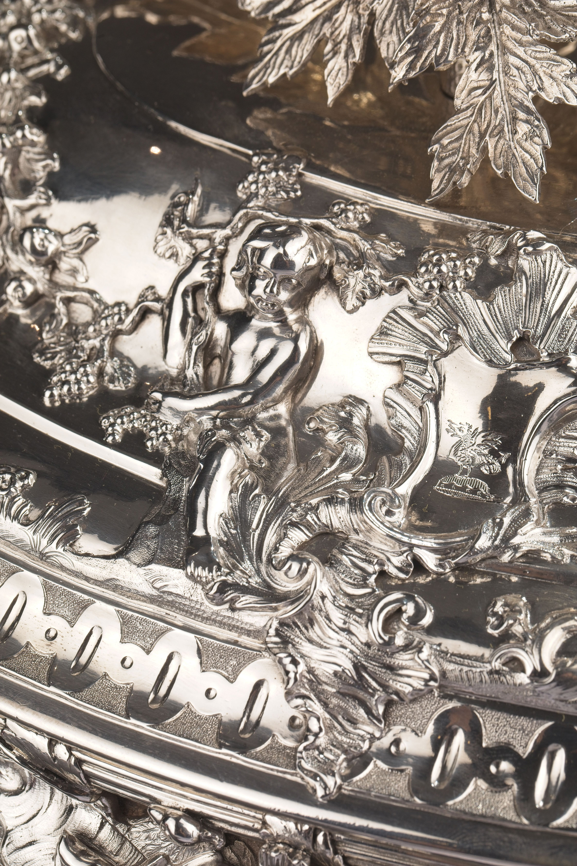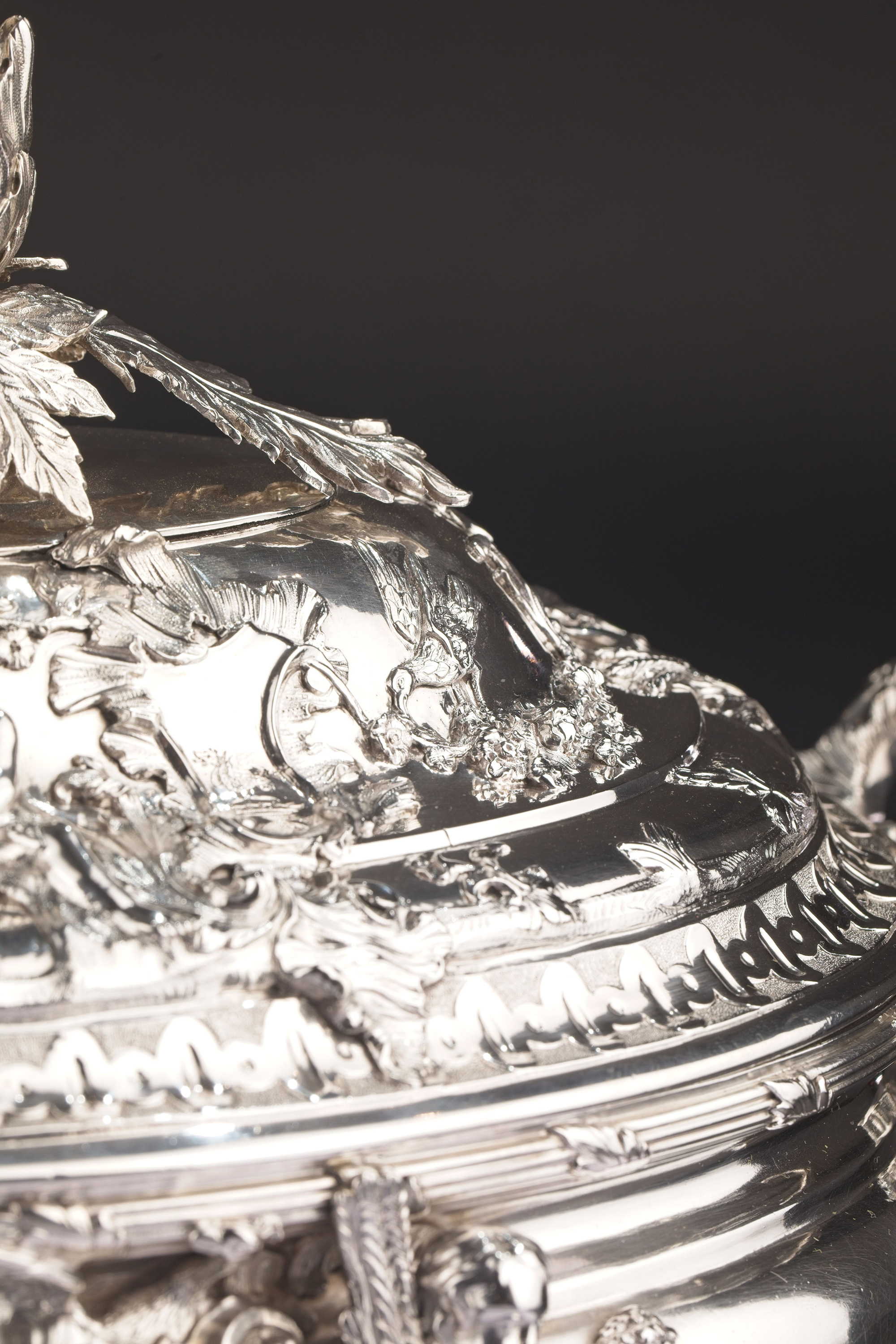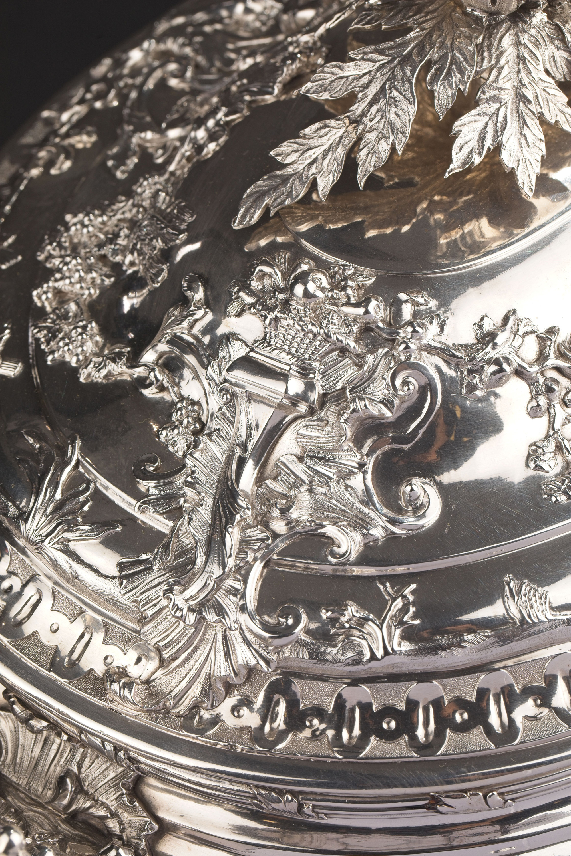 18世纪英国工匠Christian Hillan签名出品路易十五风格花叶缎带及纹章主题纯银精雕双耳带盖餐盅
