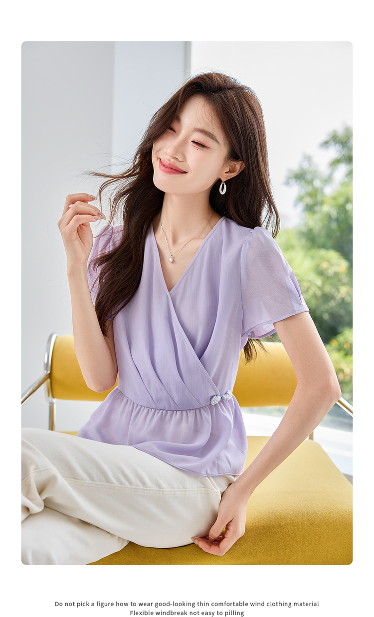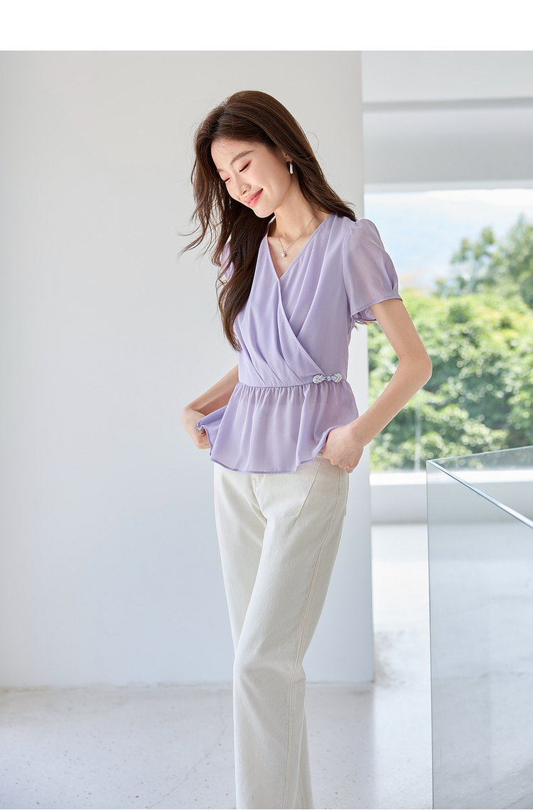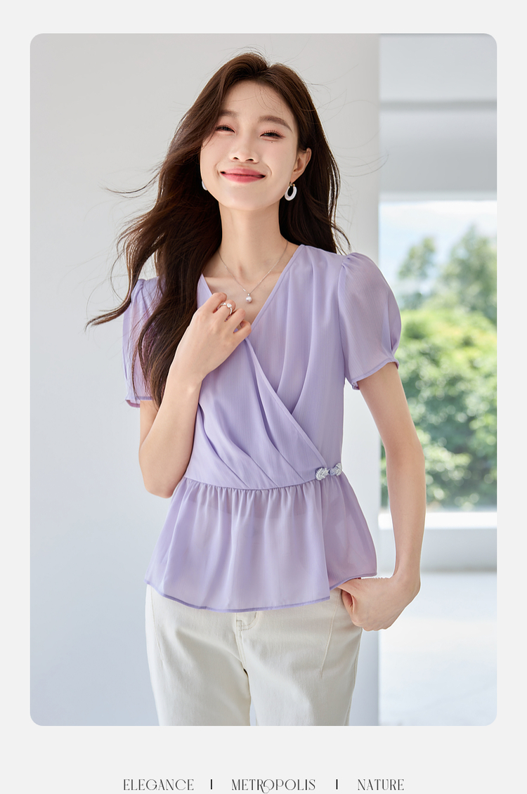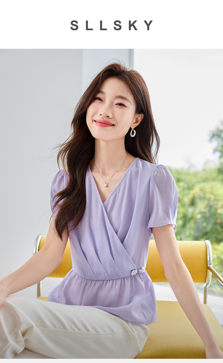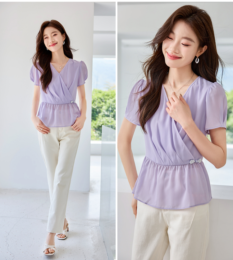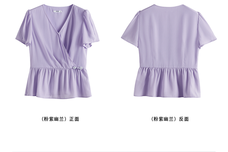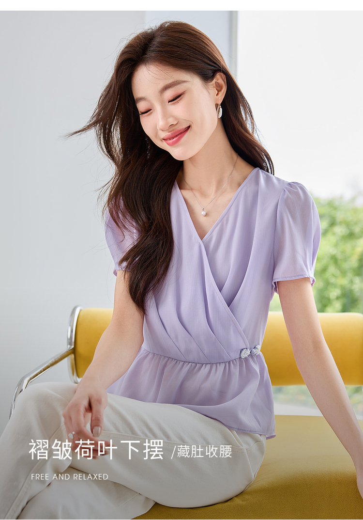 【五折购】熙世界V领短袖雪纺衫夏2025新款复古通勤气质中式盘扣收腰小衫