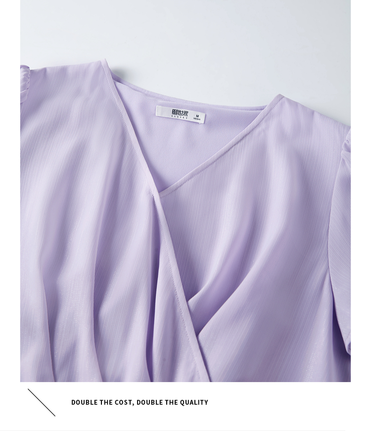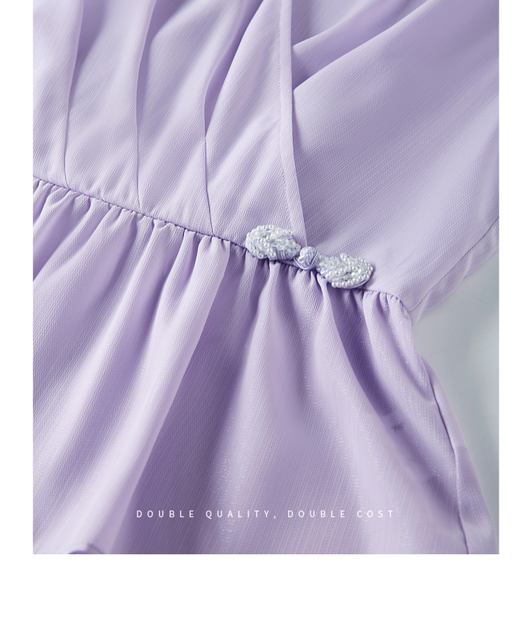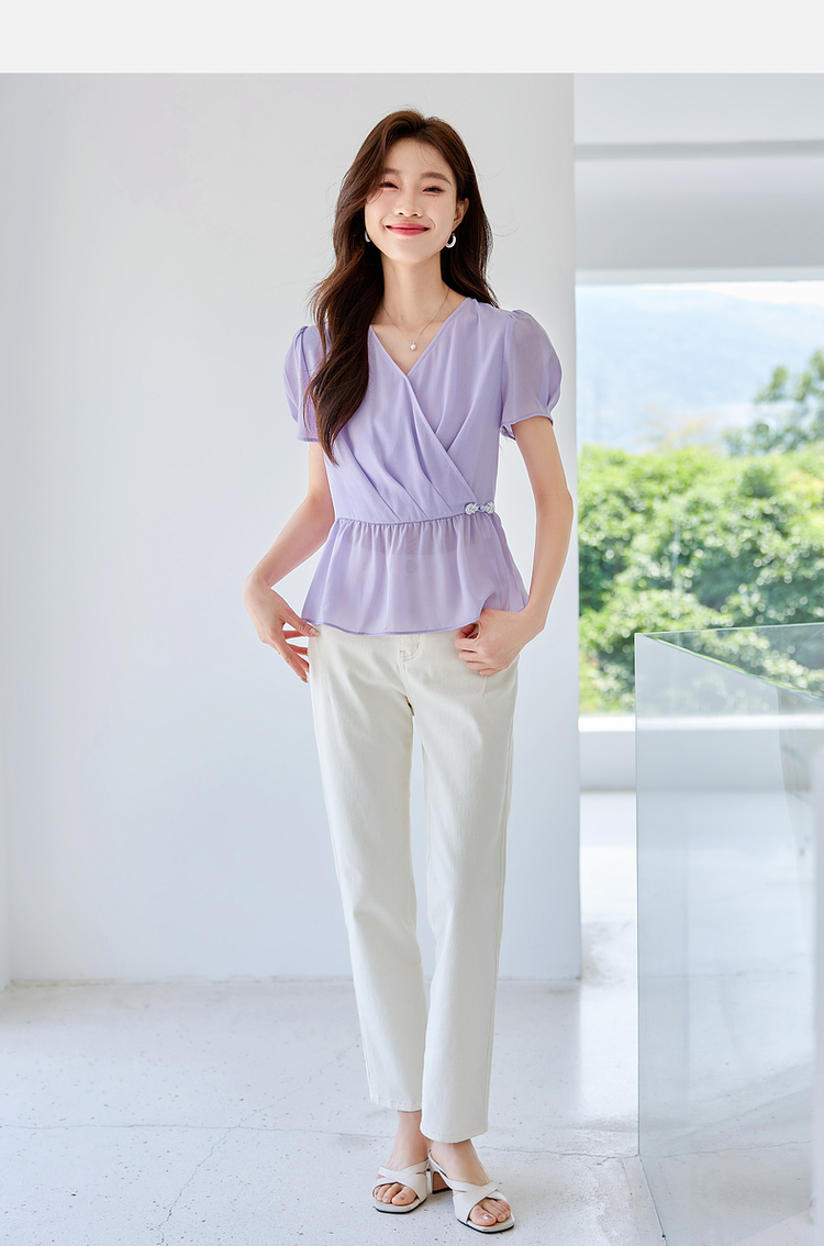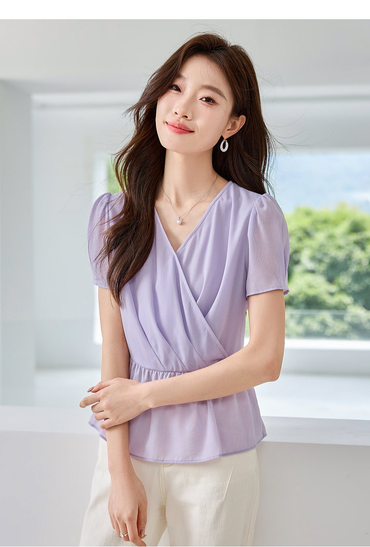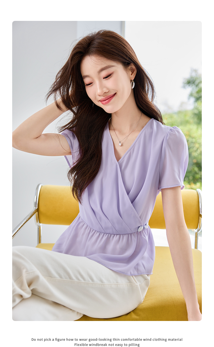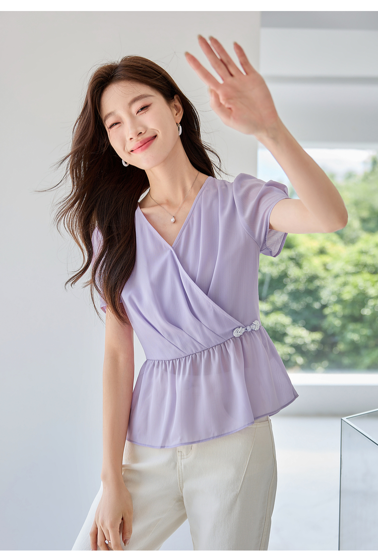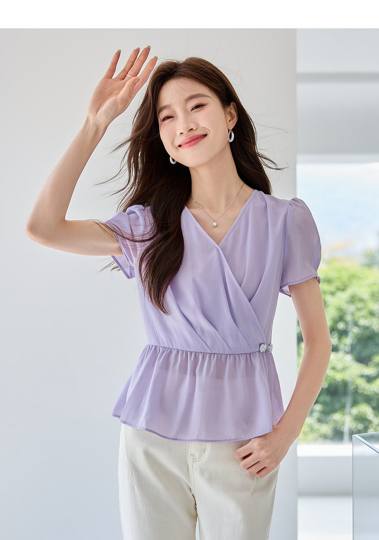 【五折购】熙世界V领短袖雪纺衫夏2025新款复古通勤气质中式盘扣收腰小衫