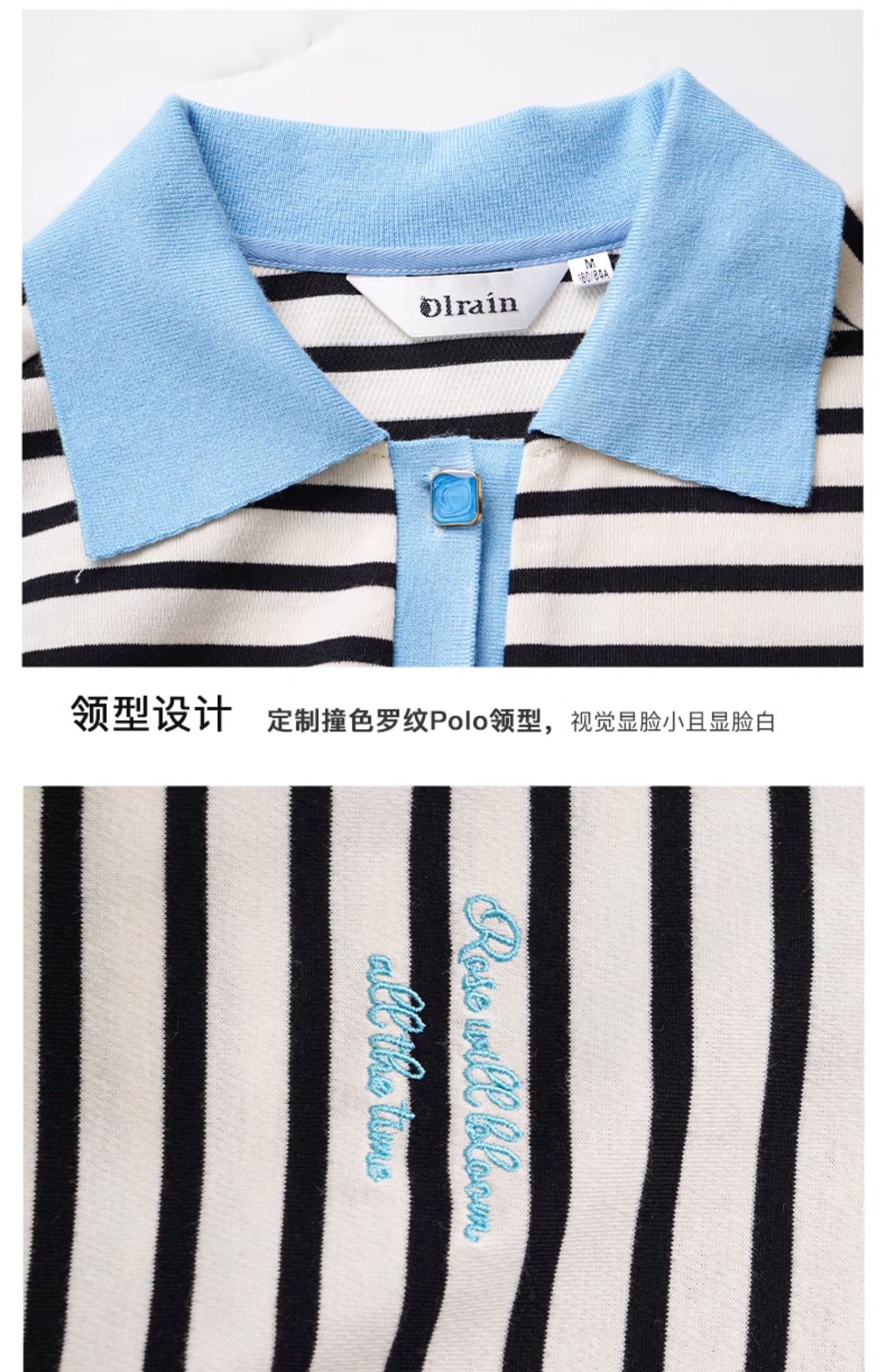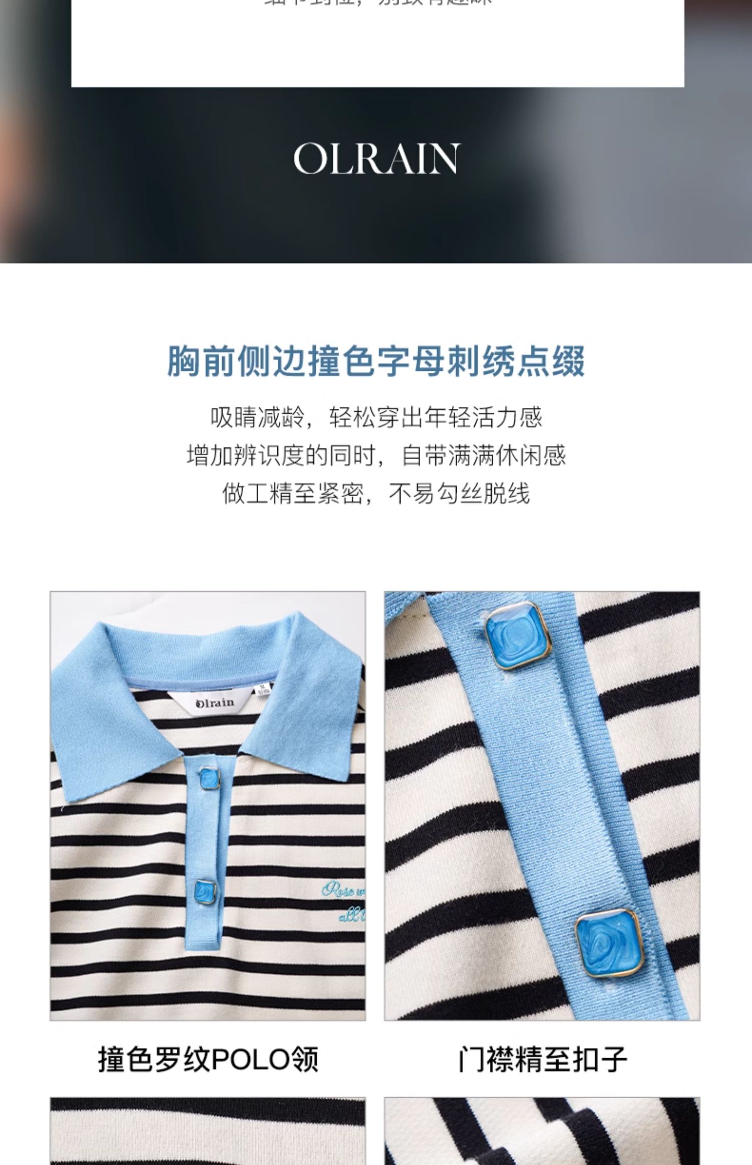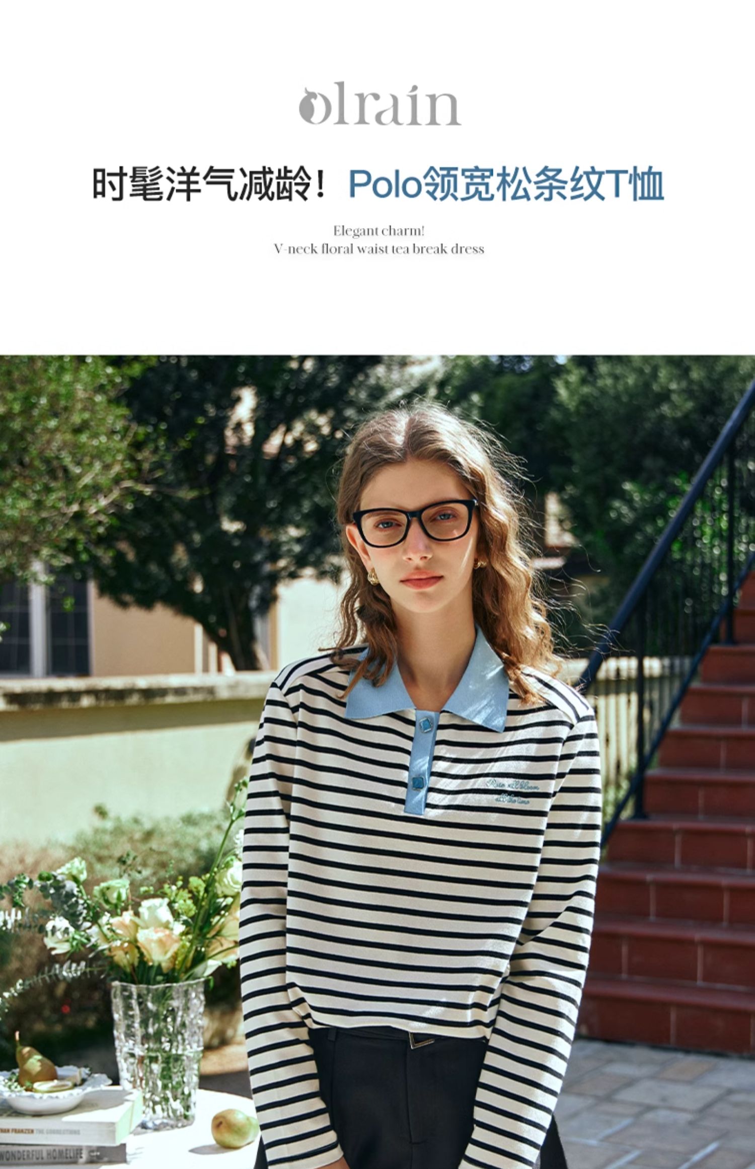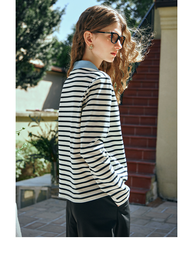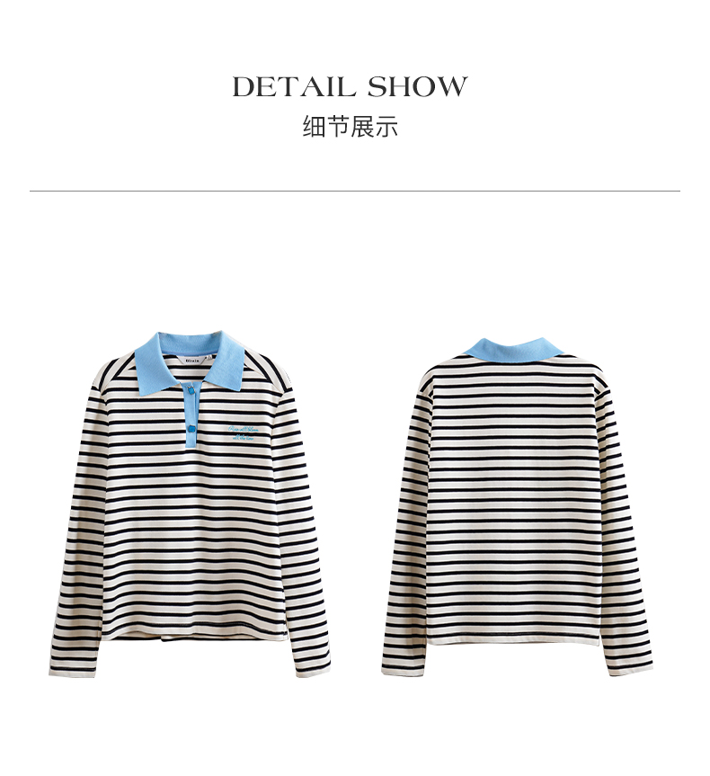 OLrain欧芮儿POLO领长袖T恤女早春2024年新款时尚宽松条纹上衣