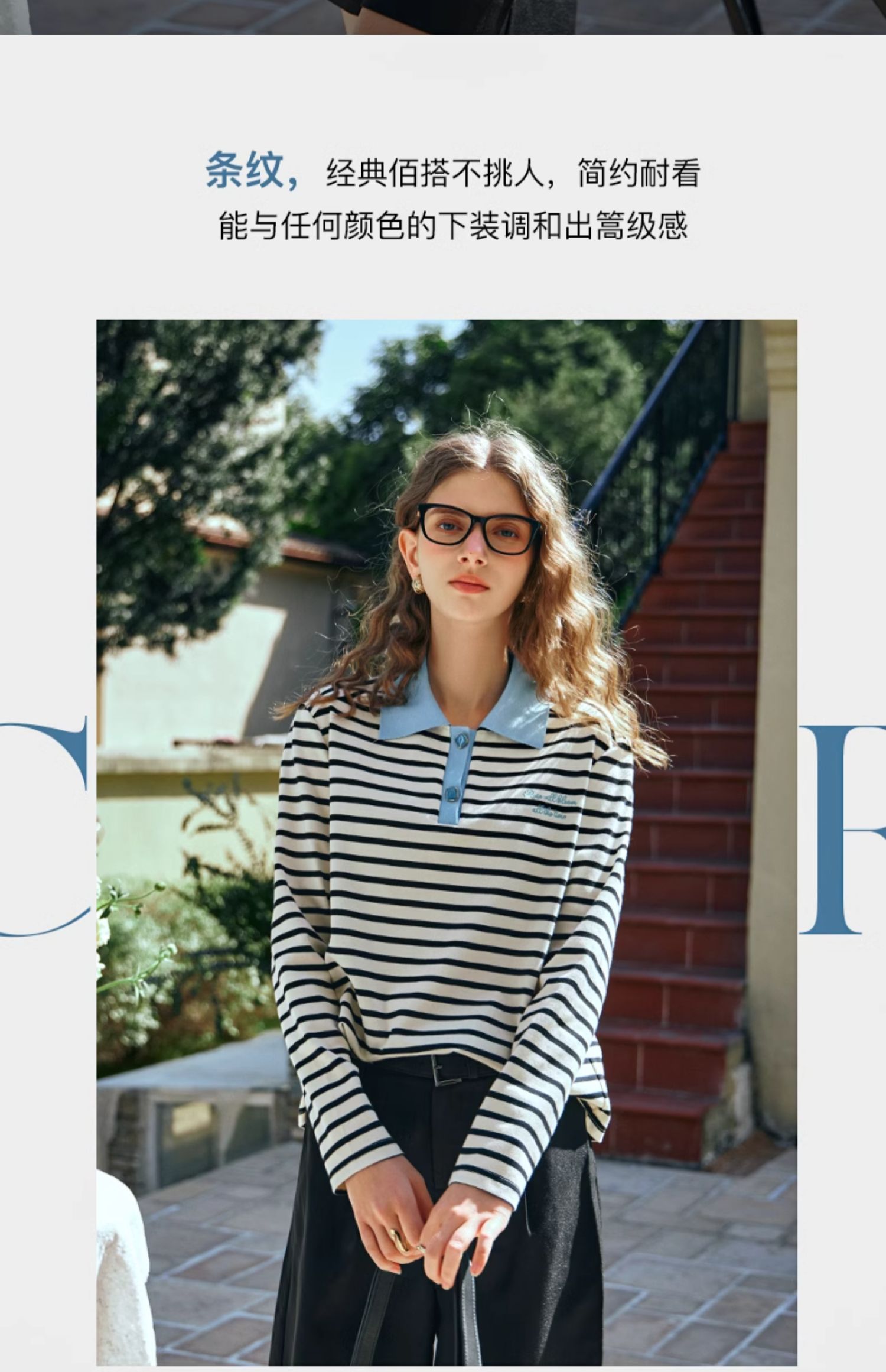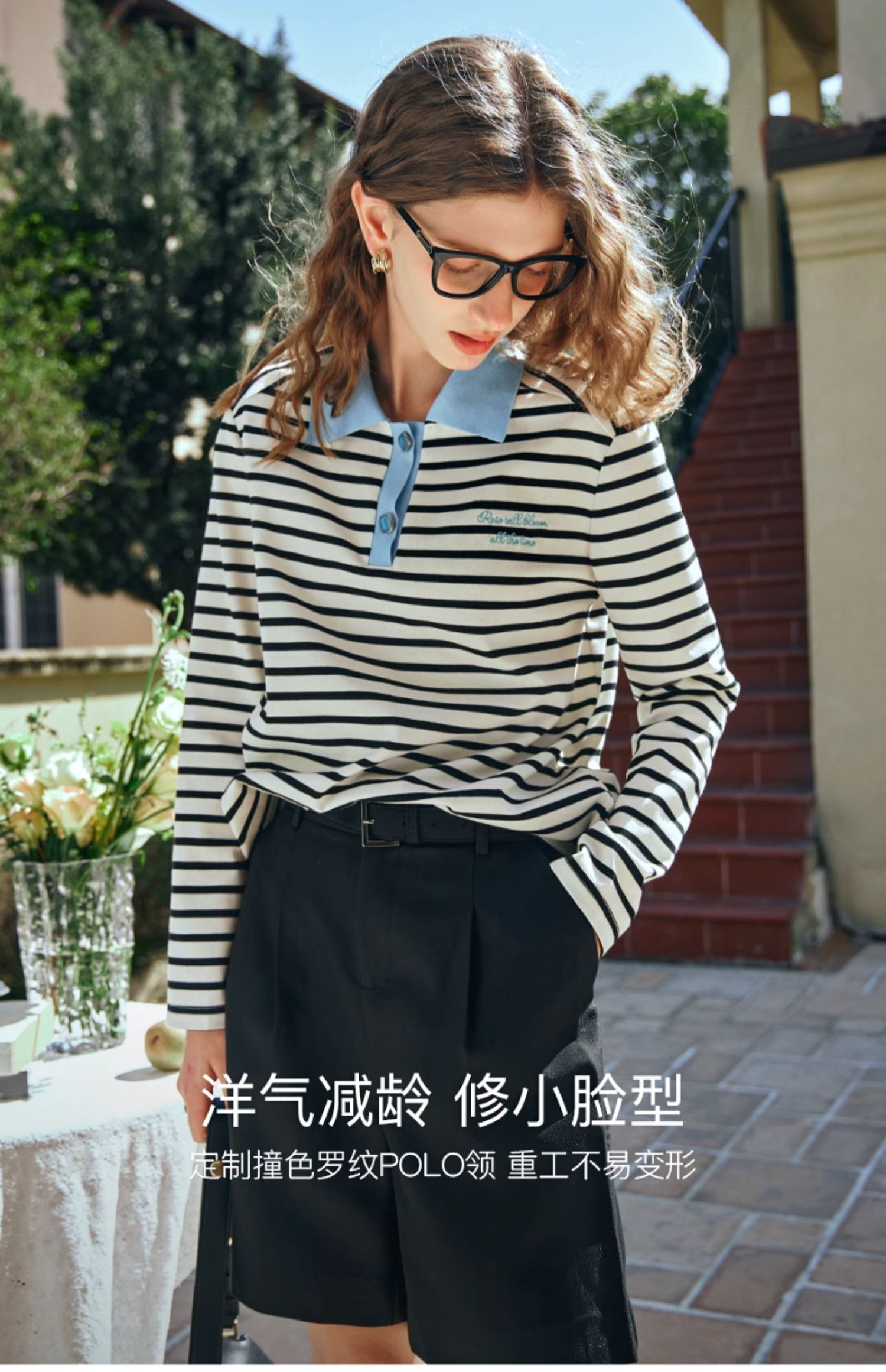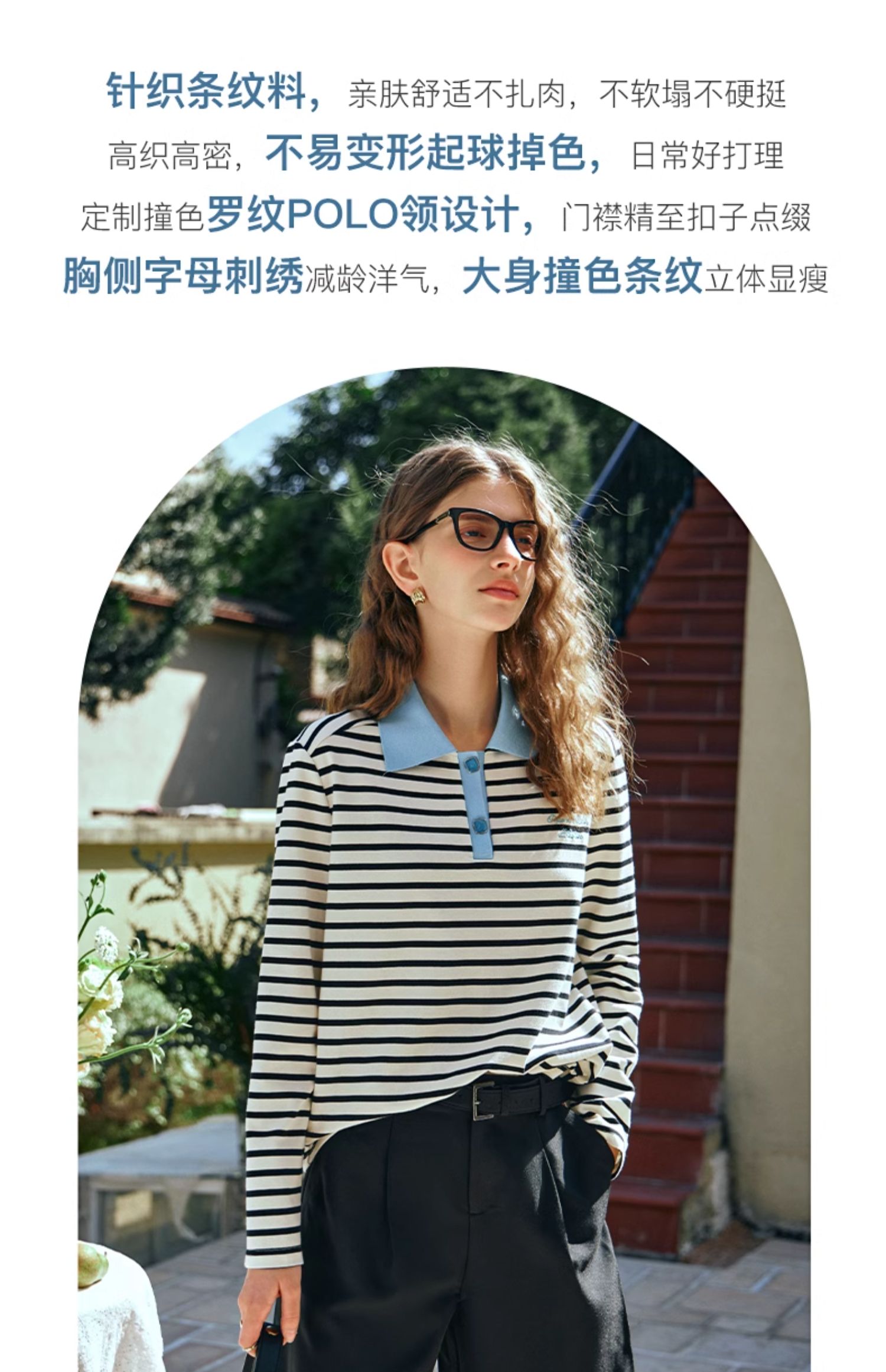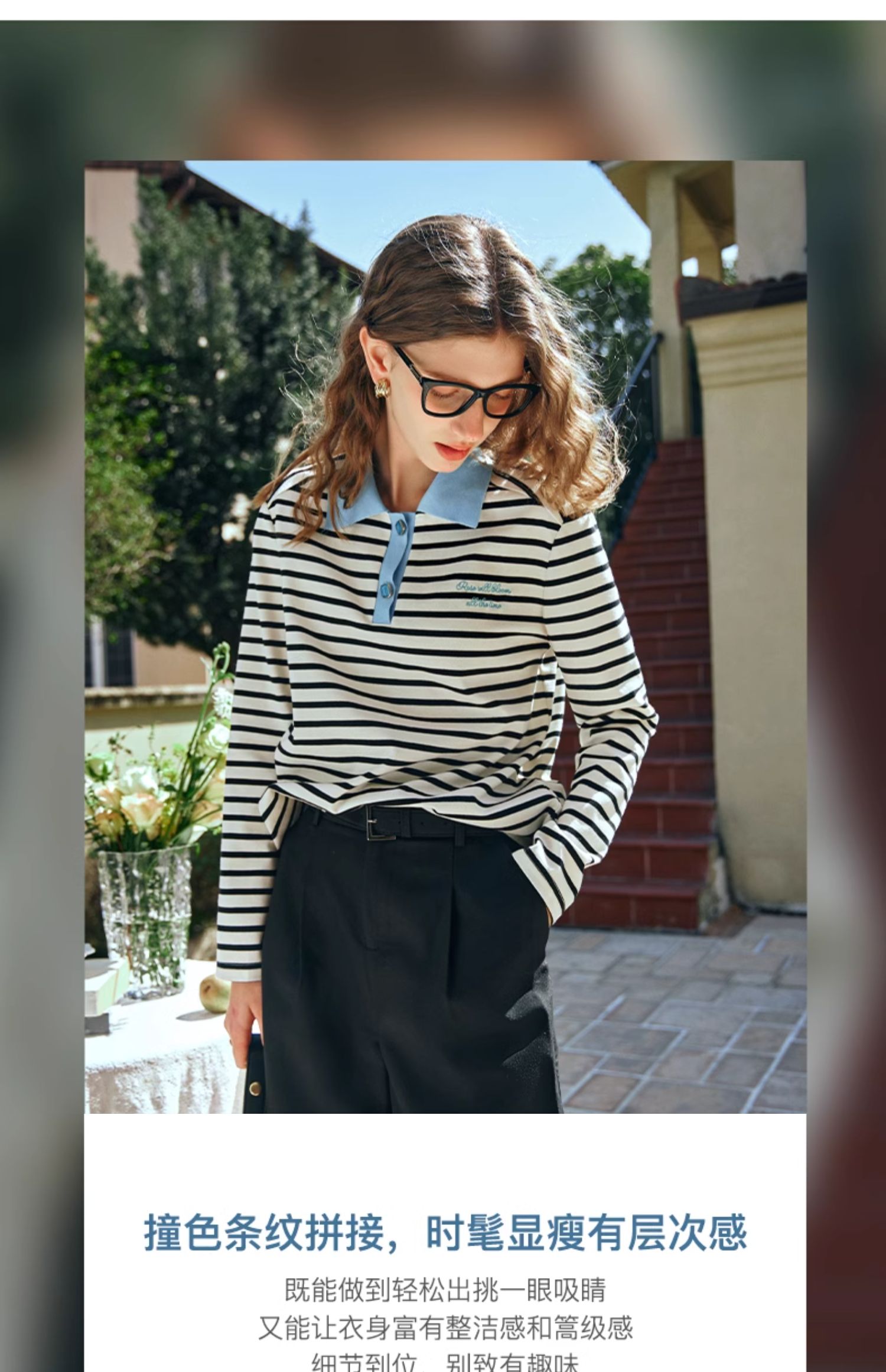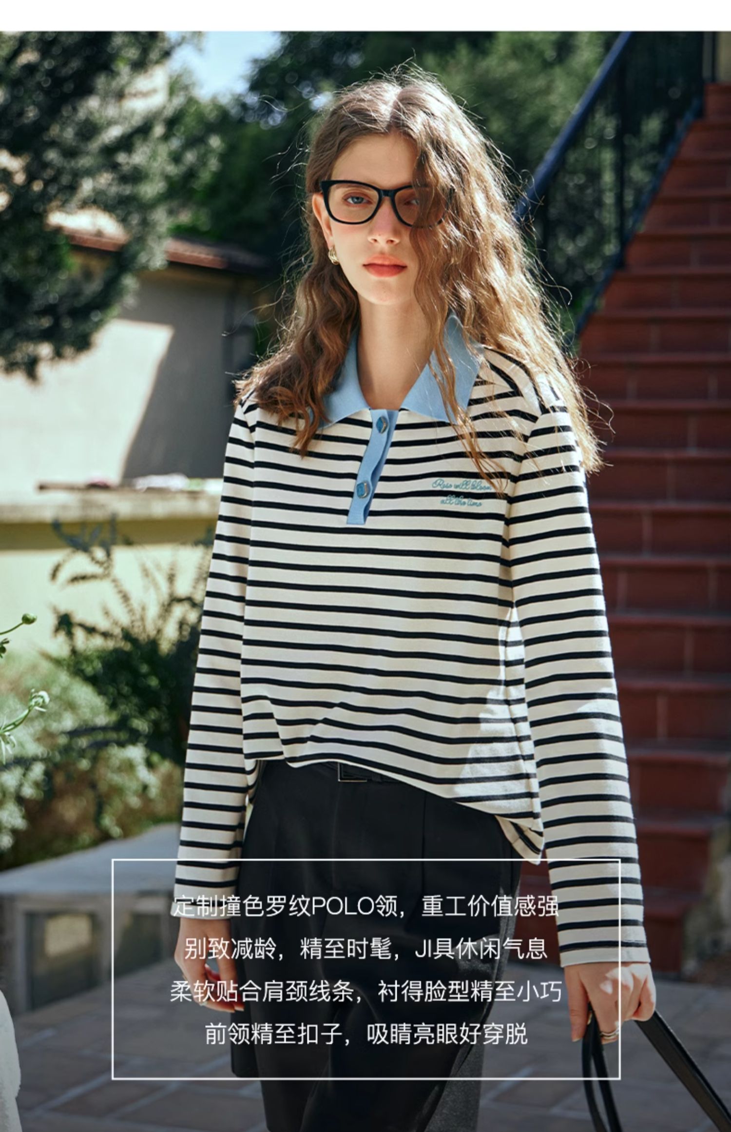 OLrain欧芮儿POLO领长袖T恤女早春2024年新款时尚宽松条纹上衣