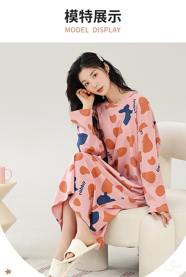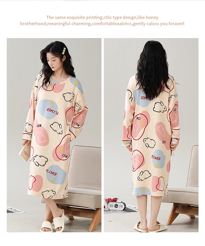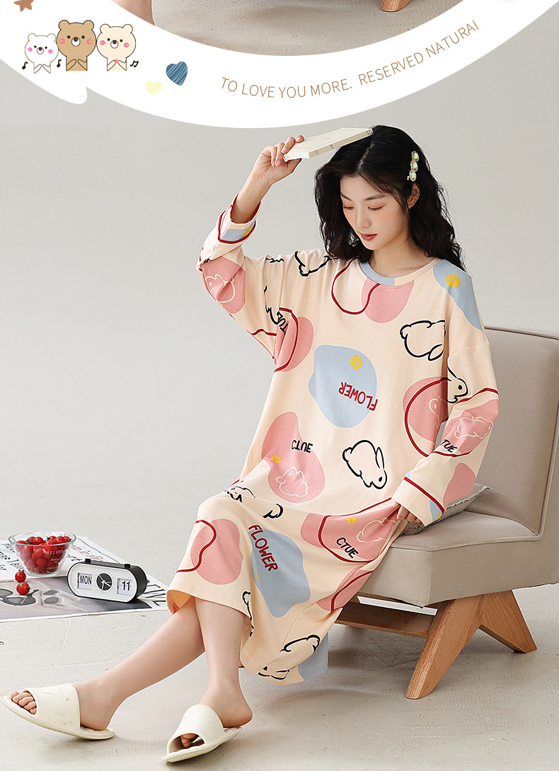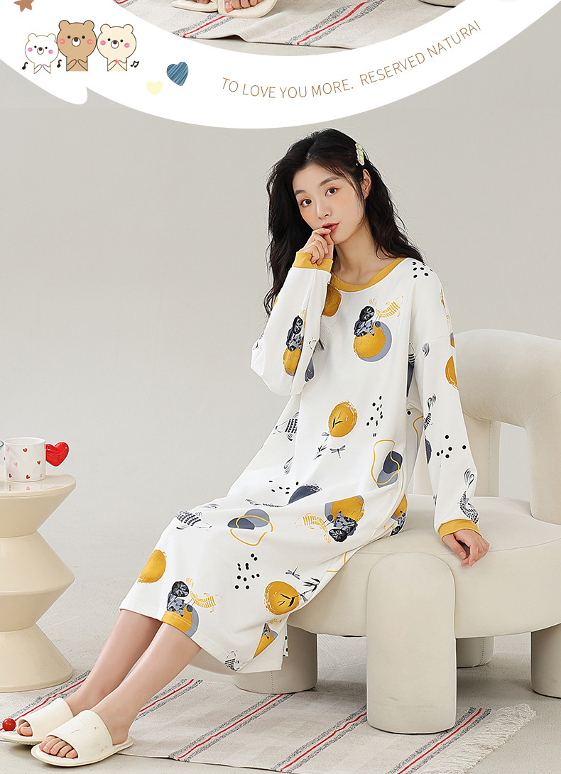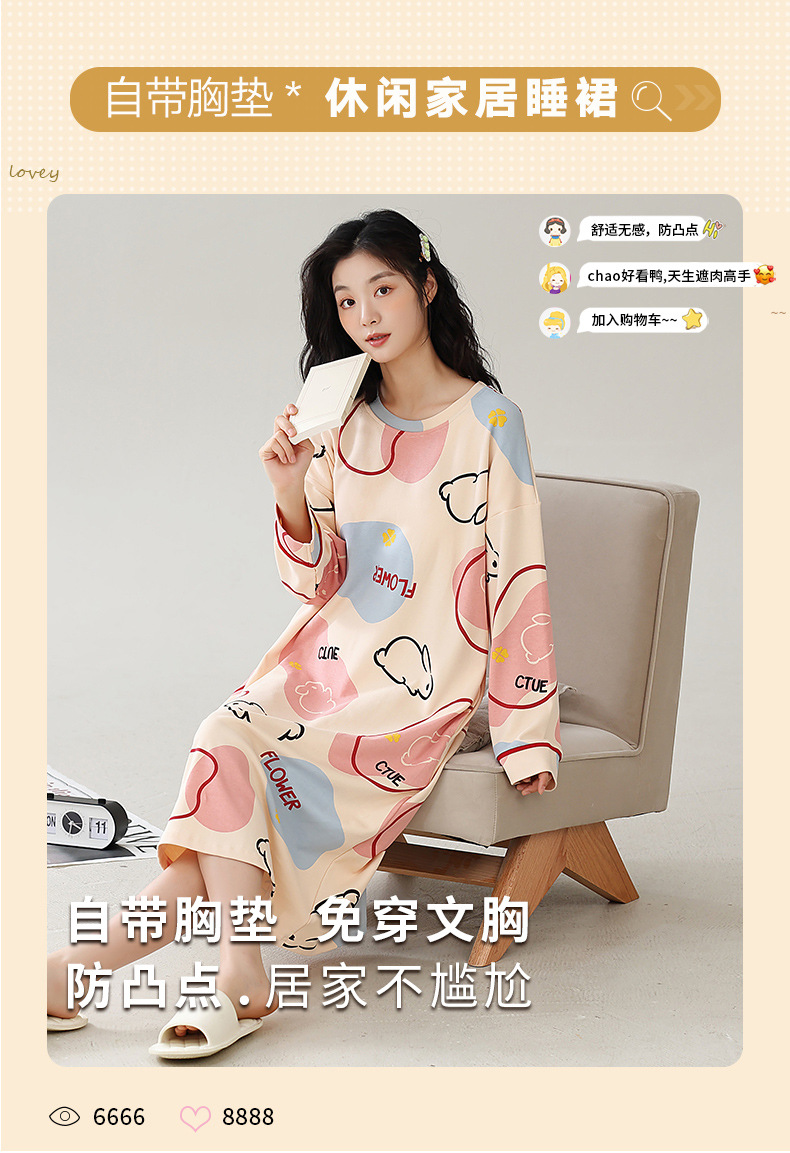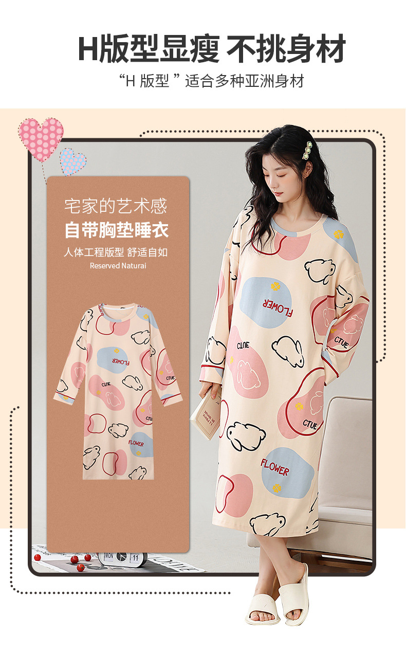 带胸垫长袖睡裙睡衣女秋季圆领卡通中长款宽松裙大码家居服可外穿